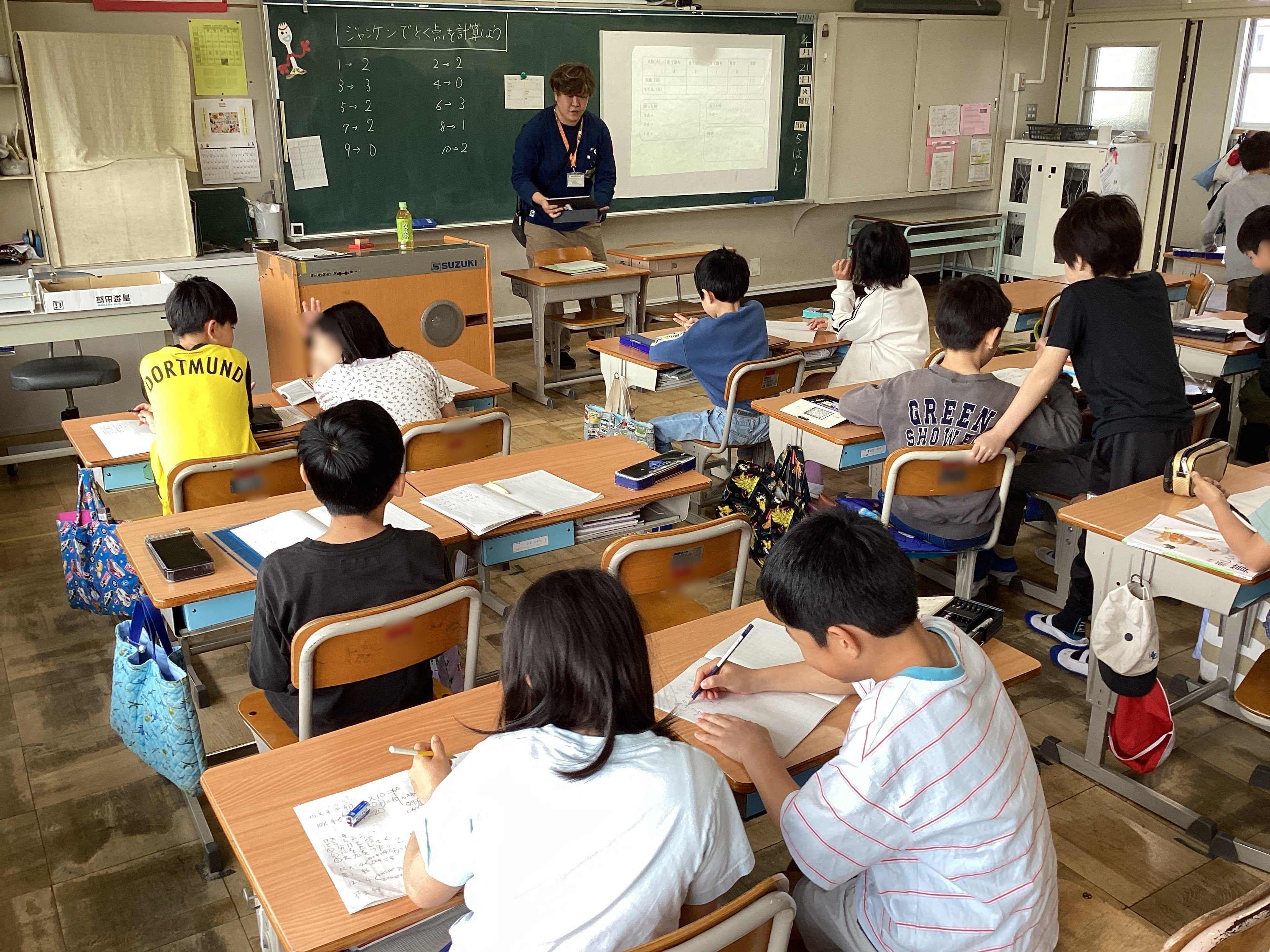 算数では、じゃんけんゲームを通して、その得点の合計をどのようにして計算すればよいのかを考える課題に取り組み、子どもたちは「~だから~という方法で計算すればいい!」「え?どういうこと?」「だから・・・。」という対話を通してみんなが納得できる方法を探索していました。