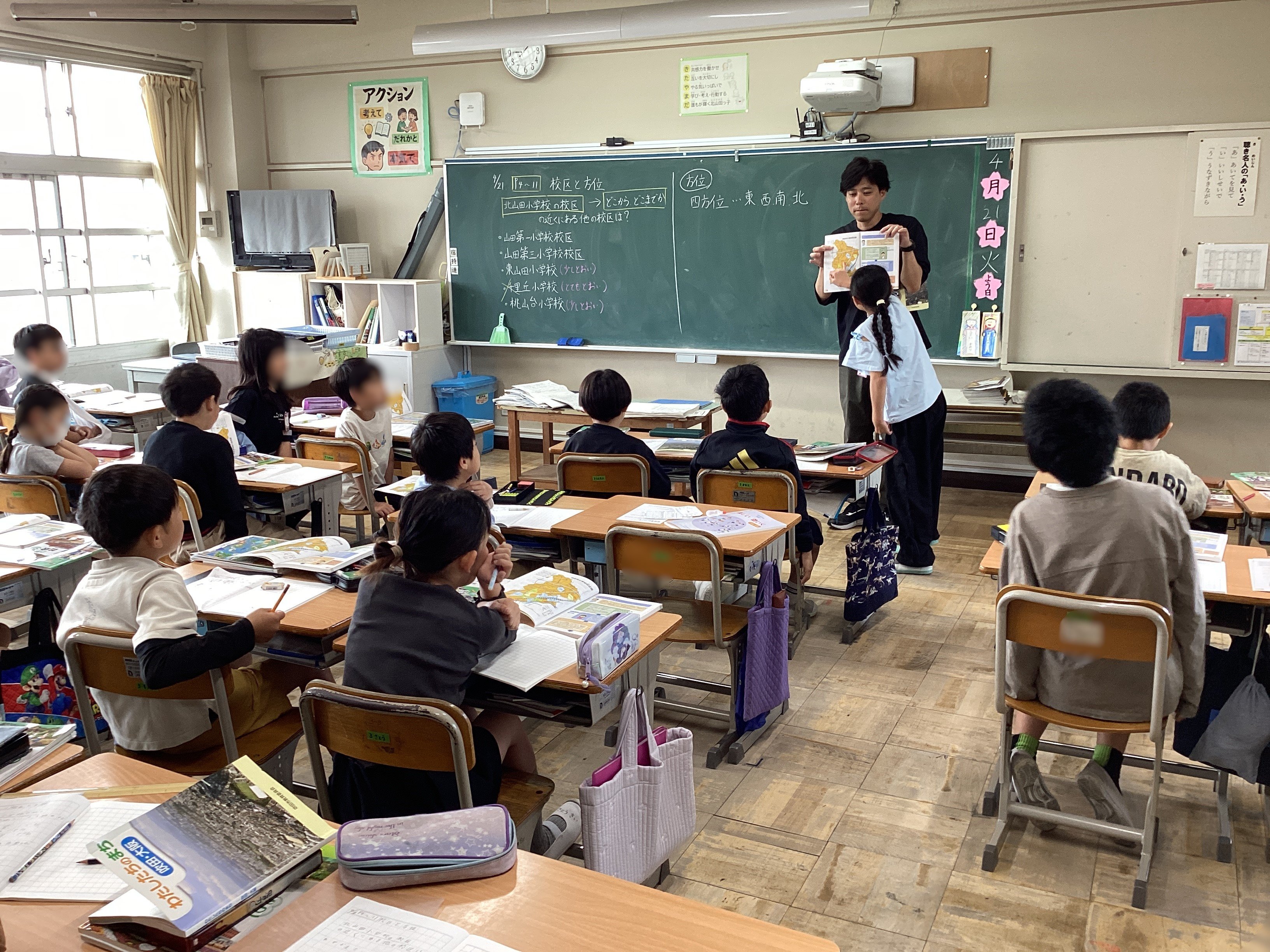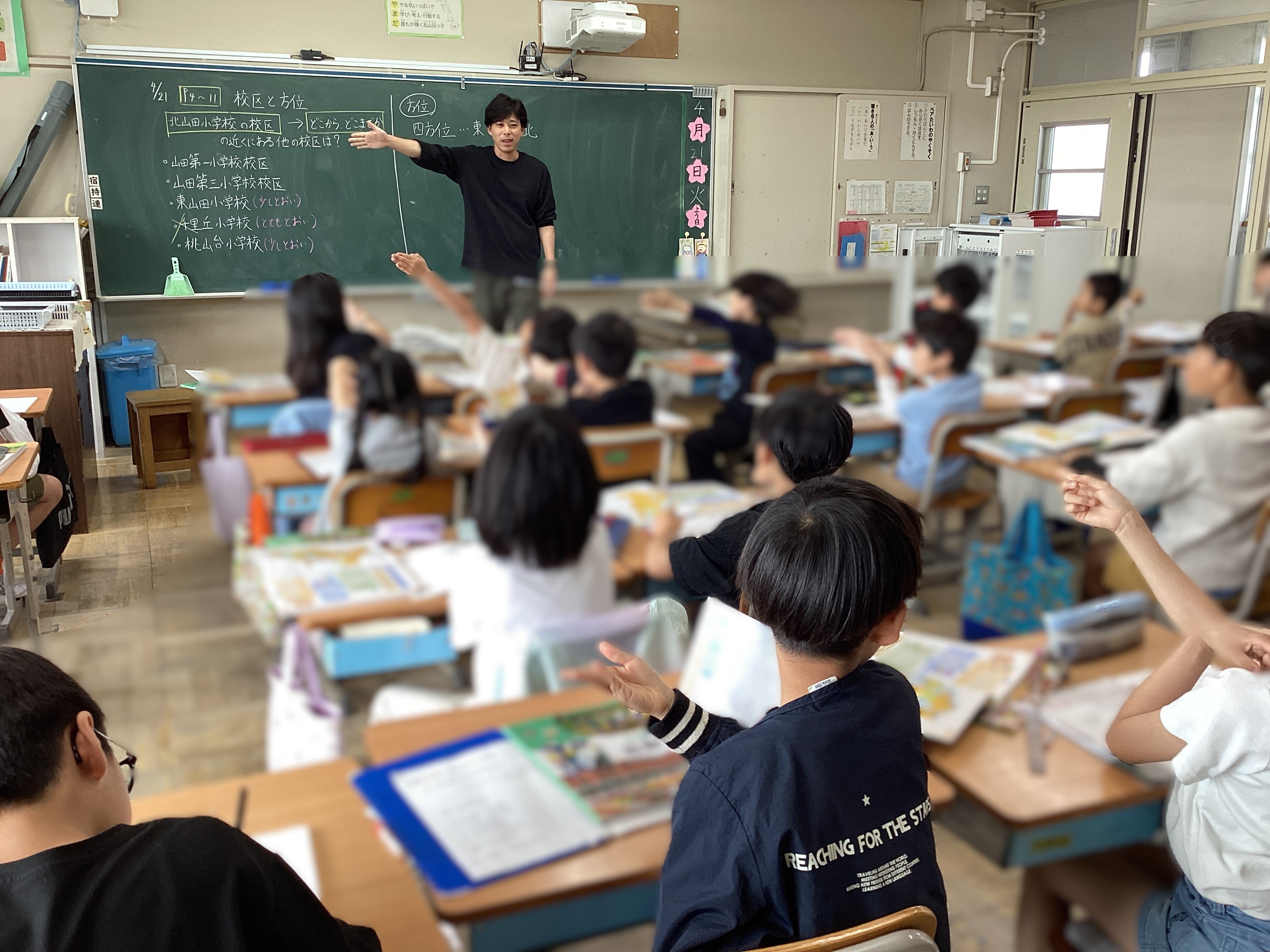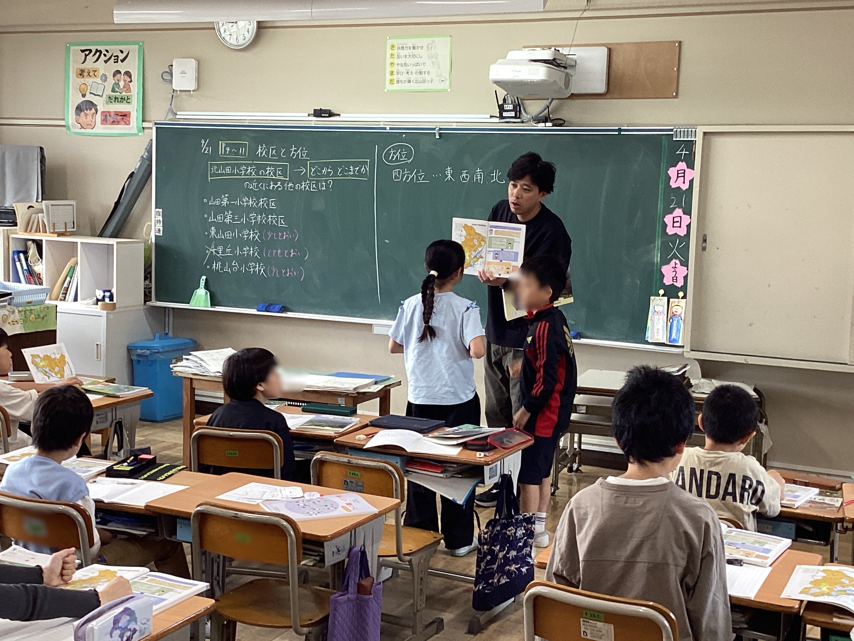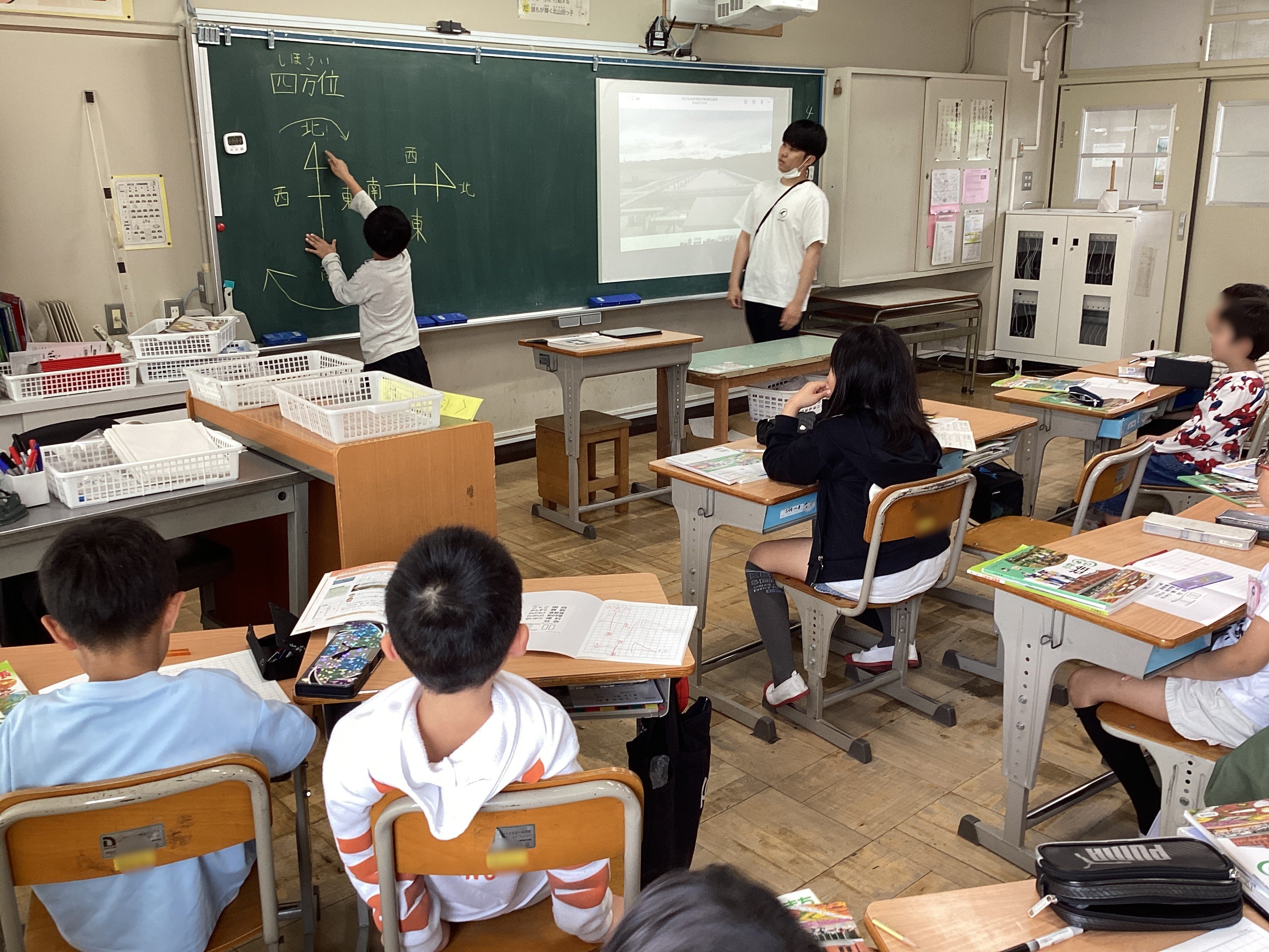 社会科では、四方位について、実際にどちらが北かということを子どもたちに考えさせる中で「~だから、こっちが北だと思います。」「え?でもさー。」「あ、そうか。じゃあ・・・。」という対話が繰り広げられる中、チャイムが鳴り、休み時間も子どもたちが考え続けるという展開に。学びは45分の授業で完結するものではありません。自分の生活とも関連させながら考え続けることで広がり、学ぶことが楽しくなるのです。