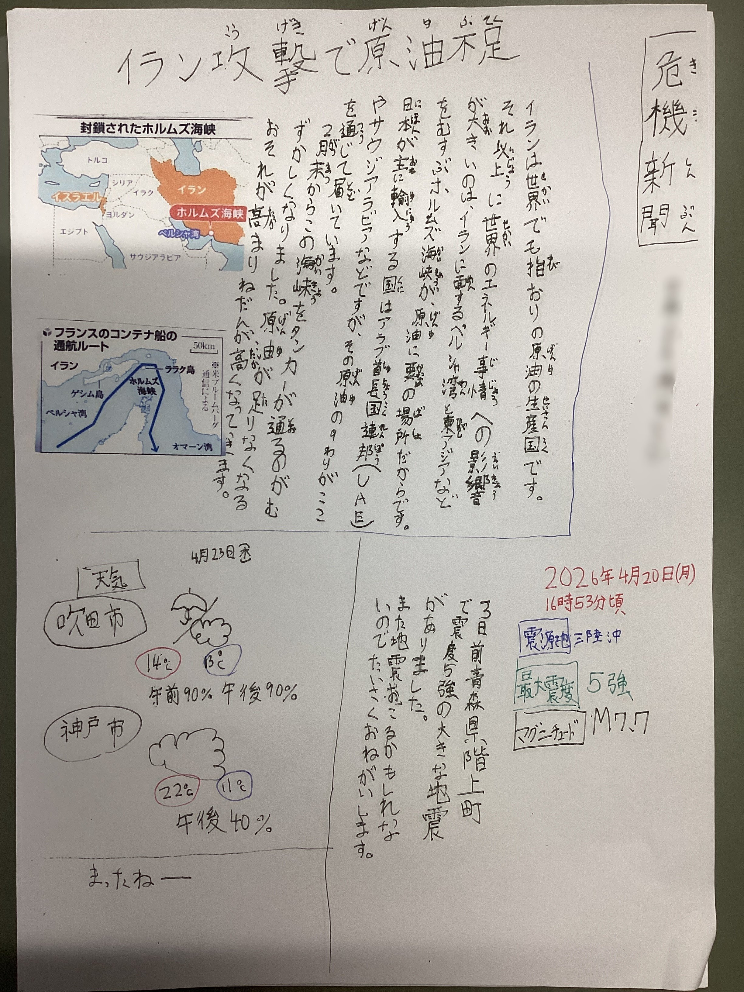 内容は時事問題。世界の情勢に関心を持ってほしいということと、地震が多いから気を付けて備えてほしいという思いが込められているようです。