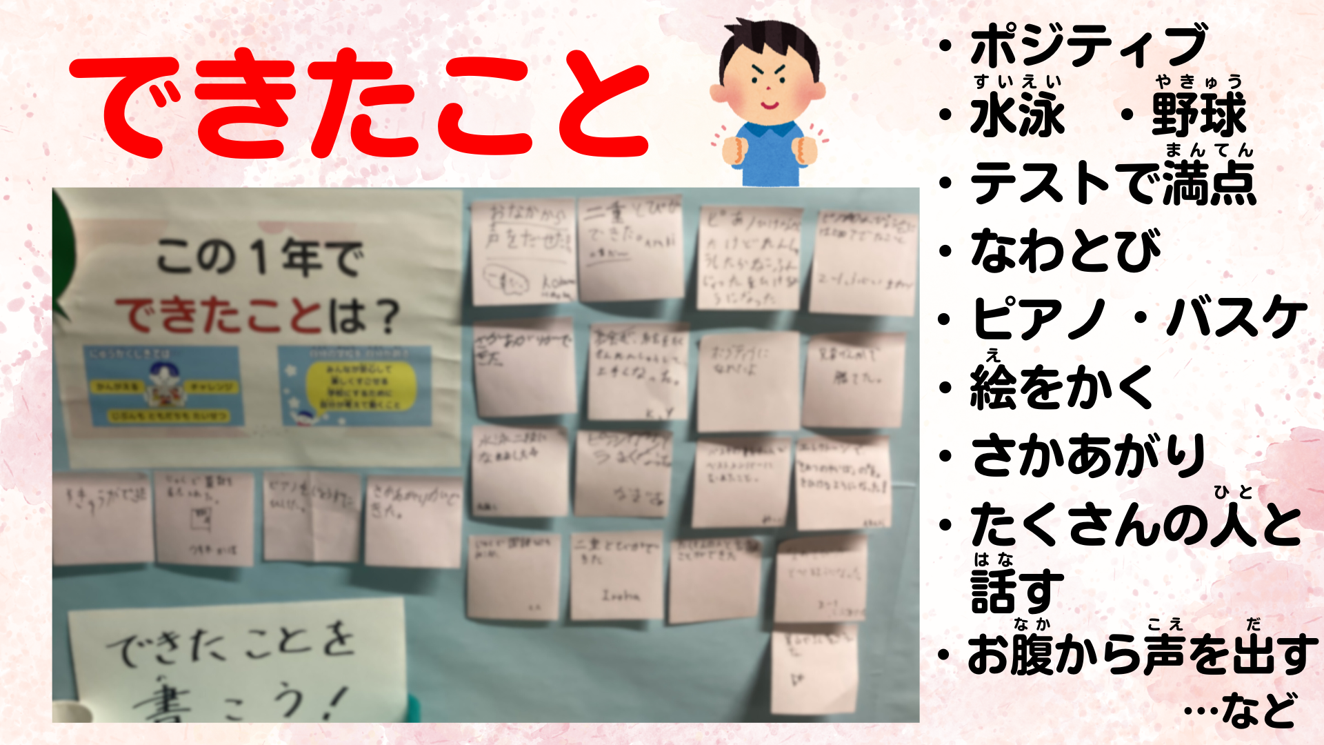 そして、3月の全校集会で伝えた「できたことをふりかえろう」ということについて、校長室前に貼ってくれた付箋に書かれている内容を紹介するとともに、あゆみの目的について子どもたちに問うと