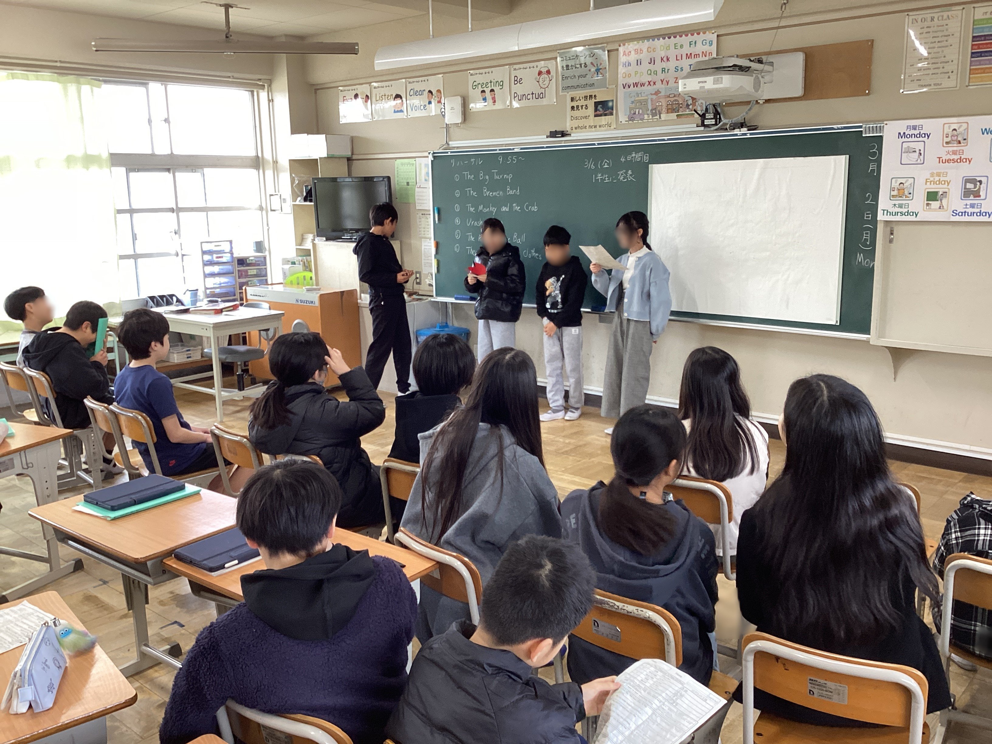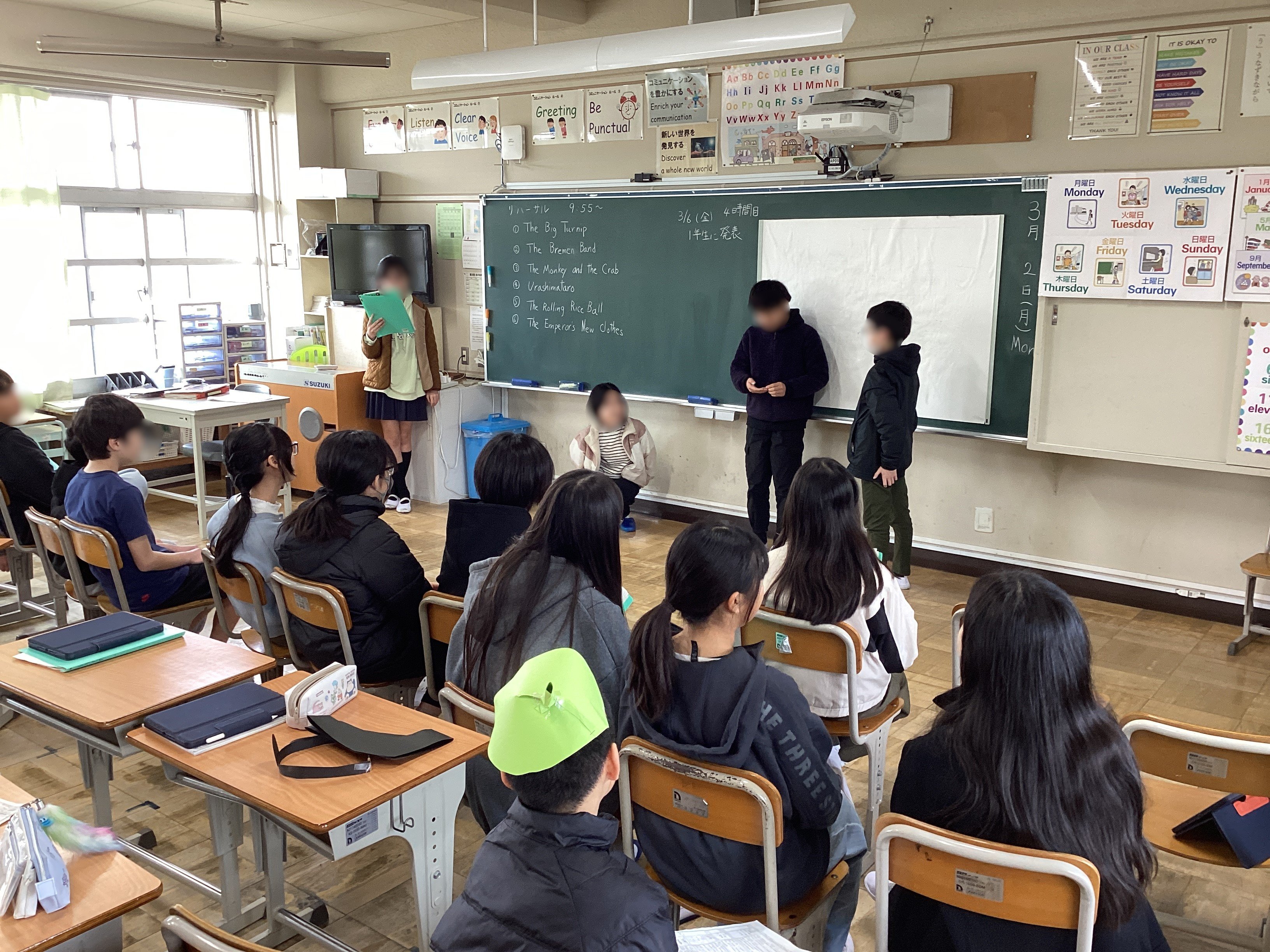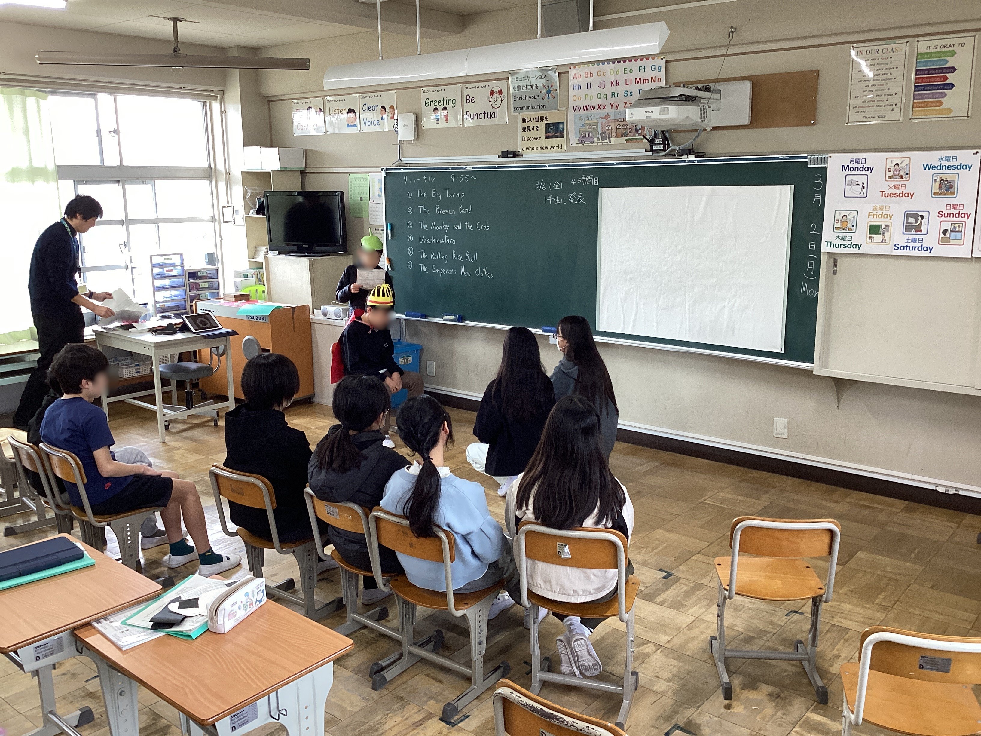 金曜日に6年生が「大きなかぶ」や「さるかに合戦」、「ブレーメンの音楽隊」などのお話を英語劇(日本語訳つき)にして1年生に見せるための練習だそうです。