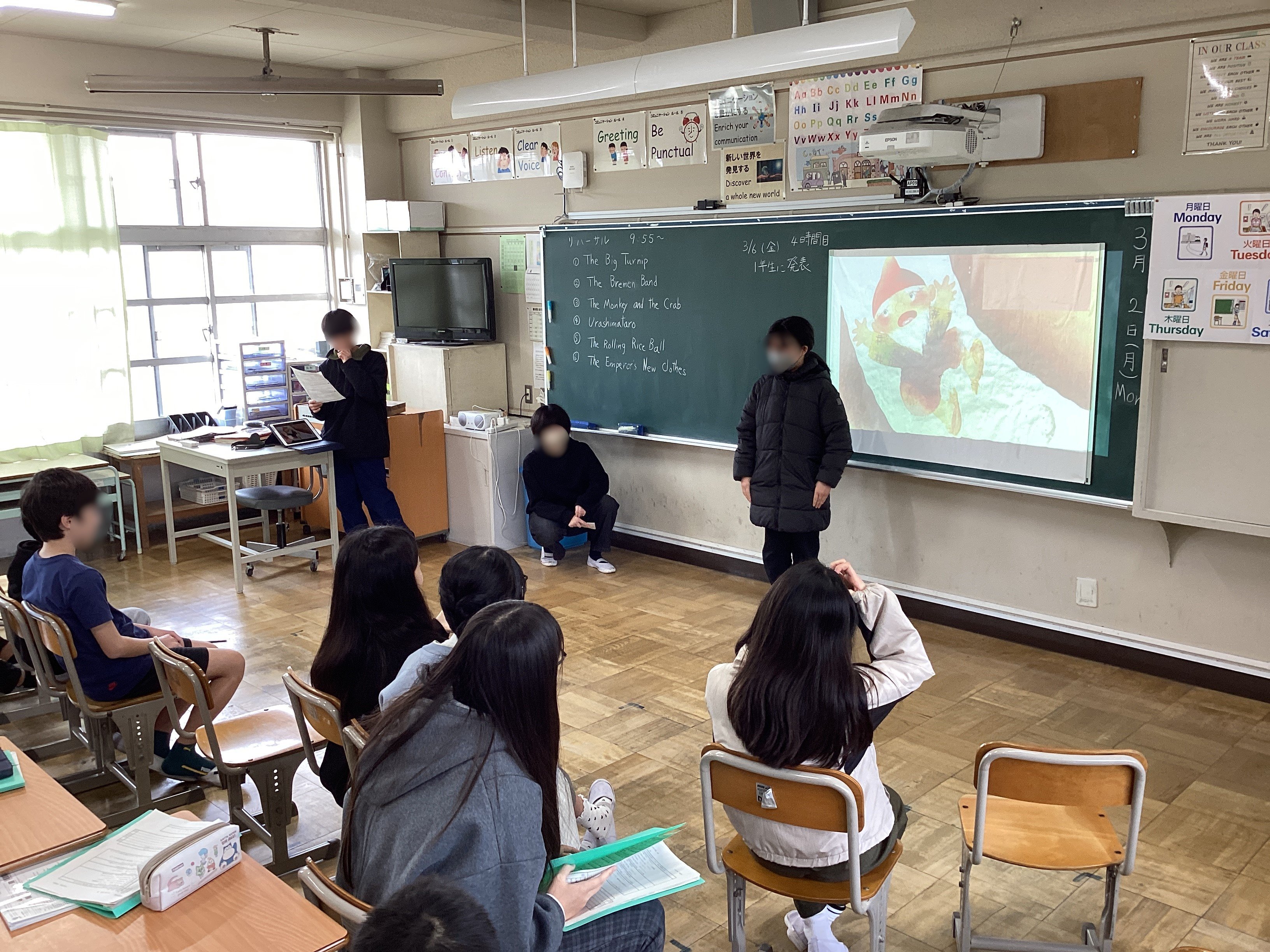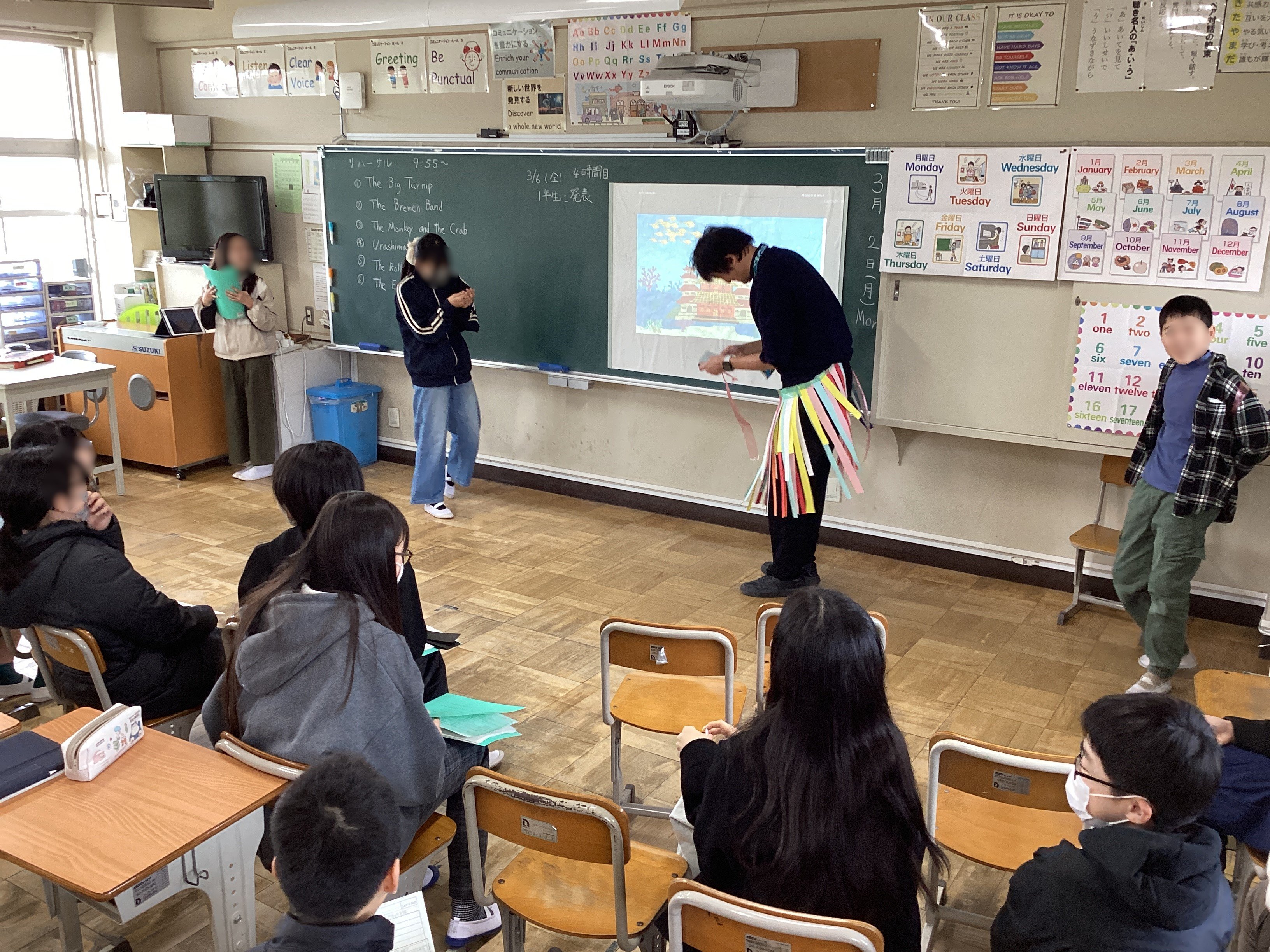 途中、急遽腹痛のために離席していた子が演じる予定だった乙姫を担当の先生が代役で演じてくれたのですが、さすが!声の抑揚や身振り手振りで豊かに表現。子どもたちの参考になったと思います。