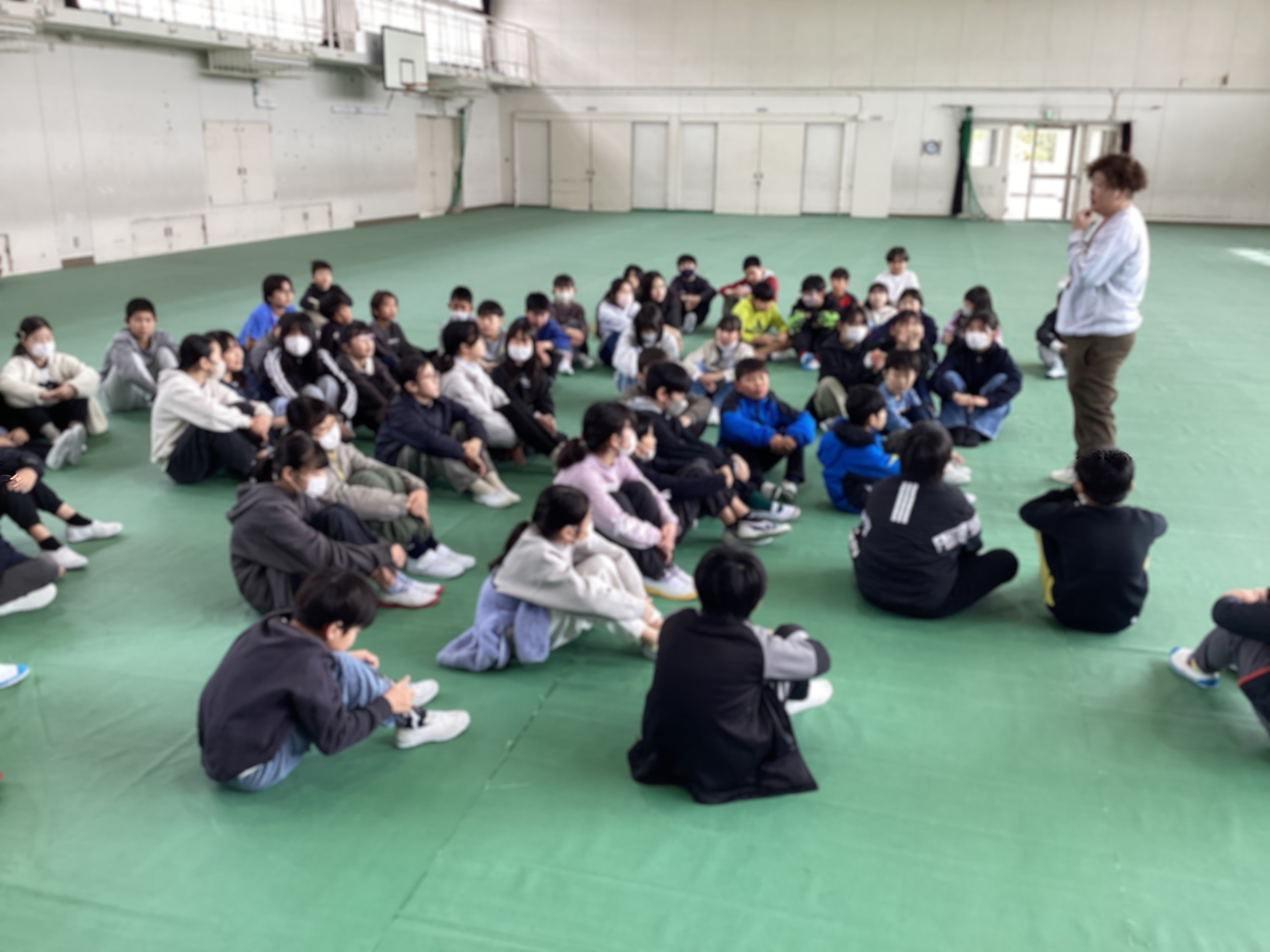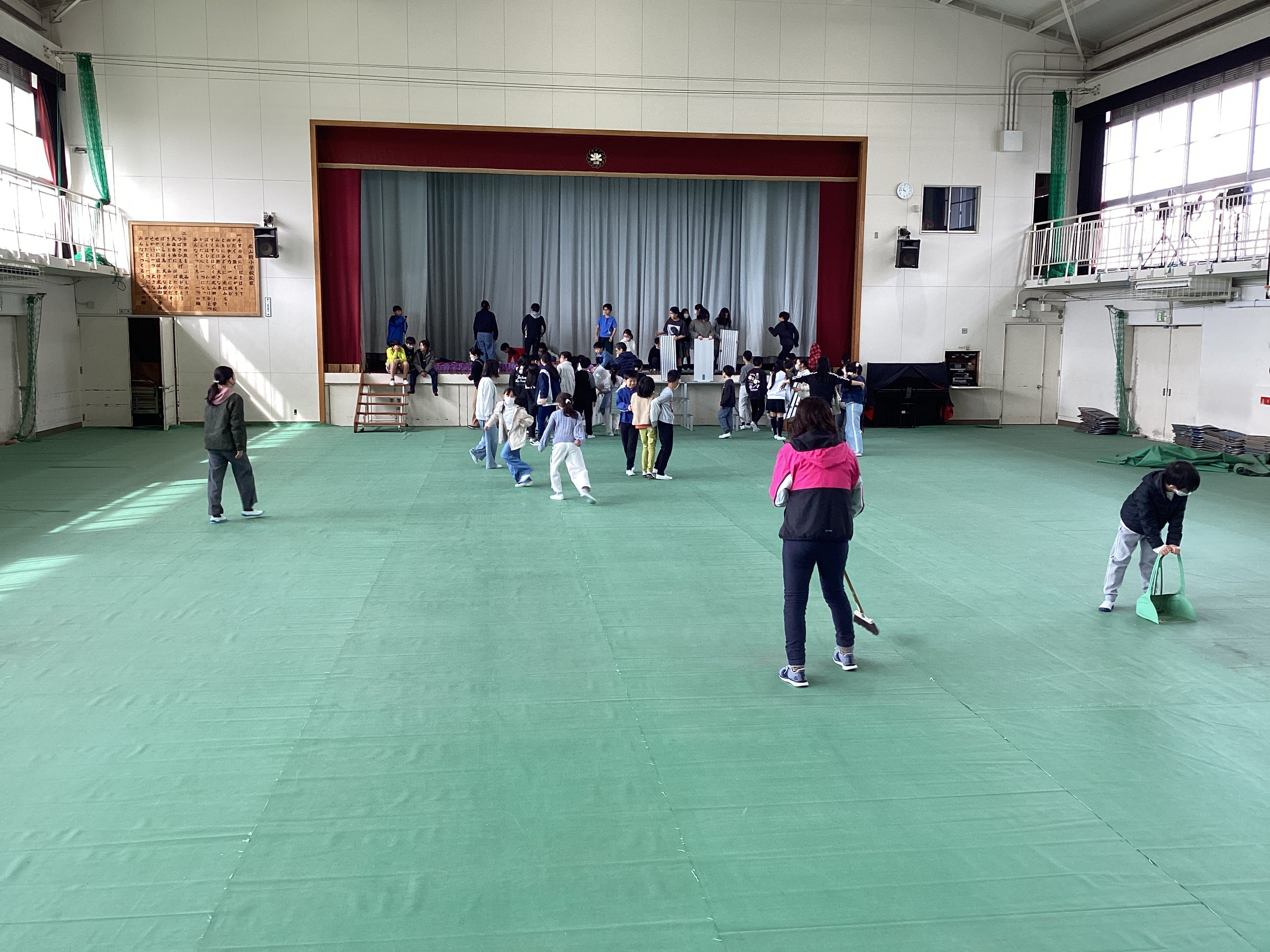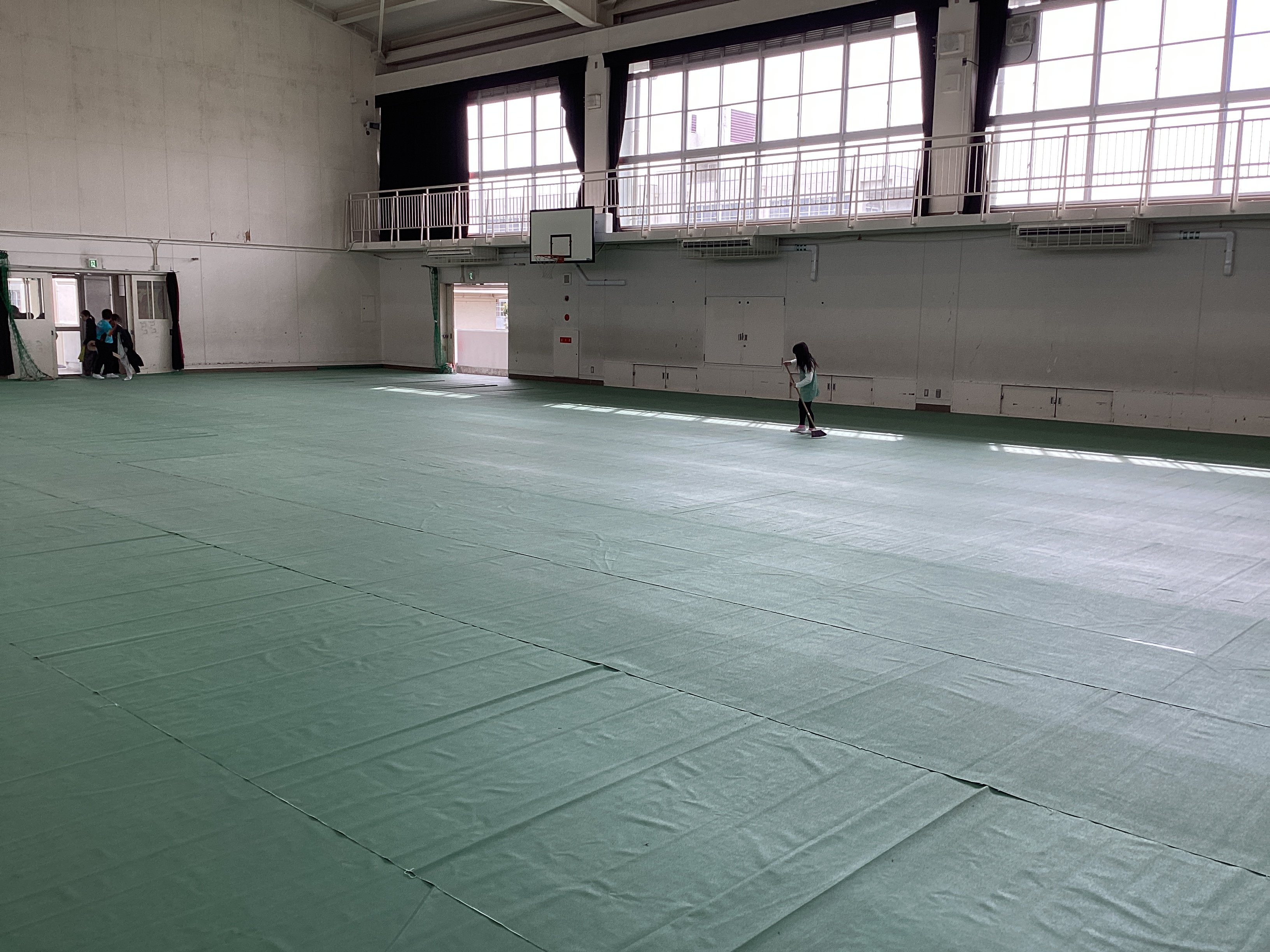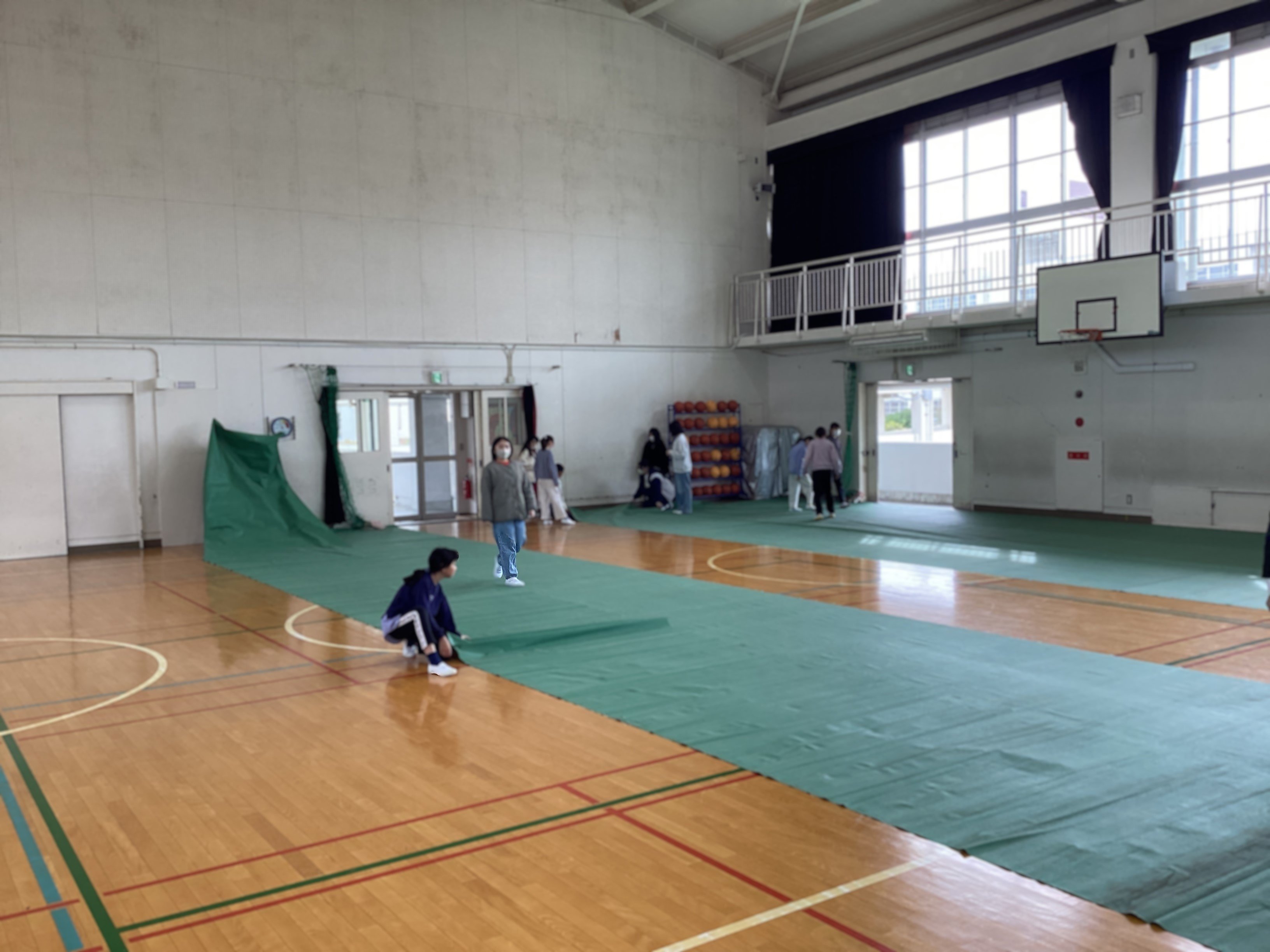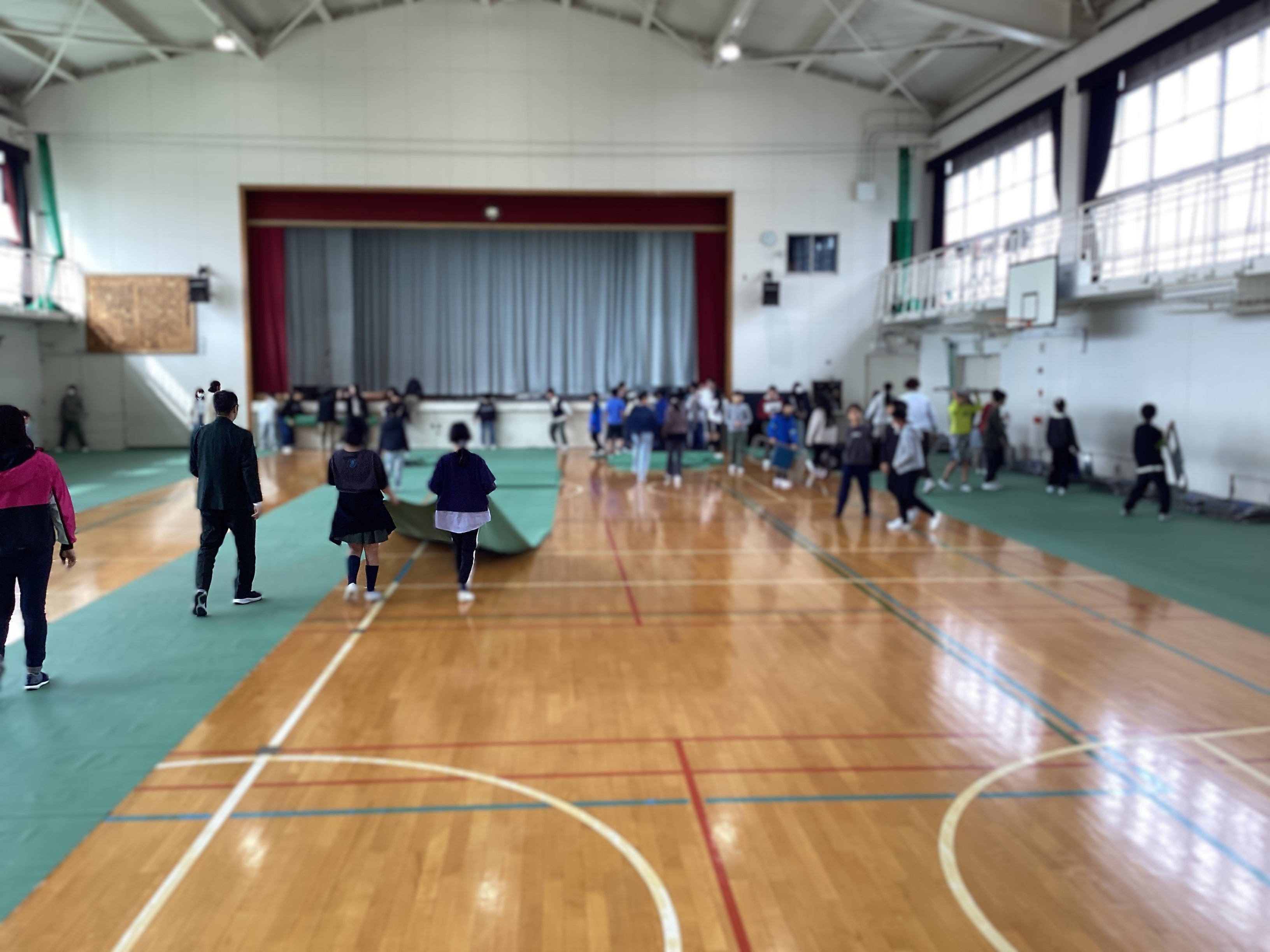 これから卒業式の練習や6年生を送る会を行うために、5年生が業間休みを使って体育館のシート敷きをしてくれました。