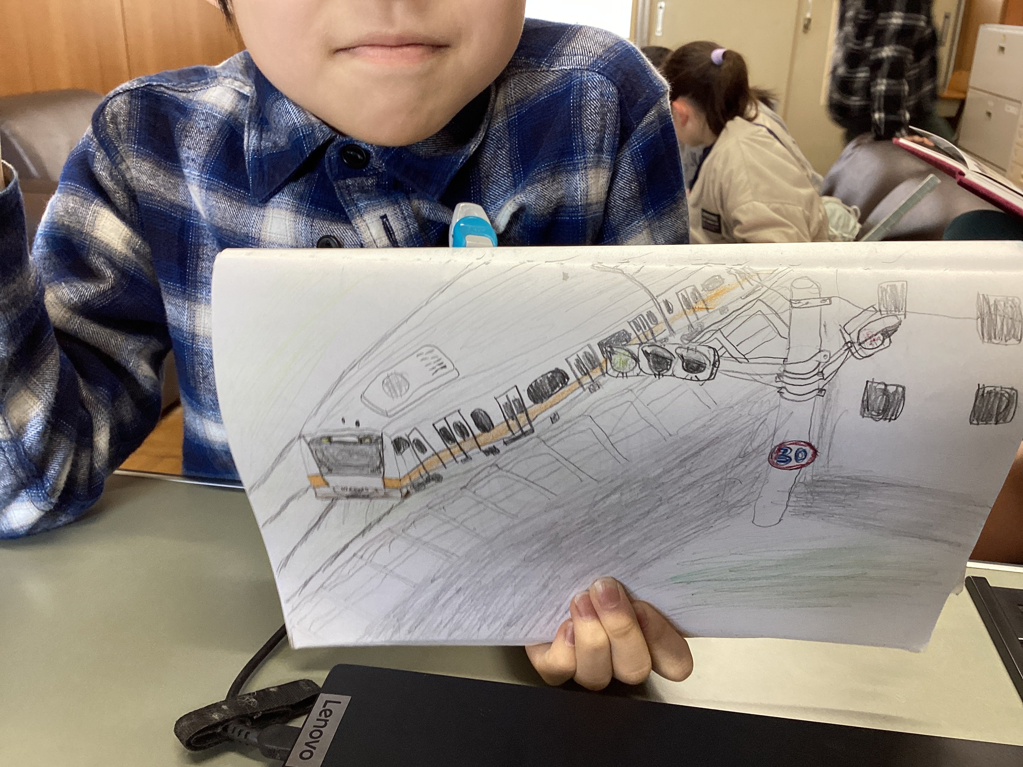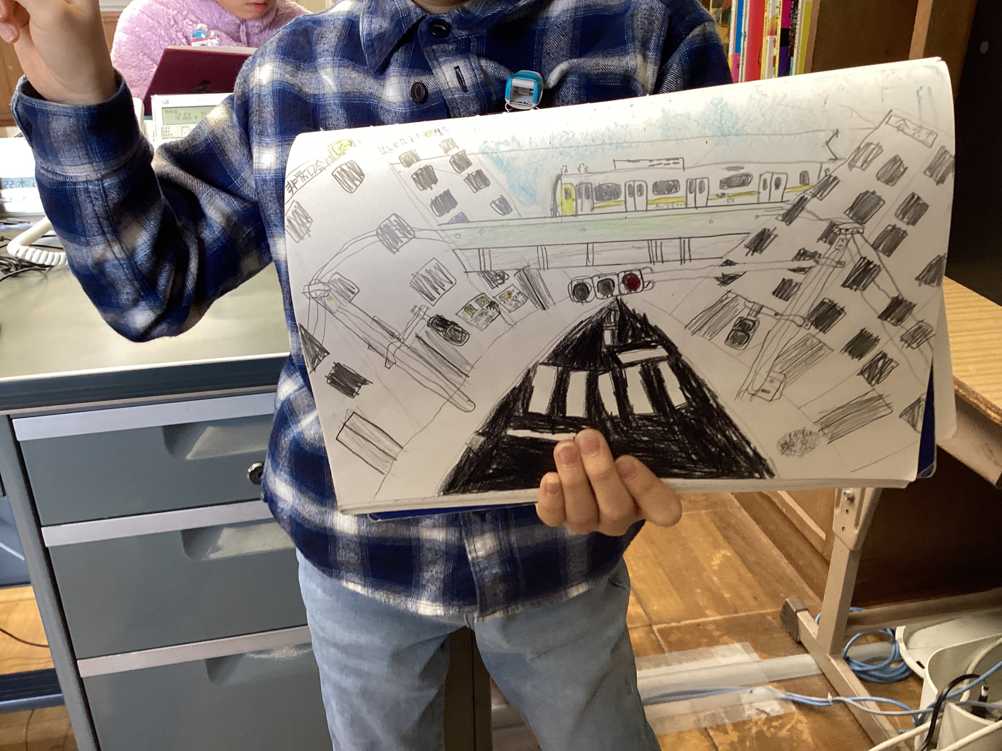 もう一枚のイラストは、高架を走る電車の斜め上からの視点で描かれています。そしてその下に信号機。2年生でこの角度から描けるのはすごい!