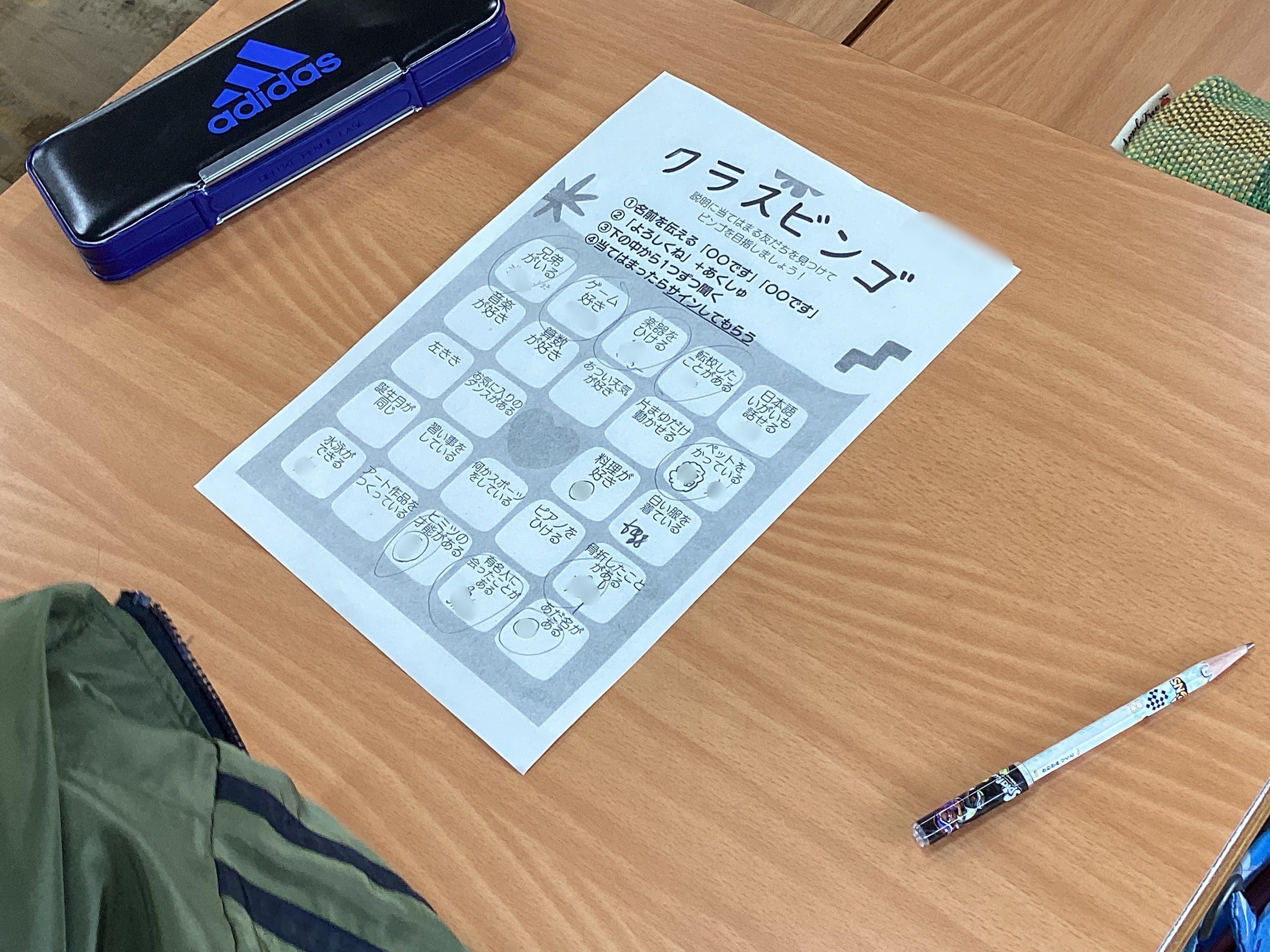 ビンゴのマスには「楽器をひける」「ペットをかっている」などが書かれていて、たくさんのクラスメイトと対話しながら当てはまる友だちがいたらマスにサインしてもらい、ビンゴをねらうというもの。