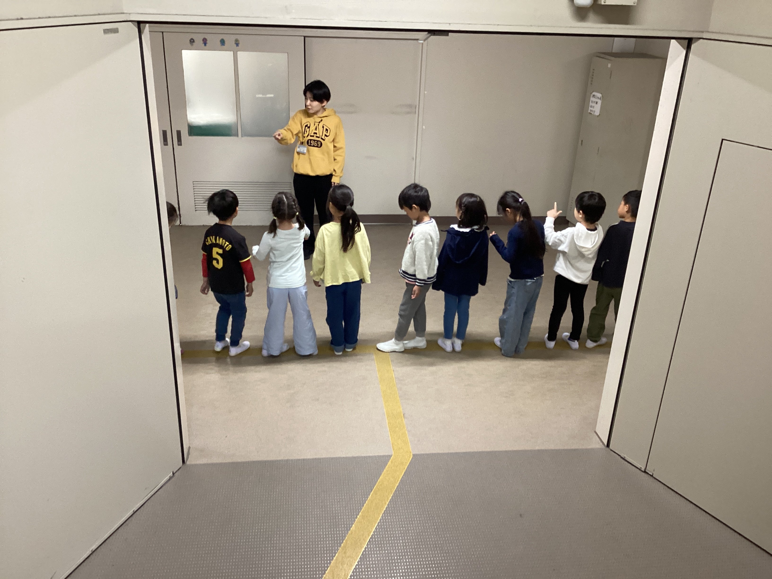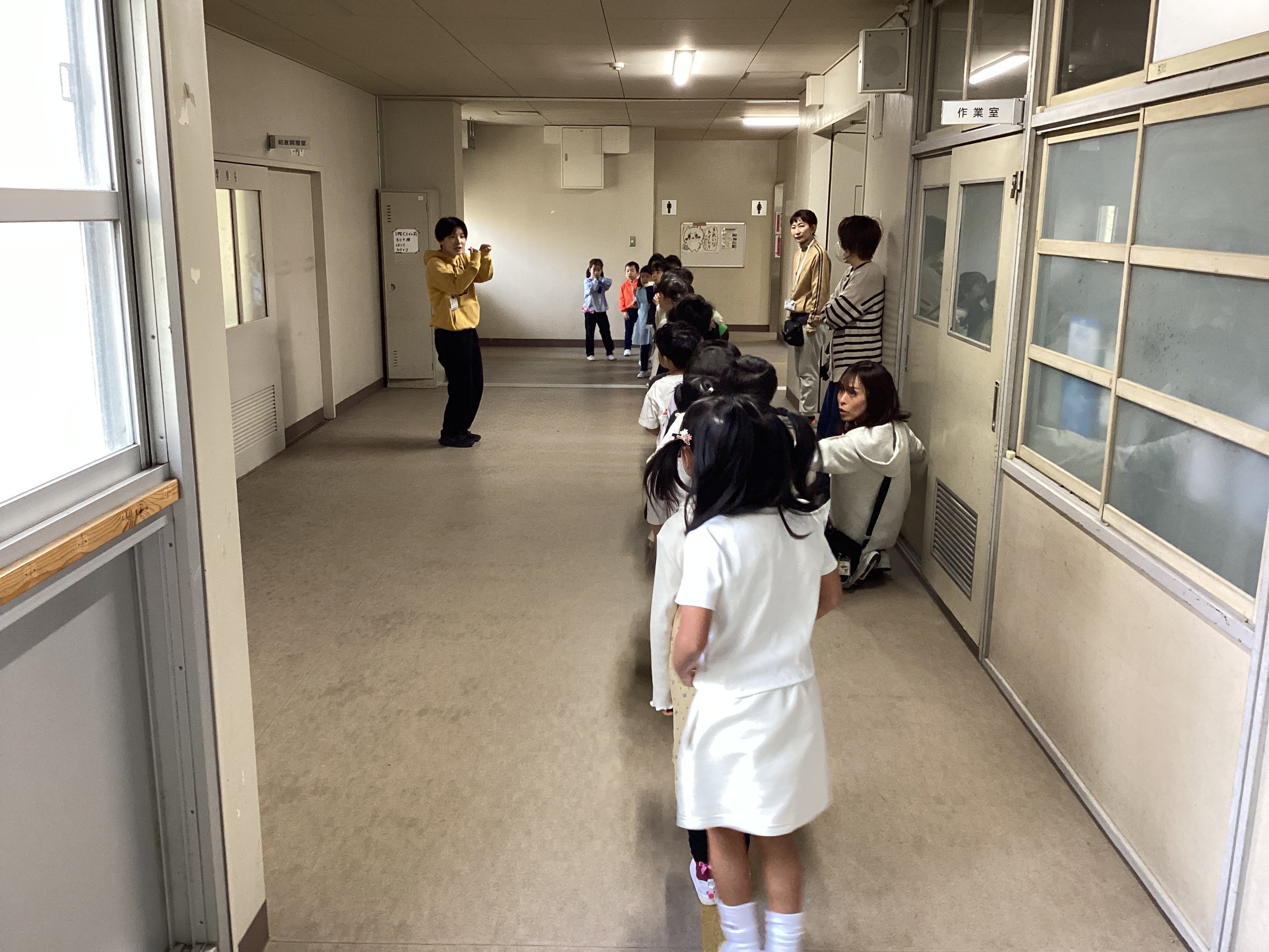 2時間目の時間帯に1階へ降りていくと、廊下に1年2組の子どもたちがいました。どうやら学校の中を探検しているようです。