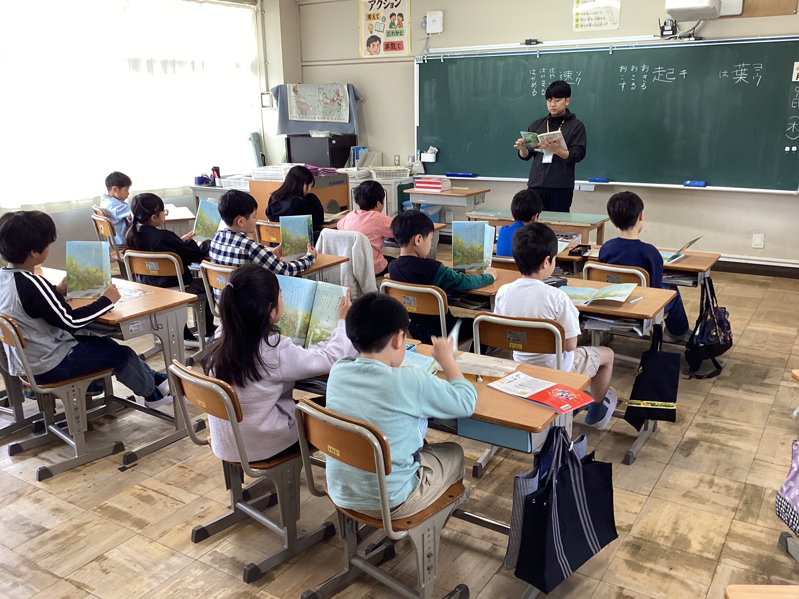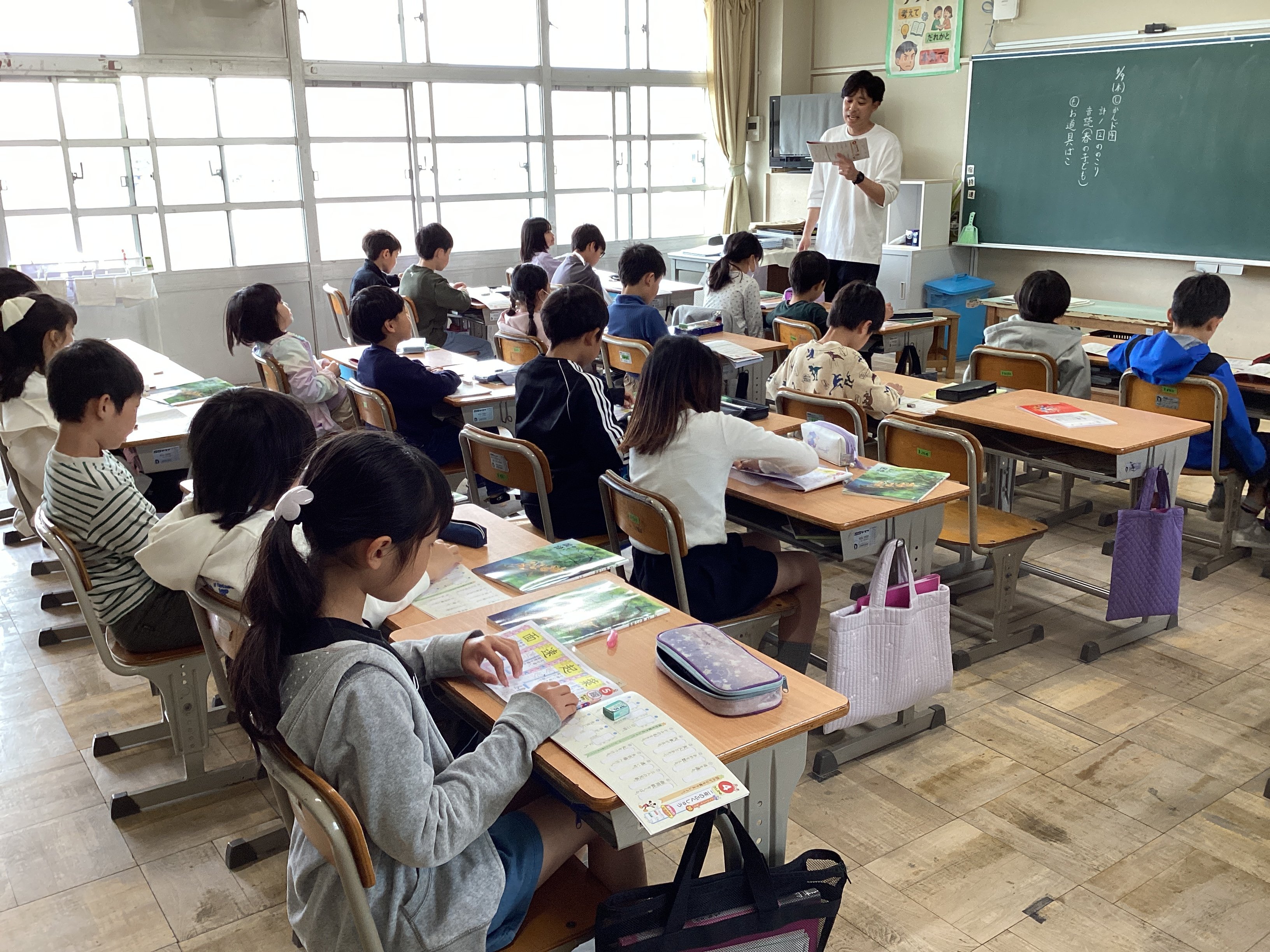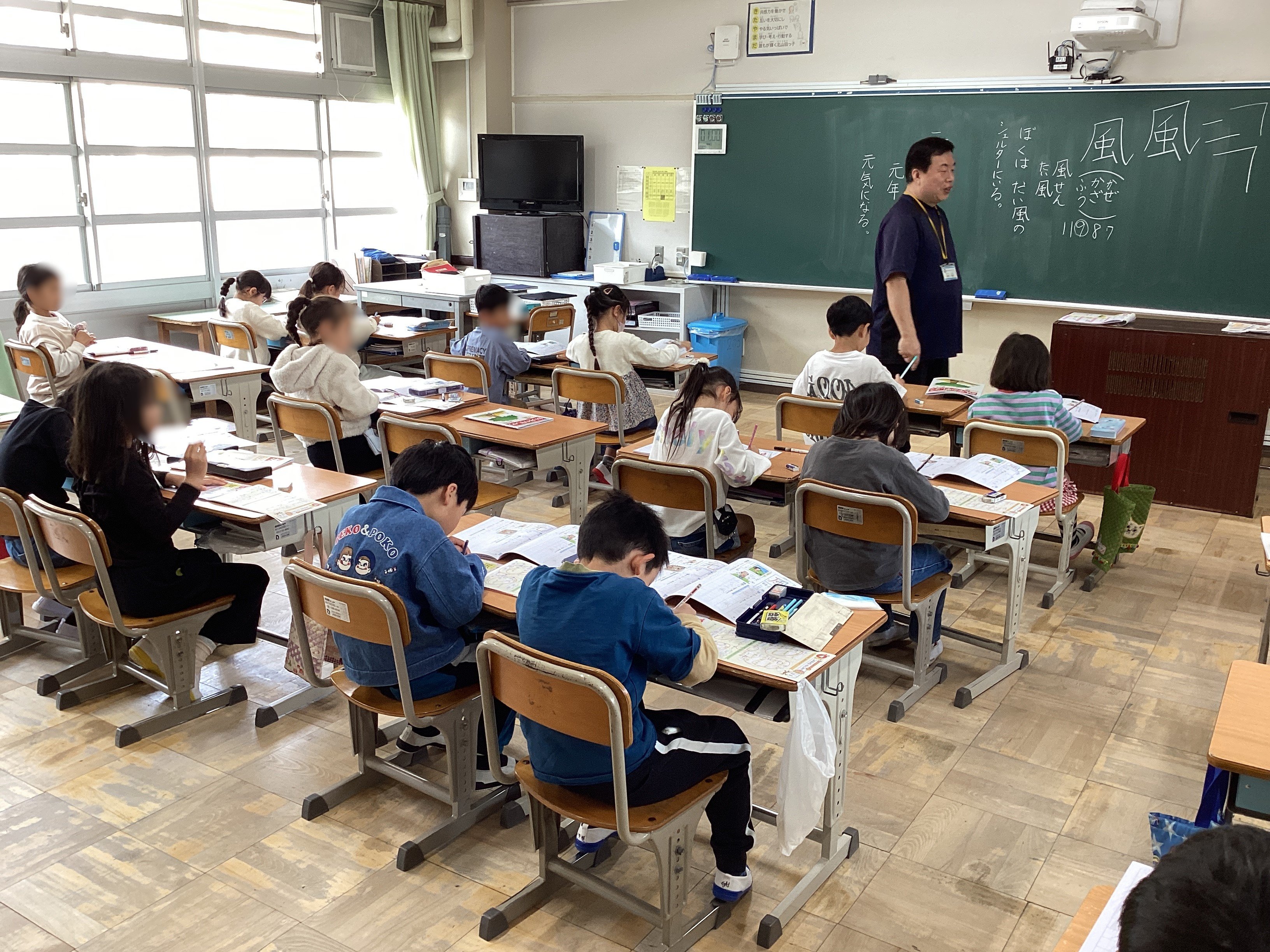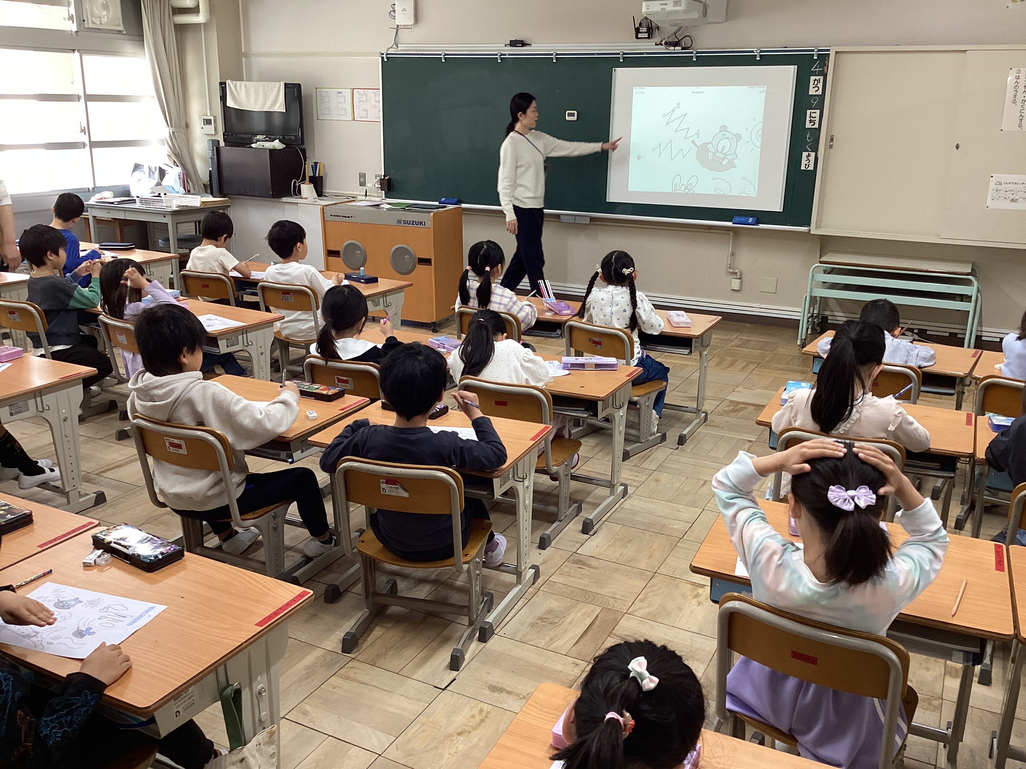 そして隣の2年1組を覗くと、静かに漢字の学習に取り組んでいました。担任の先生は集中して取り組んでいる子どもの姿を褒めながら、その中でもさらに良い姿(下敷きを敷いている)が見られる子をピックアップし、何が良いのかクイズ形式で子どもたちに考えさせる工夫をしていました。子どもたちからは、どんどんその子たちの良いところ(背筋が伸びている、鉛筆を持っていない方の手をノートの上に置いている、丁寧に書いている...等)が出てきます。お互い認め合えるっていいですね。その後、僕は教室から出てしまったので、正解が出たのか分かりませんが、クイズ形式にすることでお互いの良いところをたくさん見つけることができていいなぁと思いました。