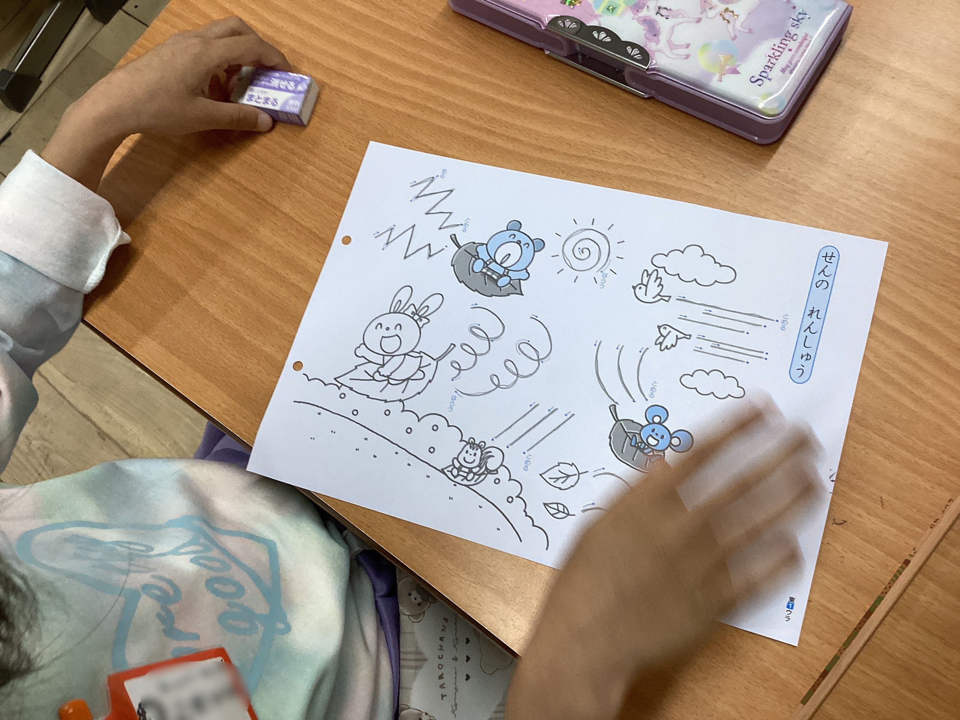 そして、1年1組の教室に行くと、ギザギザ、なみなみ、グルグル、まっすぐなど様々な線のなぞり書きで運筆の練習をしていました。担任の先生に姿勢や鉛筆の持ち方を褒めてもらいながら、やる気満々で取り組む姿はとても可愛らしかったです。