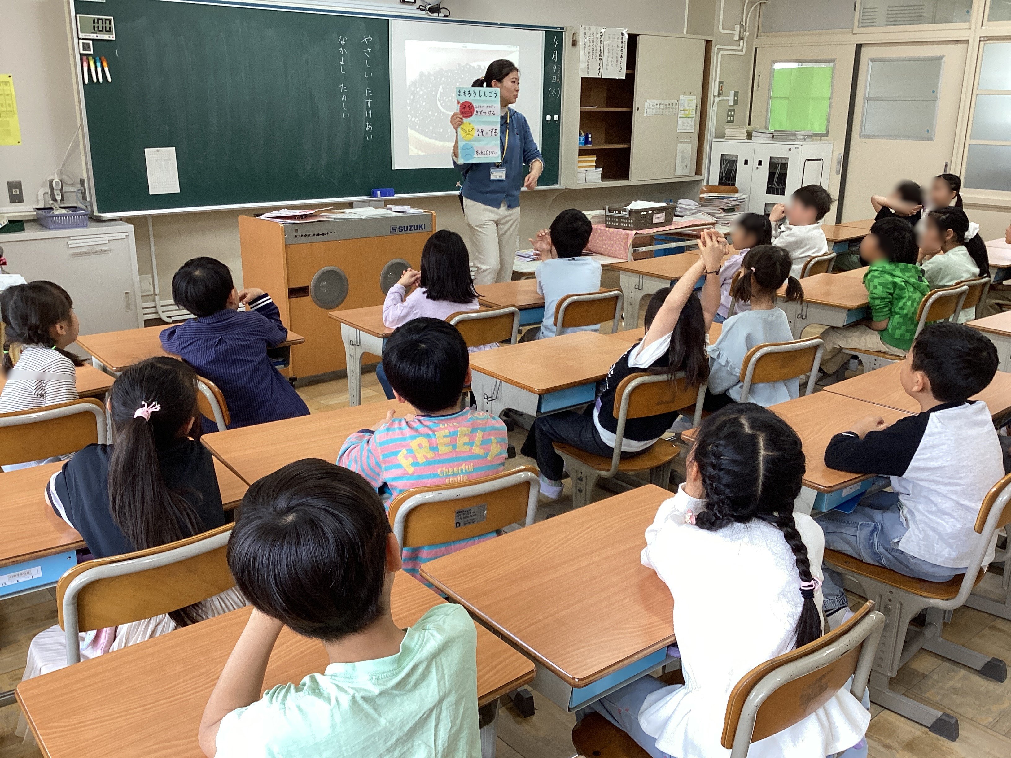 一つ上の階に上がり、2年2組の教室を覗くと、担任の先生が信号機の絵を示しながら子どもたちにしてほしくないことを話していました。赤信号は「心や体を傷つけること」、黄信号は「うそをついたり、ずるをしたりすること」、青信号は「チャレンジしないこと」だそうです。初めに先生がどんなことは許さないのか、どんなことを大切にしているのかを子どもたちに伝えることは大切ですね。