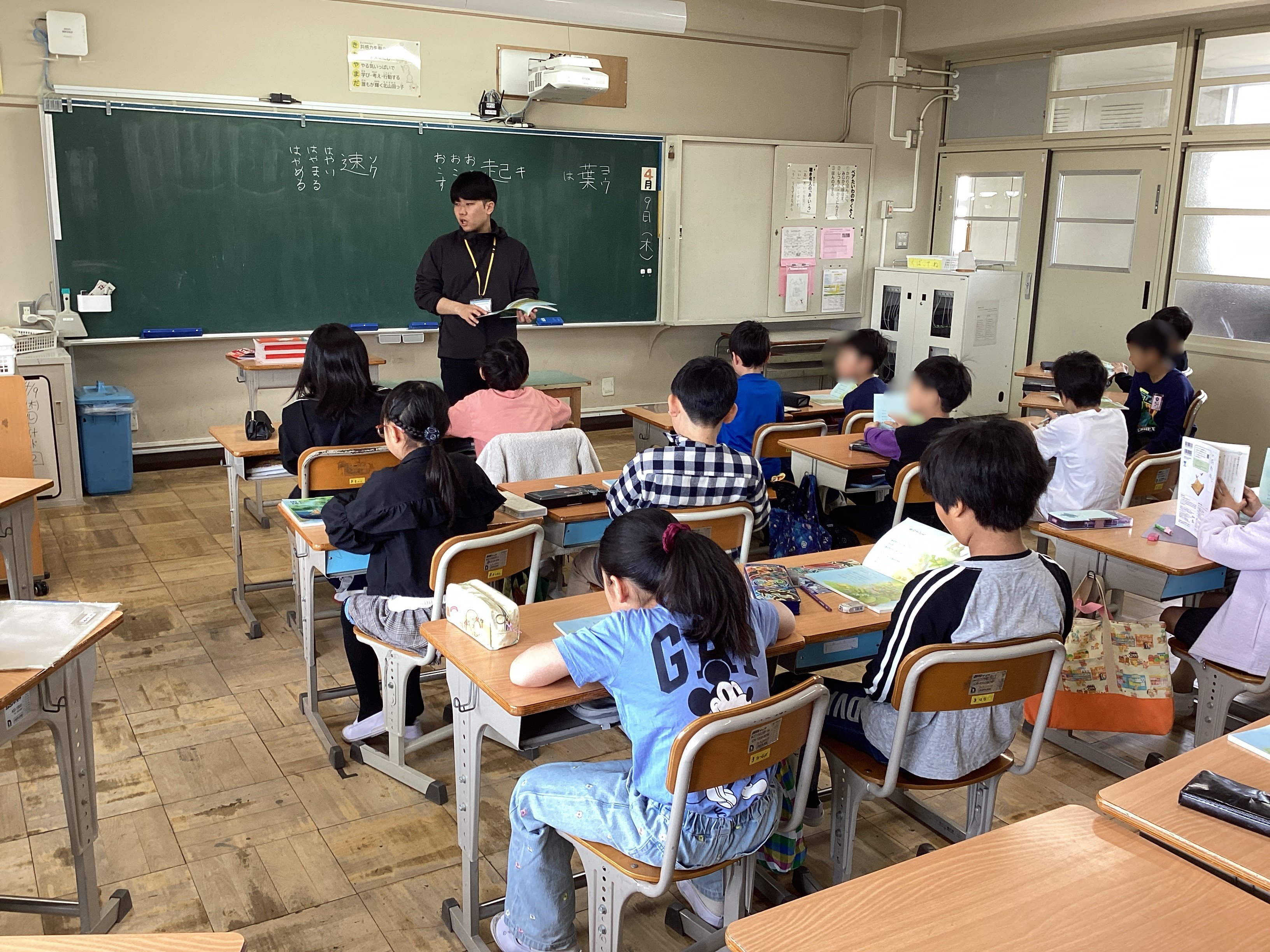 次は3年生。3組も2組も国語でした。漢字の学習では、新出漢字を使った言葉を子どもたちに問い、出てきた言葉の意味をさらに子どもたちに問うていました。そのやり取りをする中で、「聴く」ことをしっかりできている子を褒めたり、子ども同士をつなげたりしながら「学ぶ集団」として大切なことを体験的に学べるよう工夫されていました。
