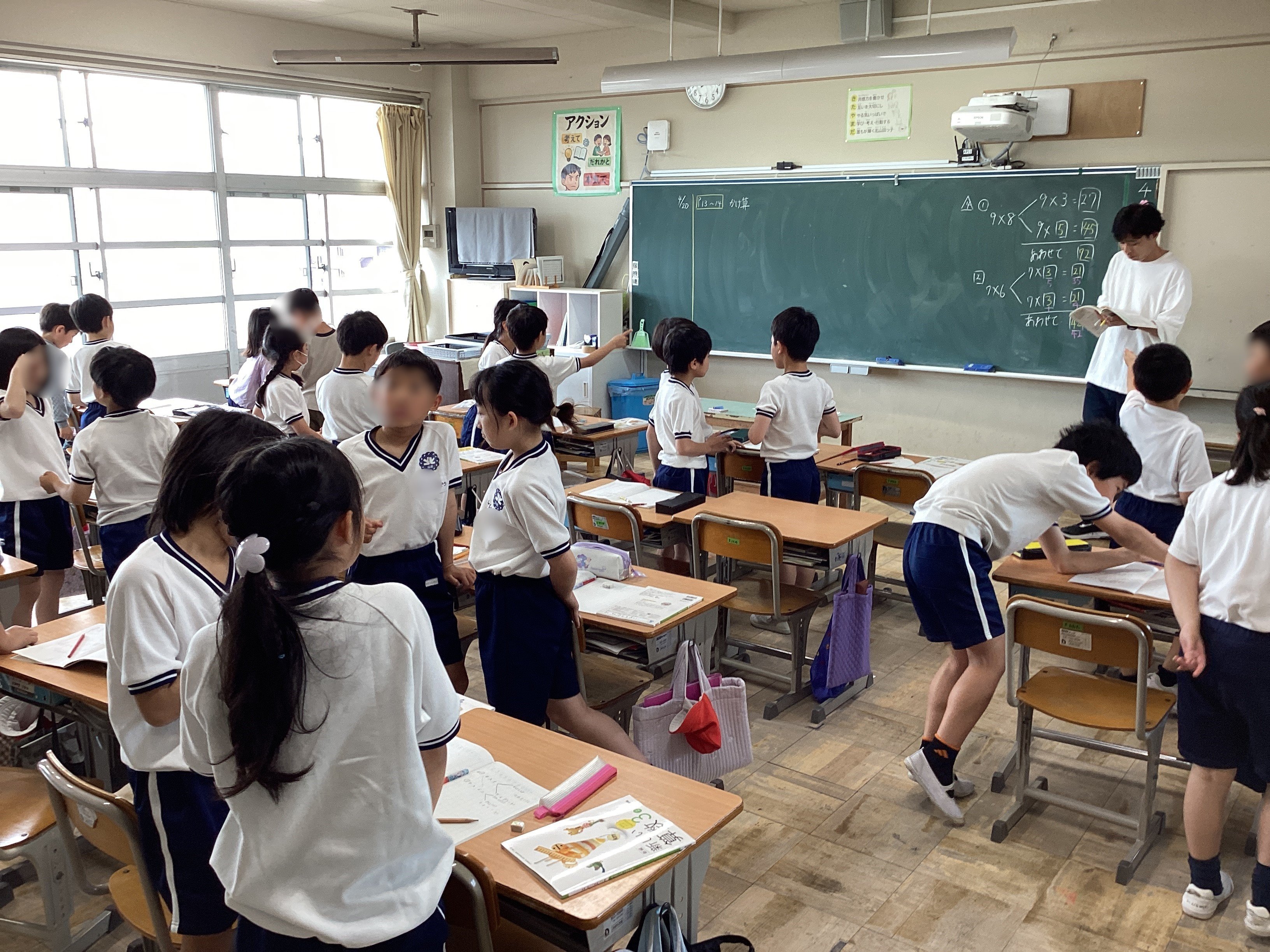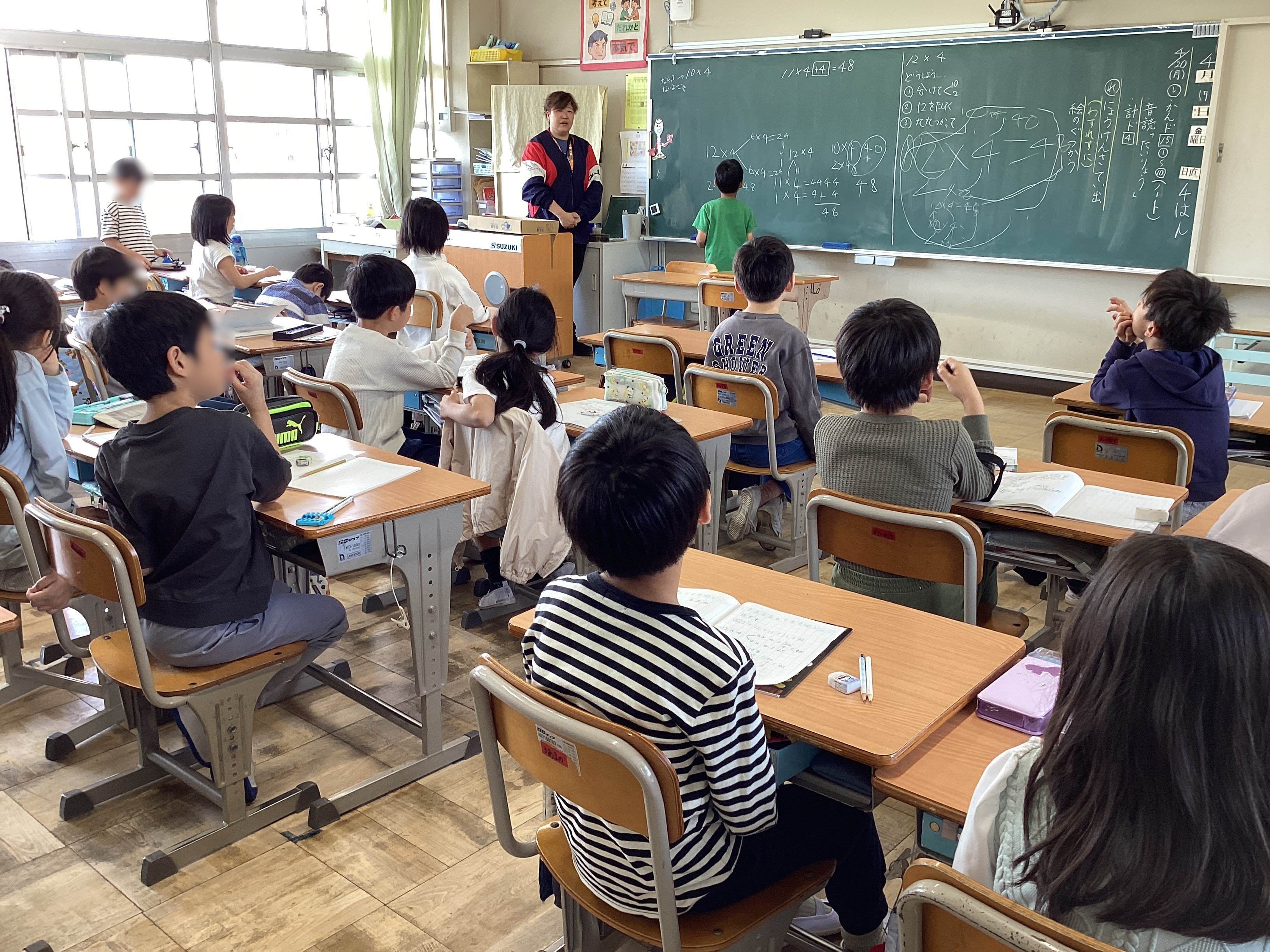 3年生の算数では、12×4の計算の仕方を子どもたちが考え、前に出てきて黒板に書きながら説明していました。みんなにとって分かりやすいように説明することはとても大切な技能ですし、説明することで思考も整理できますね。