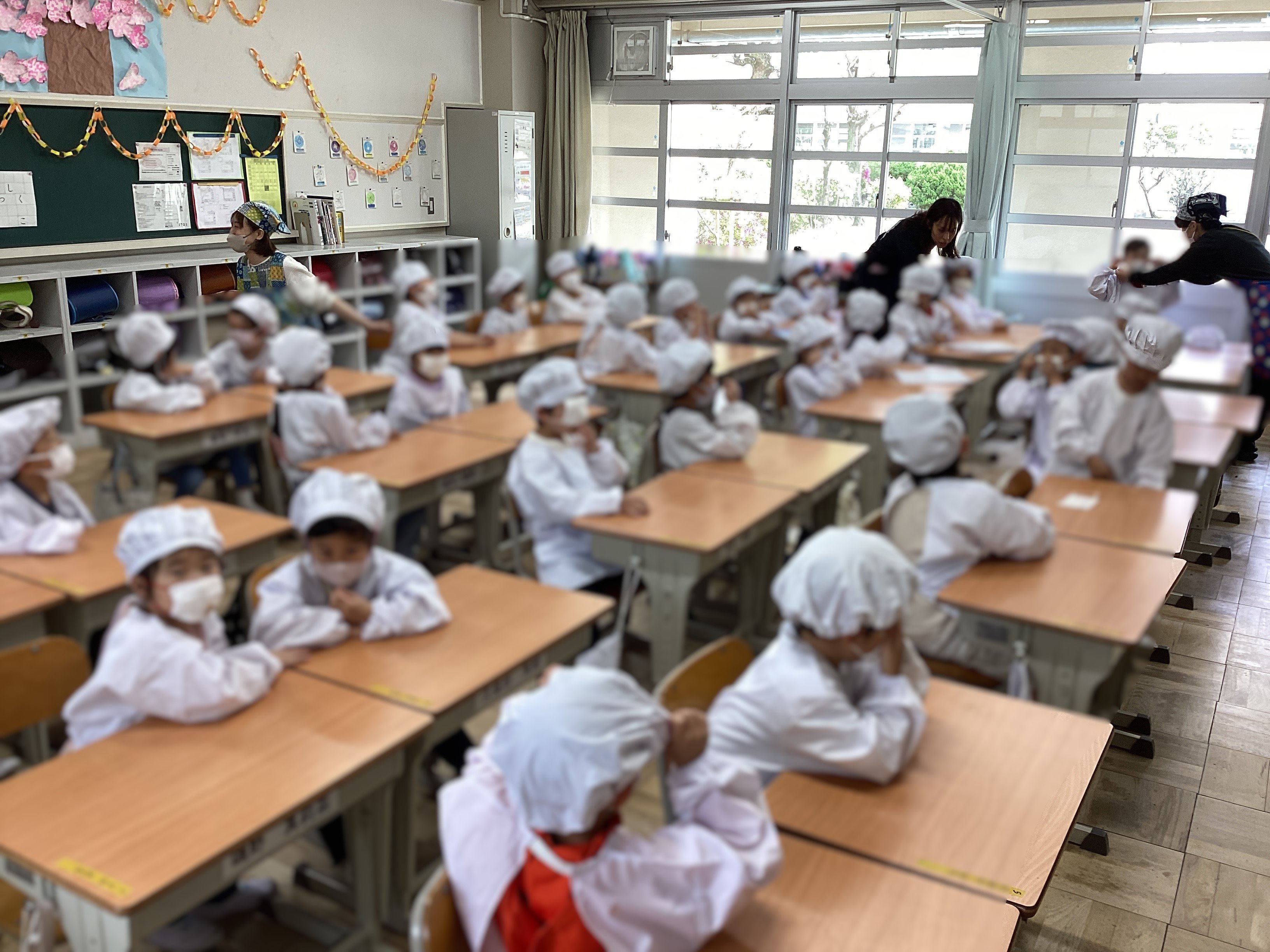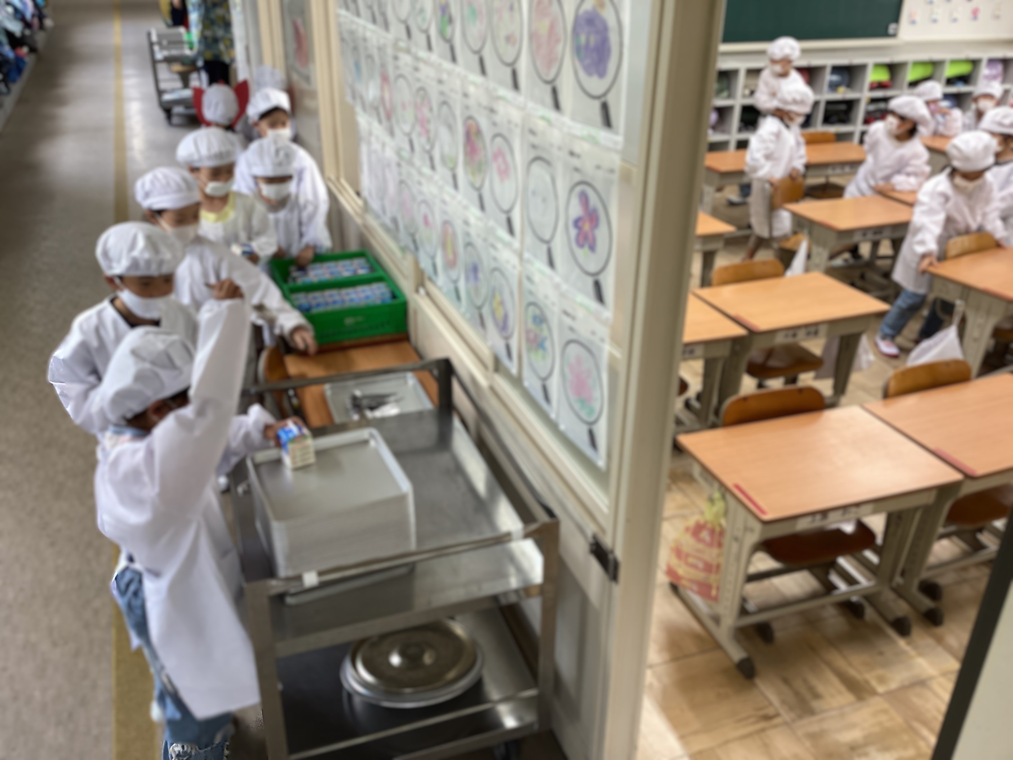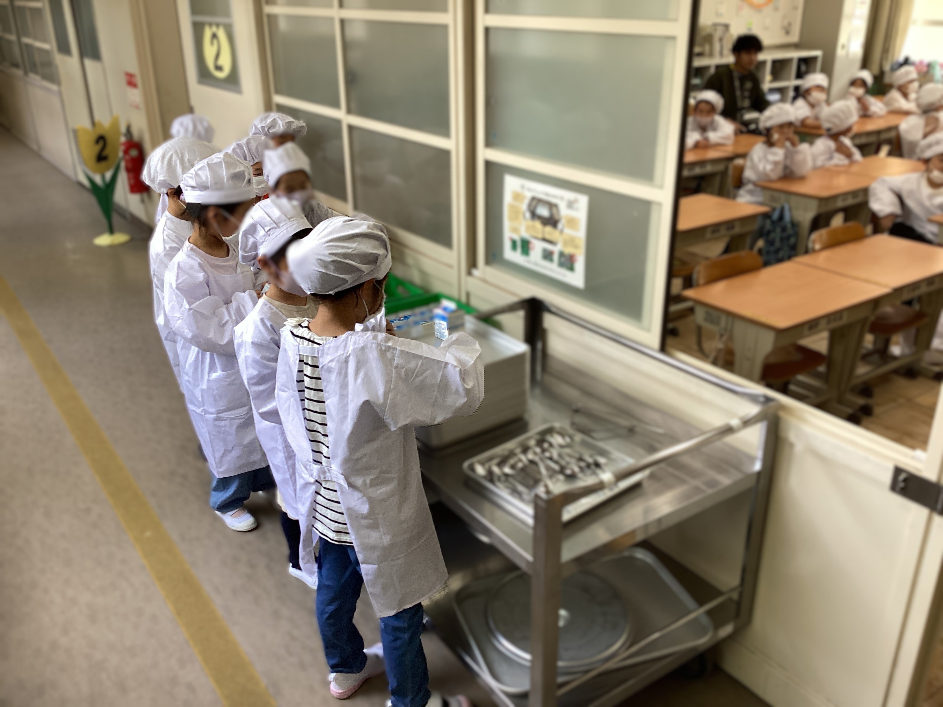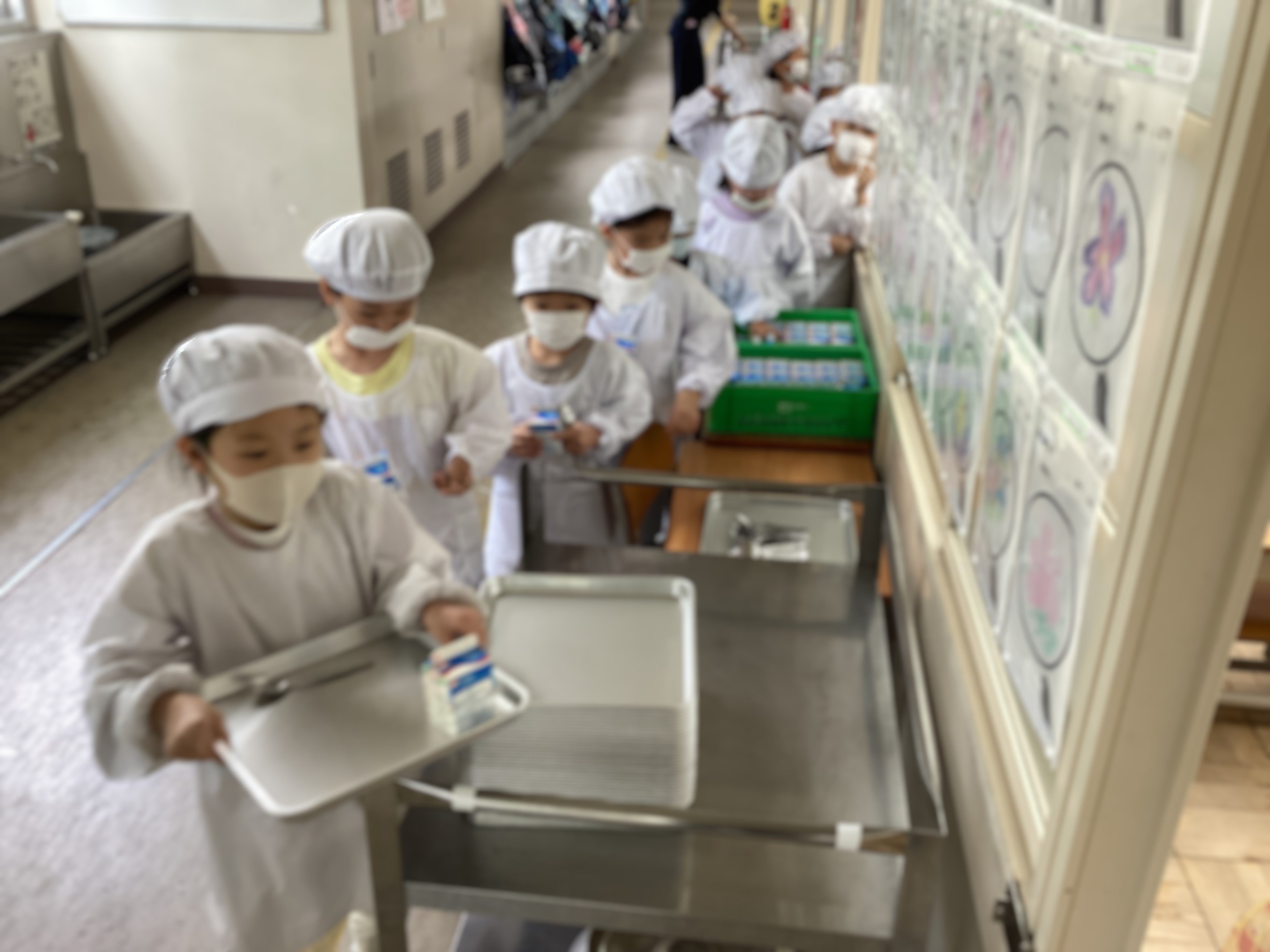トイレを済ませ、手を洗い、エプロンに着替えて、自席で待つ。この流れがみんなスムーズにできていました。先生がワゴンを取りに行っている間も静かに待つことができて素晴らしい!