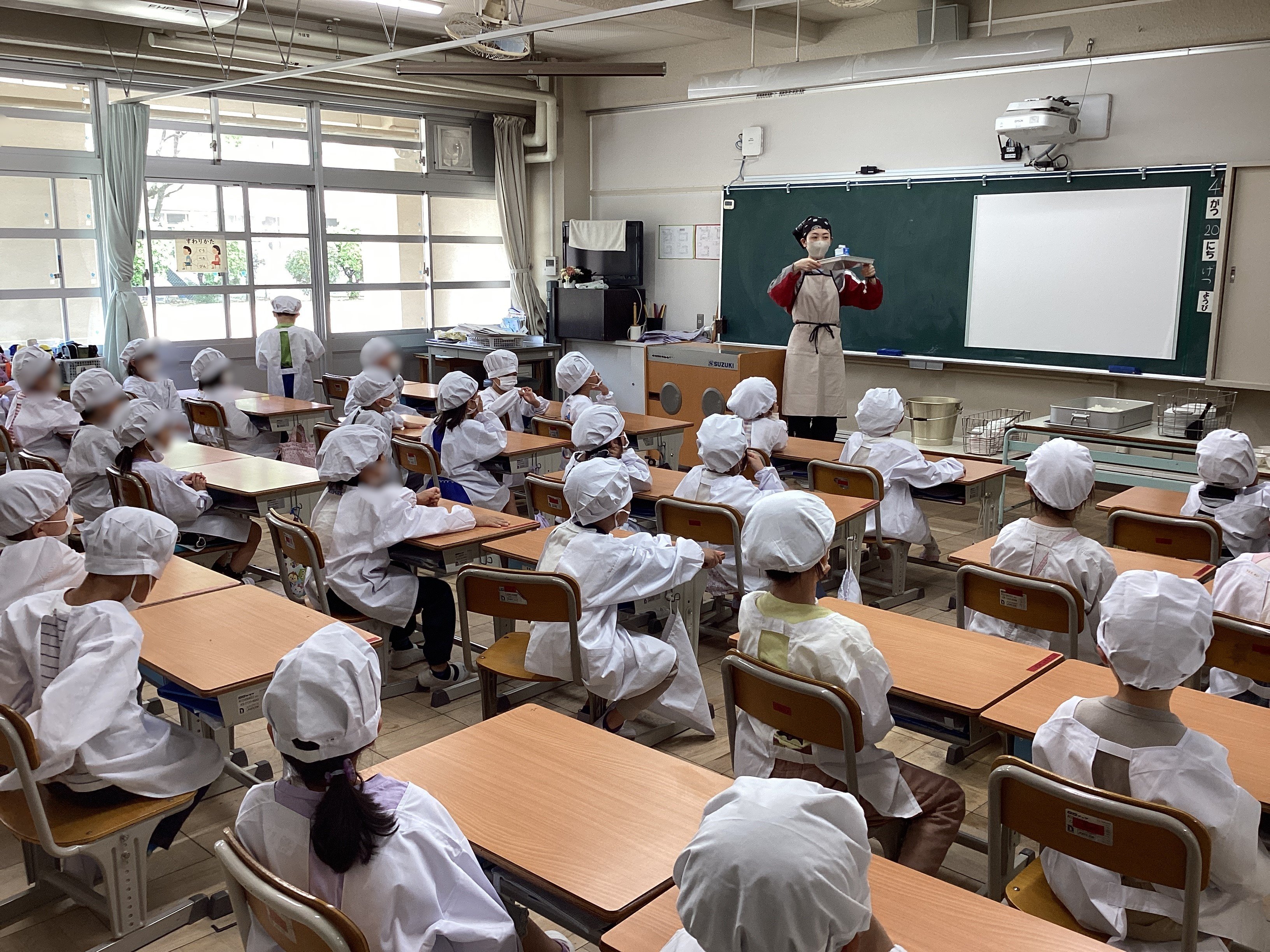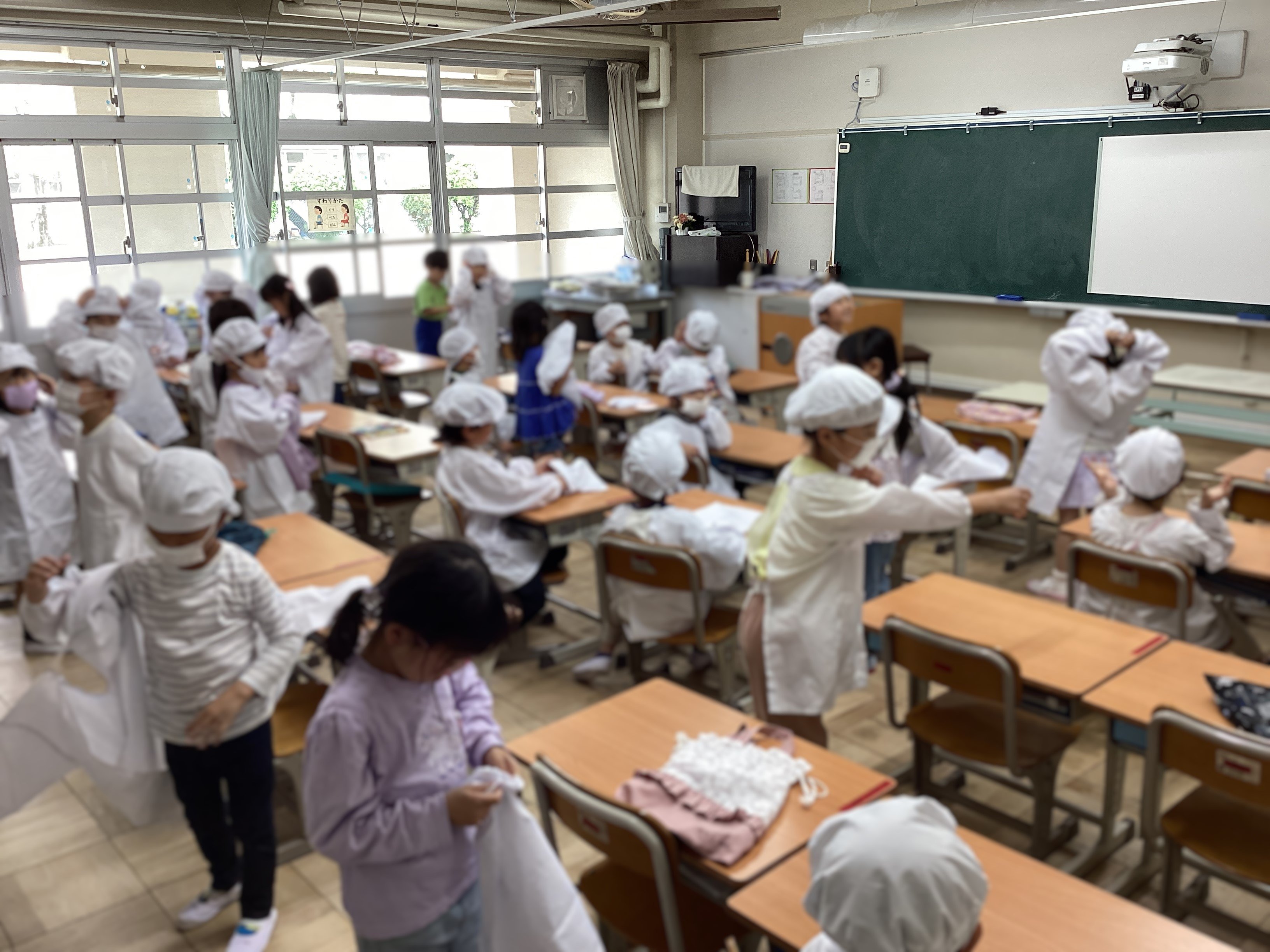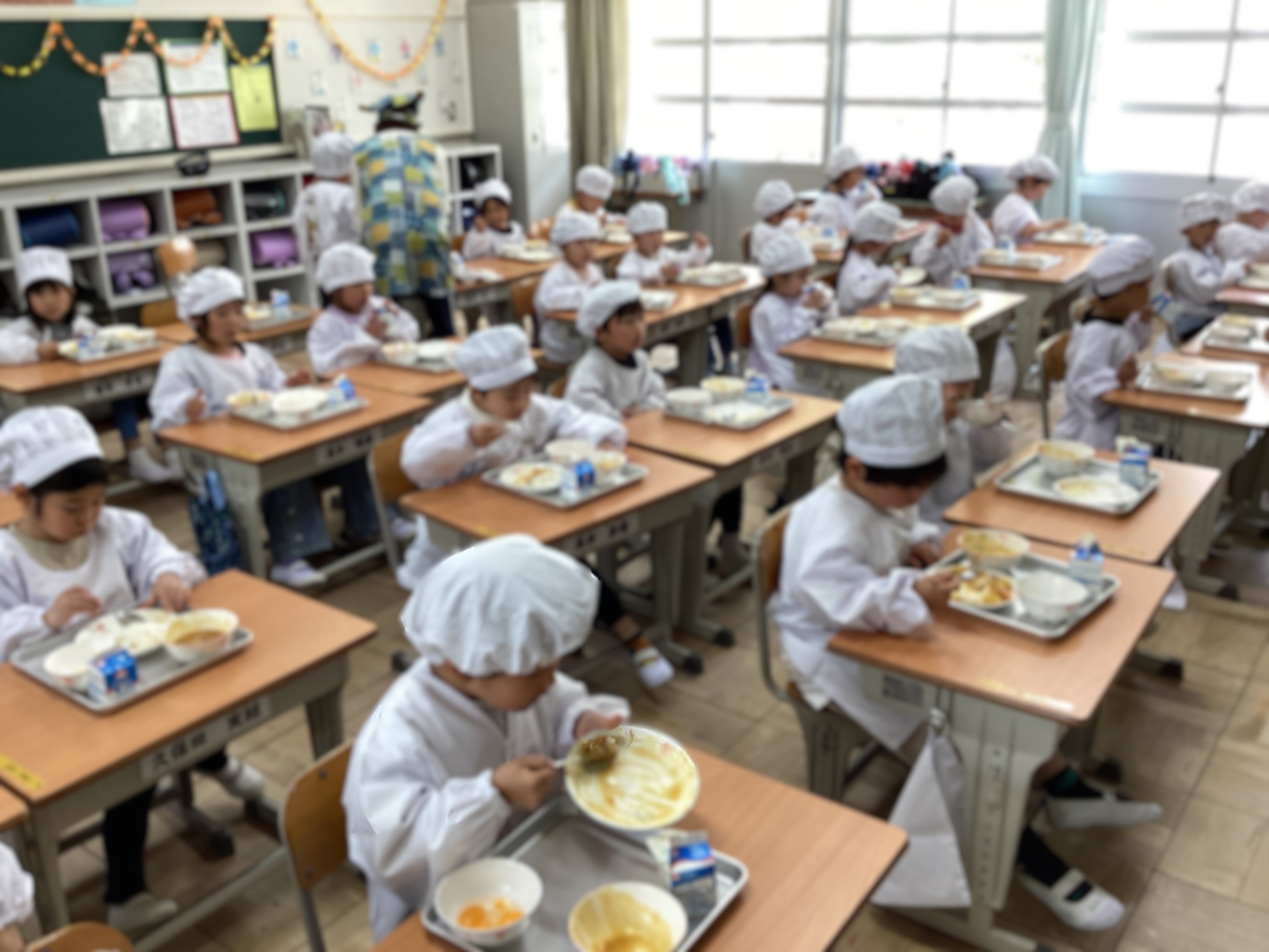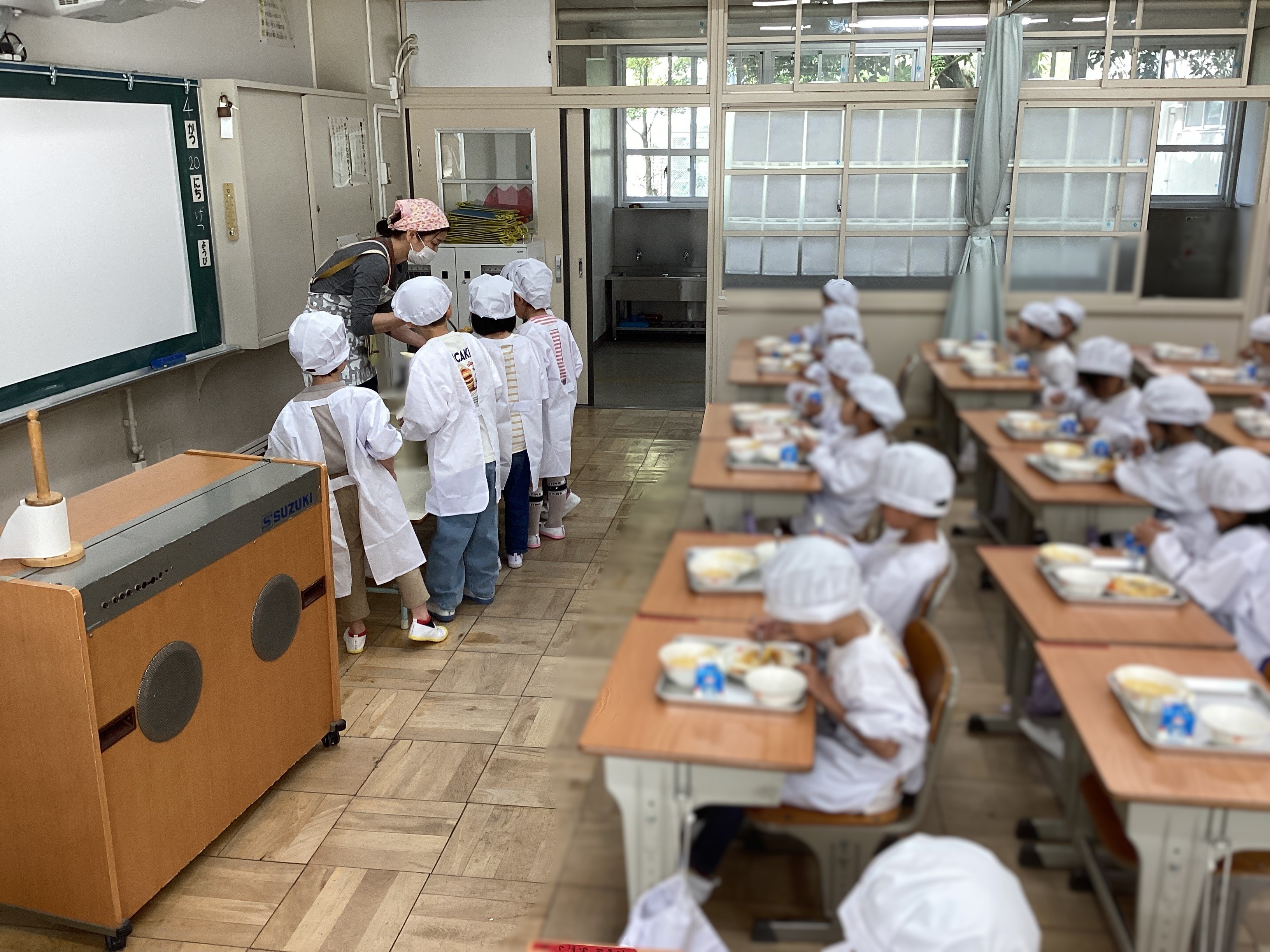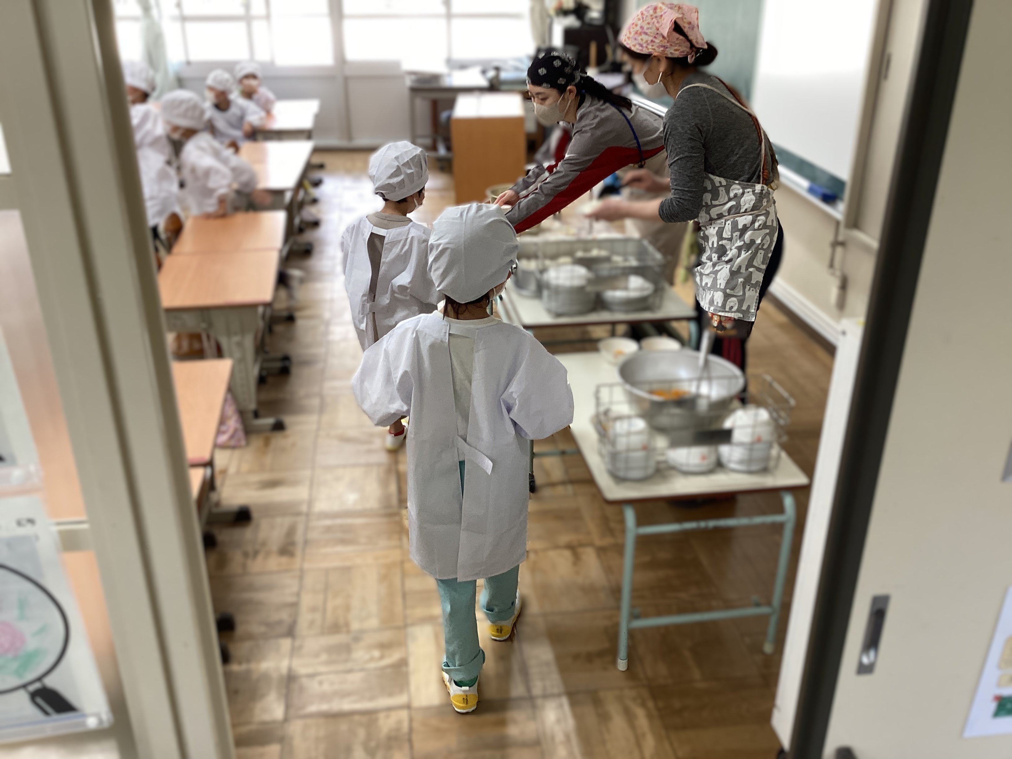トイレを済ませ、手を洗い、エプロンに着替えて、自席で待つ。この流れがみんなスムーズにできていました。先生がワゴンを取りに行っている間も静かに待つことができて素晴らしい!
