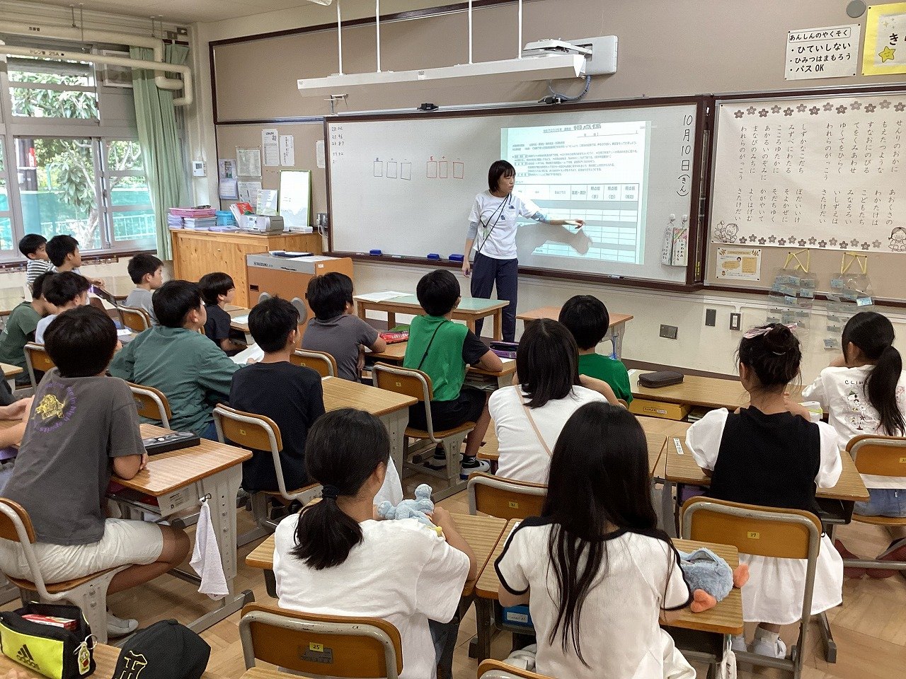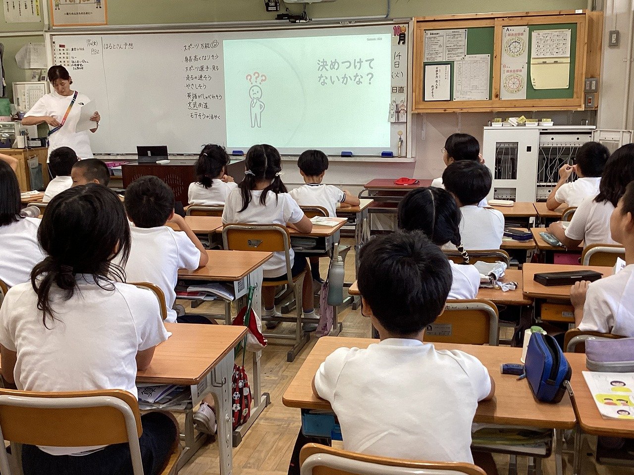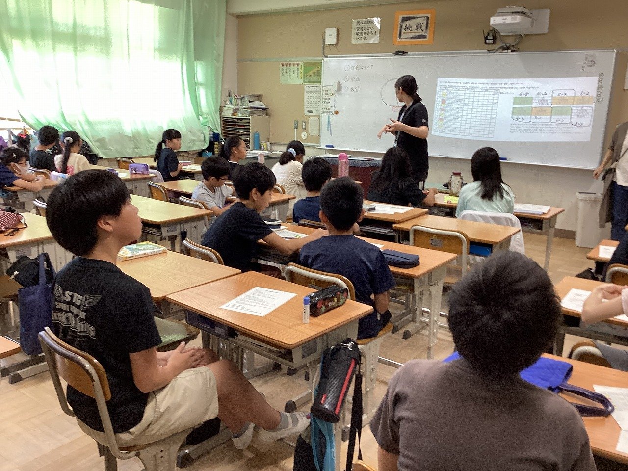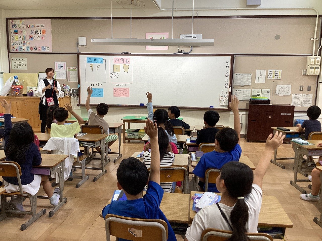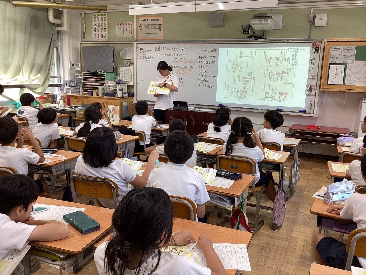 国語で学習した「サラダでげんき」から、りっちゃんの作ったサラダを食べたお母さんが元気になった理由と1学期に学習した栄養三色をつなげることで、より食に対する知識・関心を深めることをめあてに、給食の先生が授業をしてくれました。