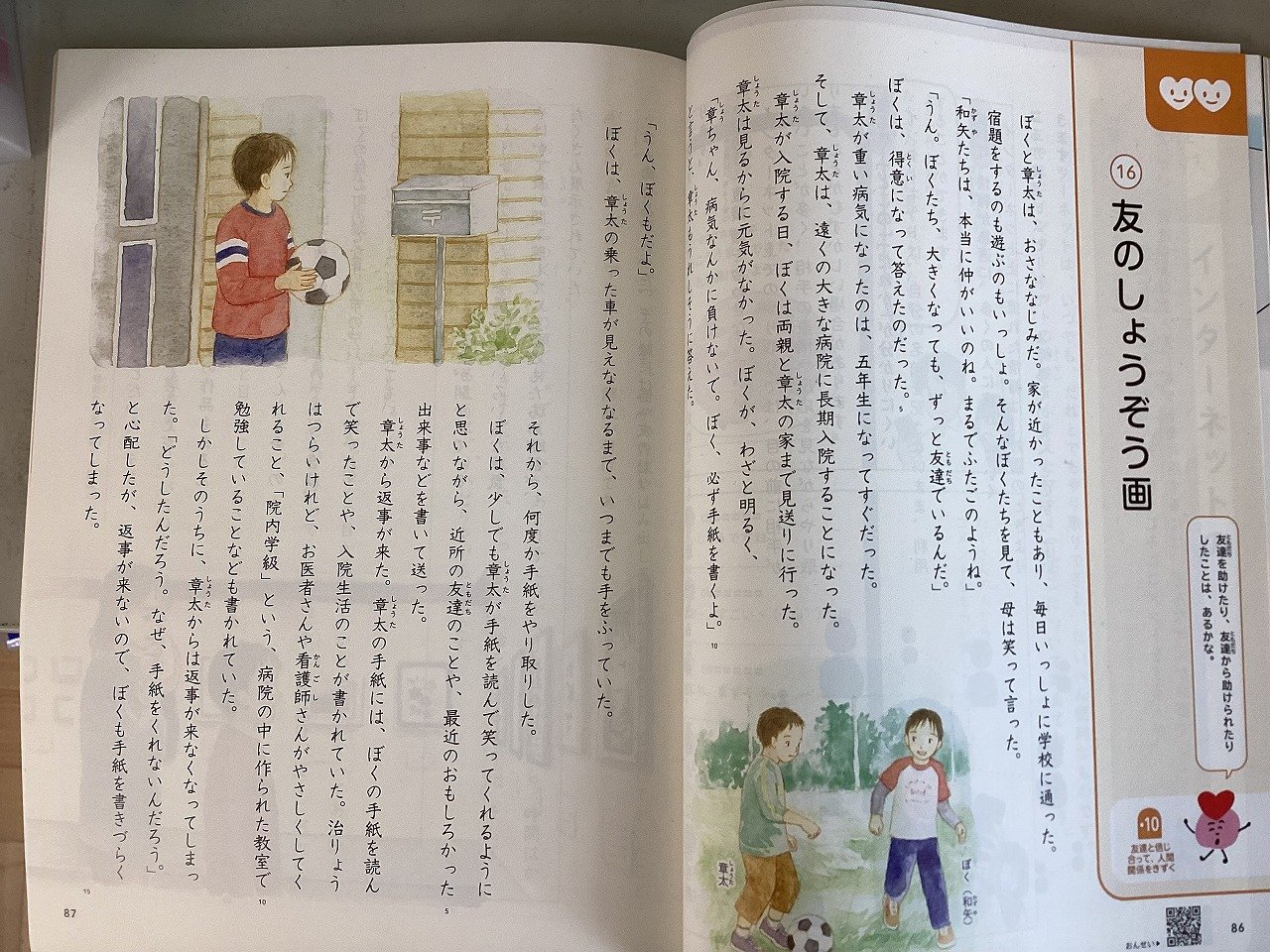 ぼくと章太はおさななじみ。章太は、重い病気になり、遠くの病院に入院することになった。何度か手紙をやり取りしたが、しばらくすると、返事が来なくなったので、ぼくも手紙を書きづらくなった。半年以上が過ぎ、テレビのニュースで院内学級絵画てんらん会の様子がうつし出されていた。そこに、章太の作品があった。タイトルは、「友のしょうぞう画」それは、ぼくを描いたもので、解説には、「ぼくは今、あまり手に力が入らない」ことが書かれていた。ぼくは、手紙を書けない訳がわかった。ぼくの目から涙が溢れた。