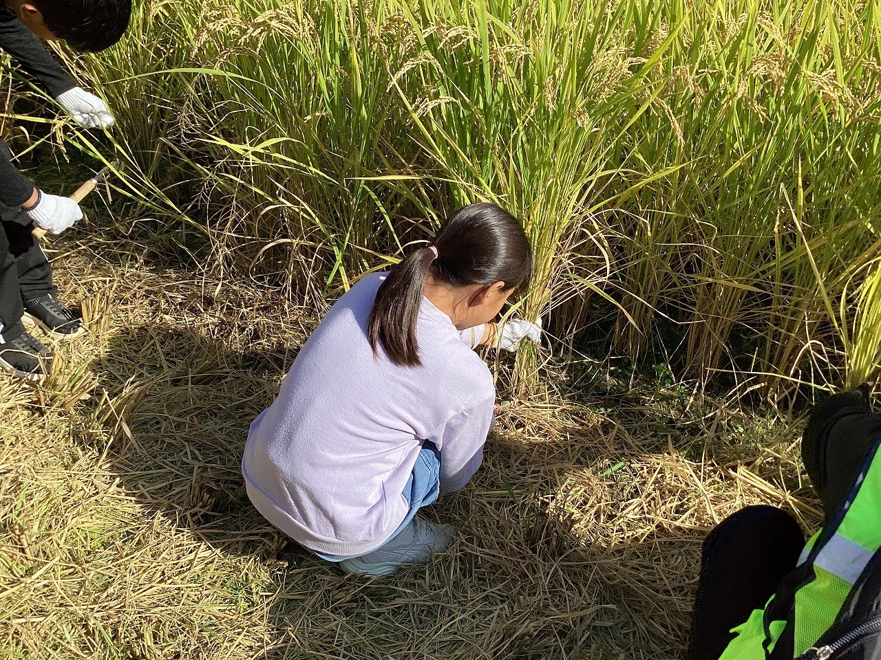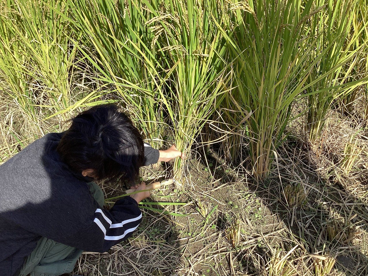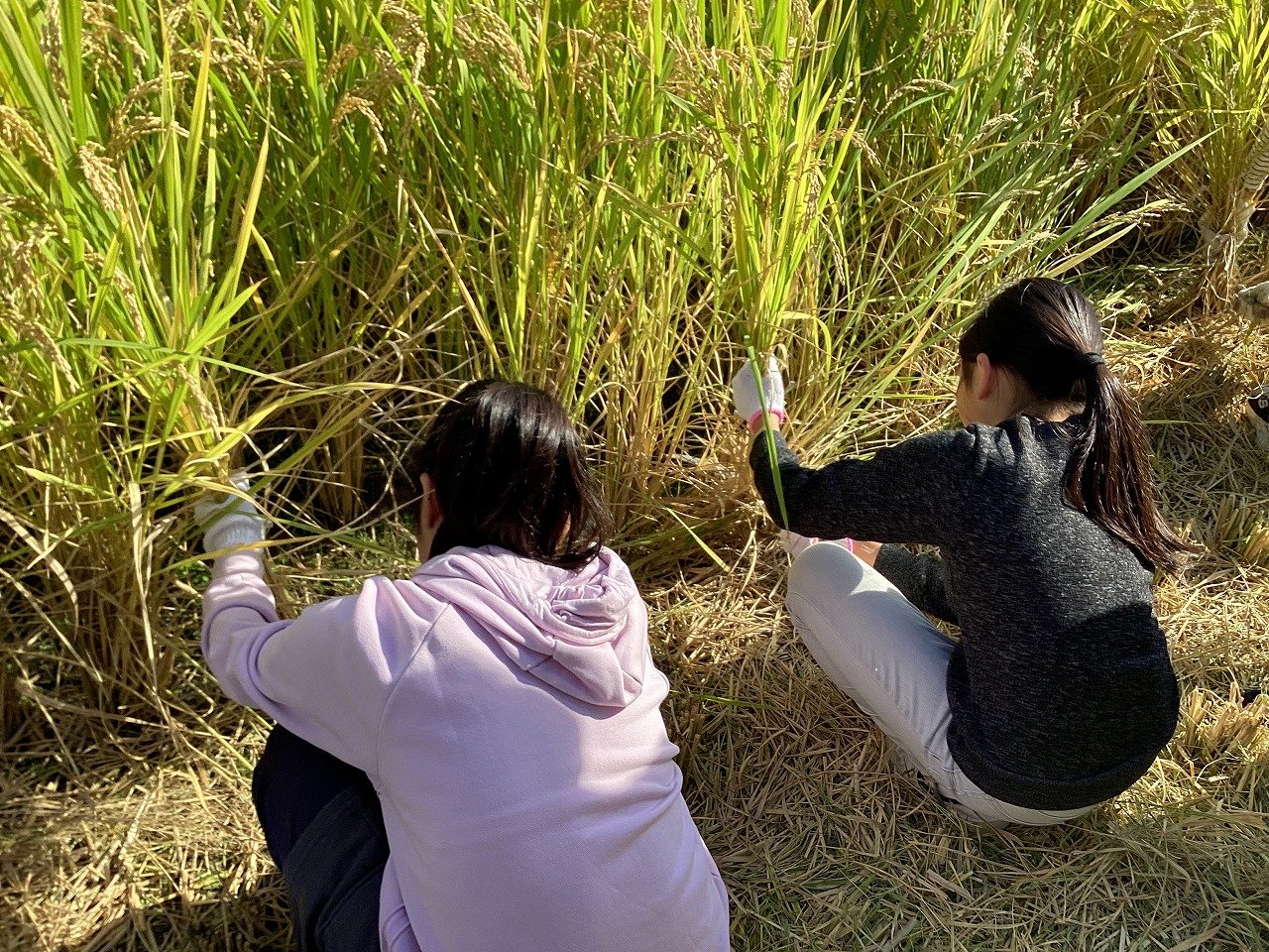 子どもたちは、小さな苗がこんなに大きく育って収穫できることをとても喜んでいる様子でした。ちなみにお米の品種は、ヒノヒカリで、給食にも提供されているようです。