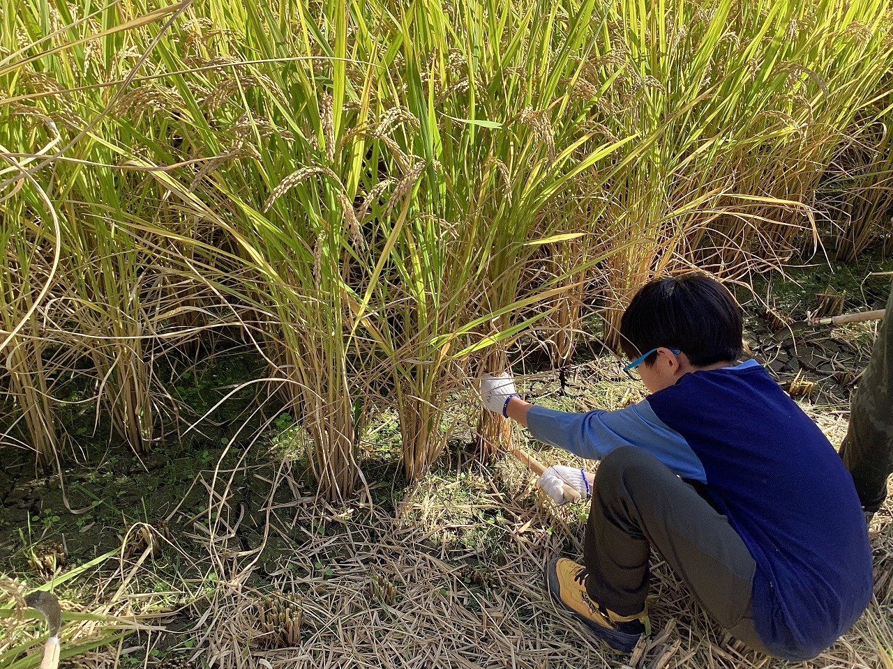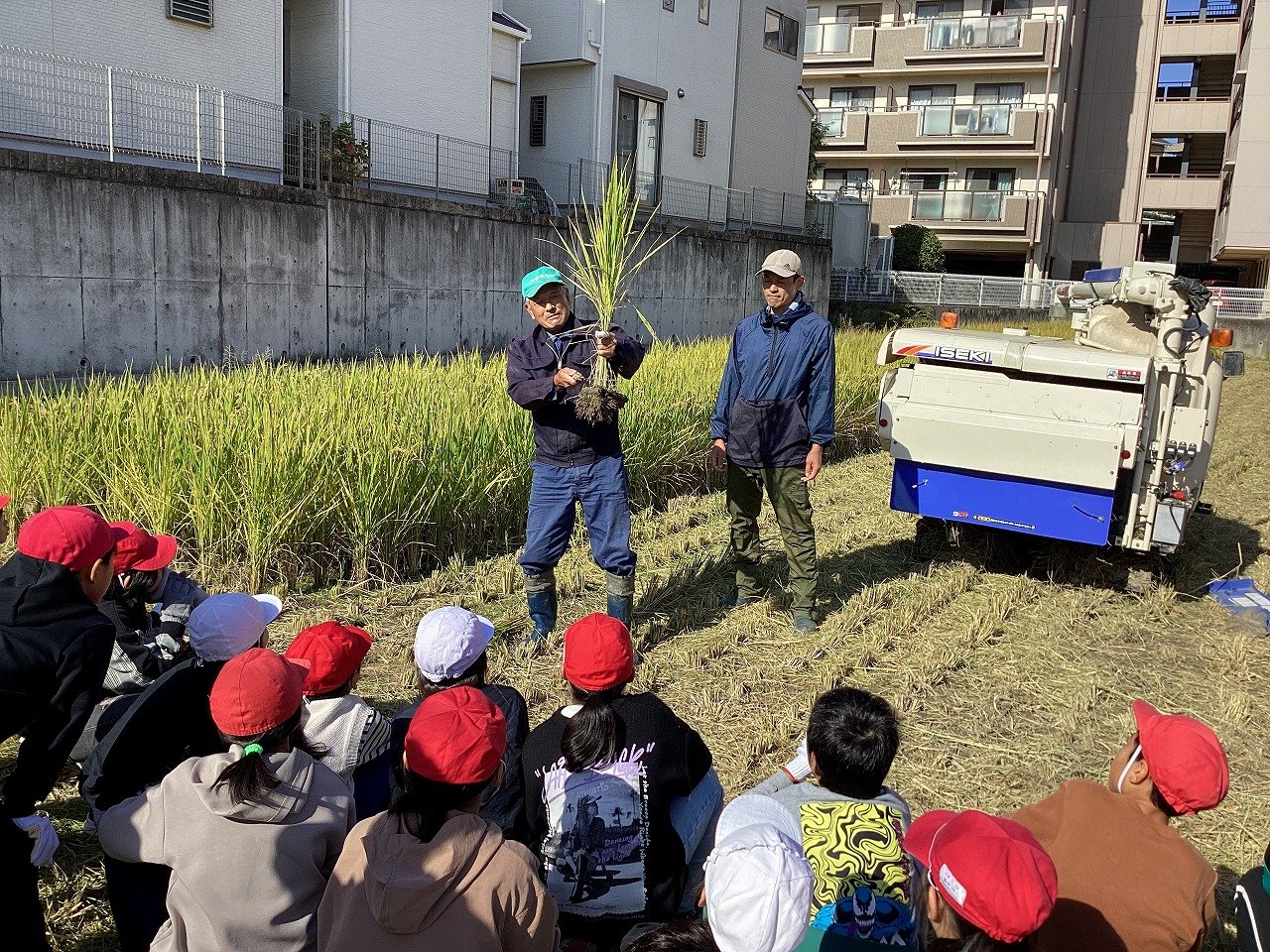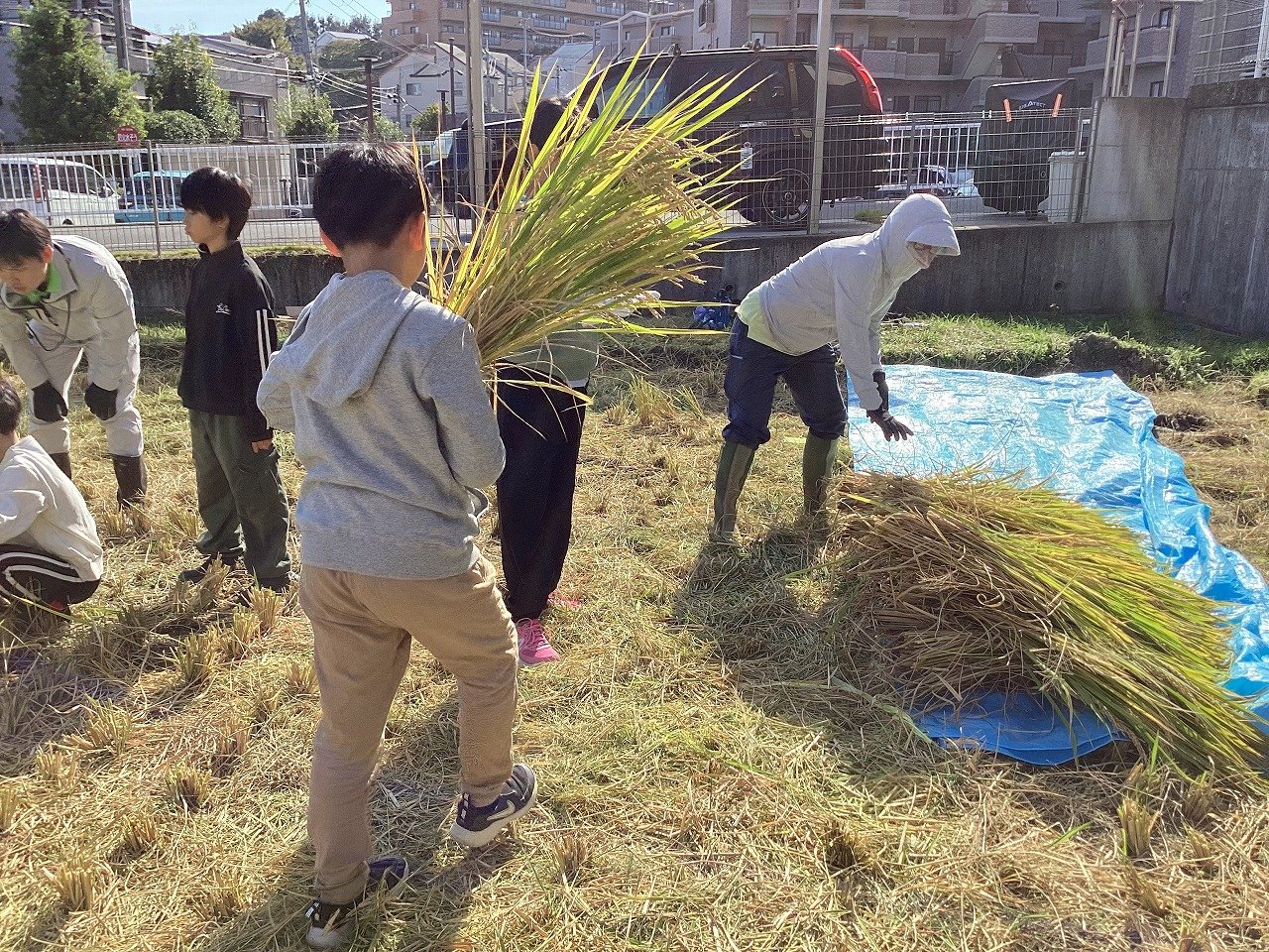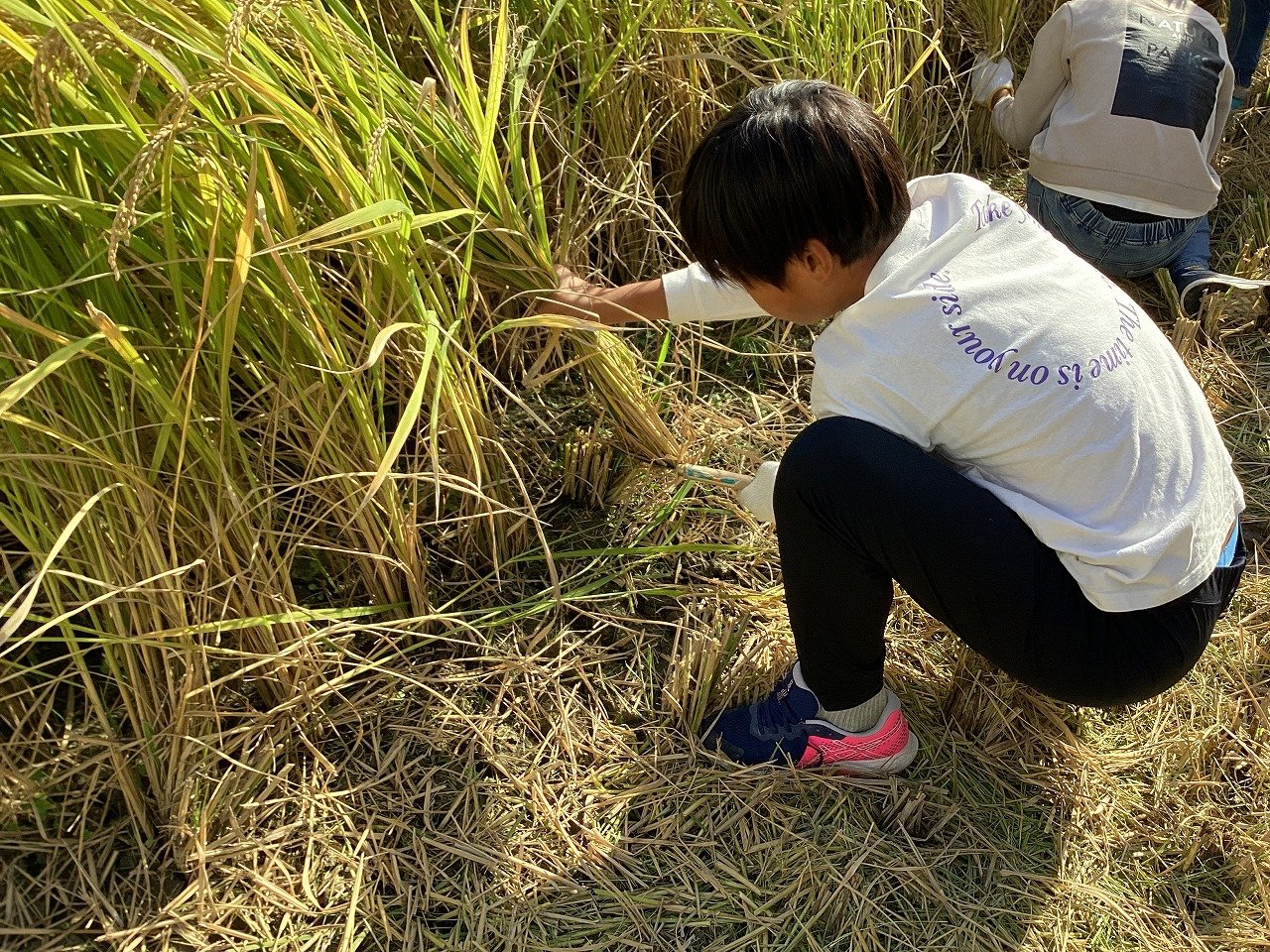 子どもたちは、小さな苗がこんなに大きく育って収穫できることをとても喜んでいる様子でした。ちなみにお米の品種は、ヒノヒカリで、給食にも提供されているようです。
