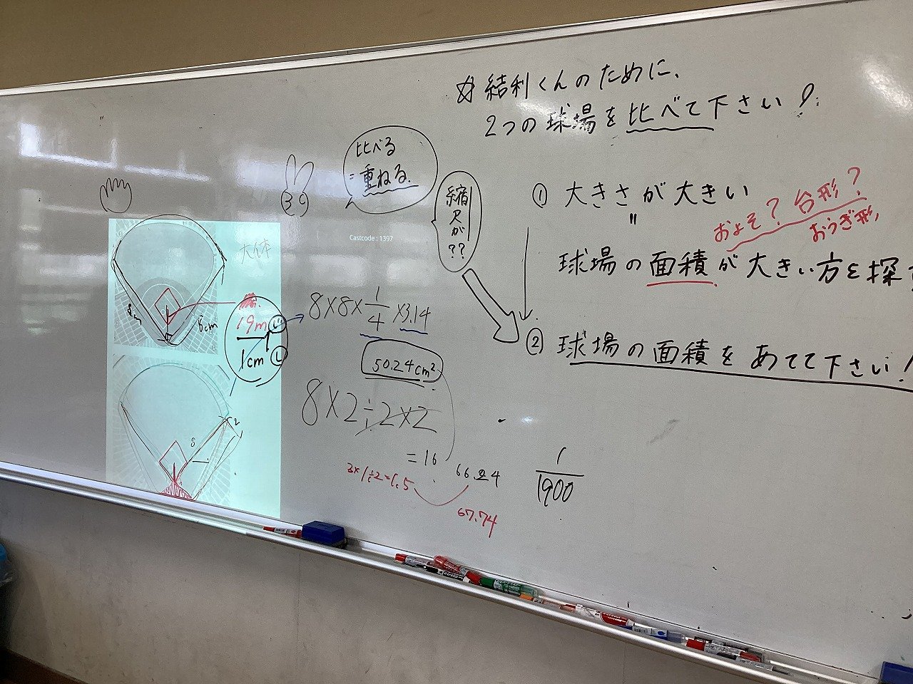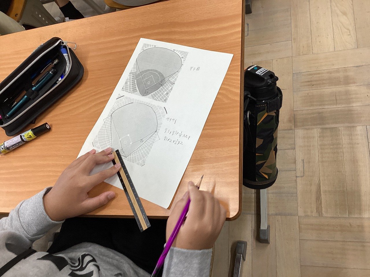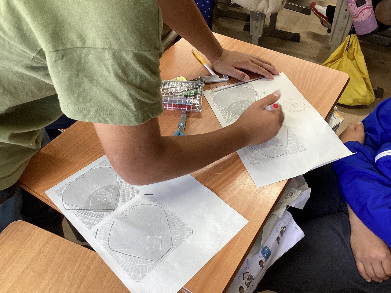 2つの球場の見取り図が書かれたプリントに線を引いたり、当てはまる図形を記入したりして、およその面積を求めていました。