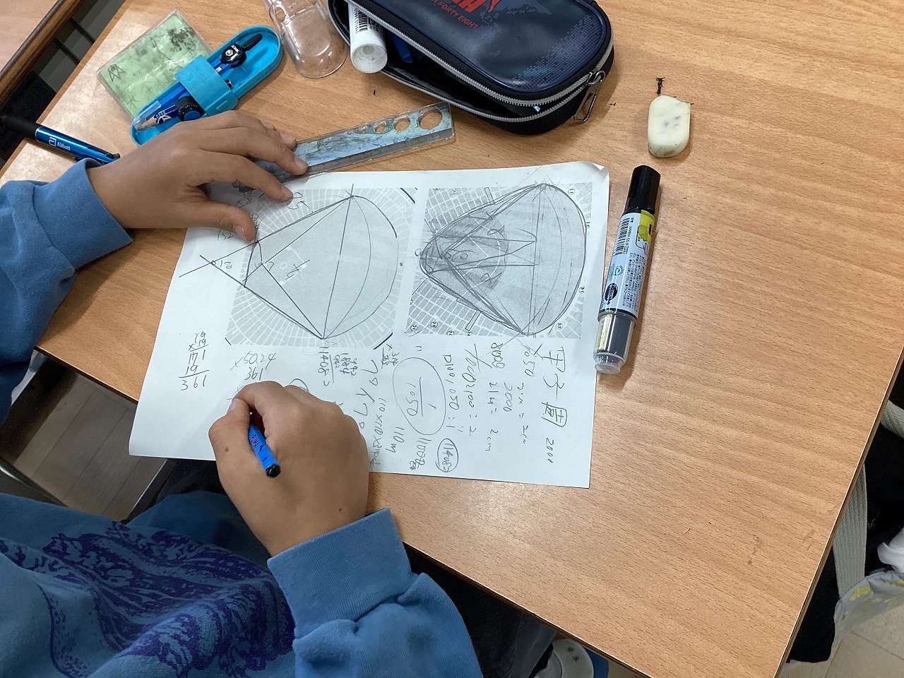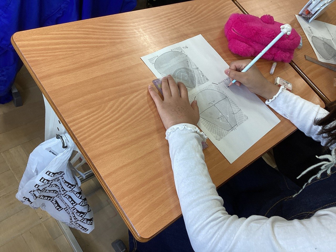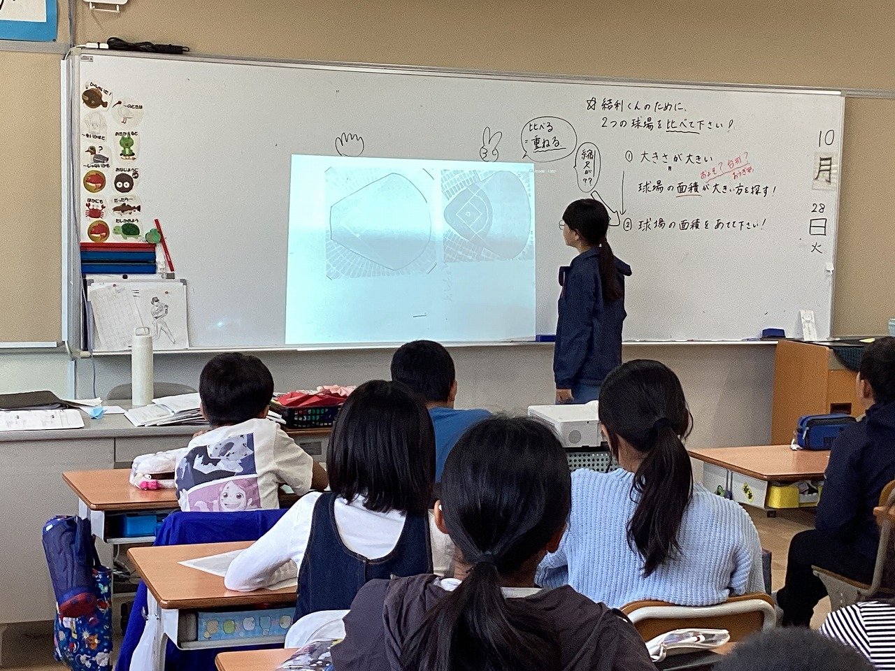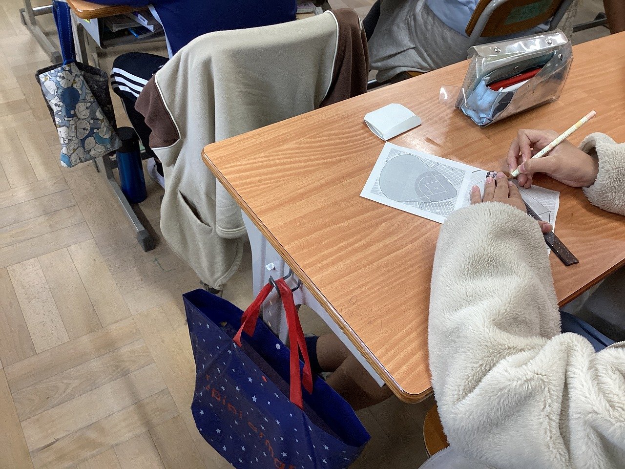 2つの球場の見取り図が書かれたプリントに線を引いたり、当てはまる図形を記入したりして、およその面積を求めていました。