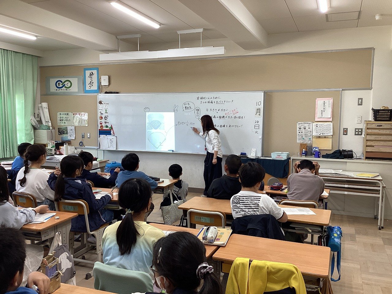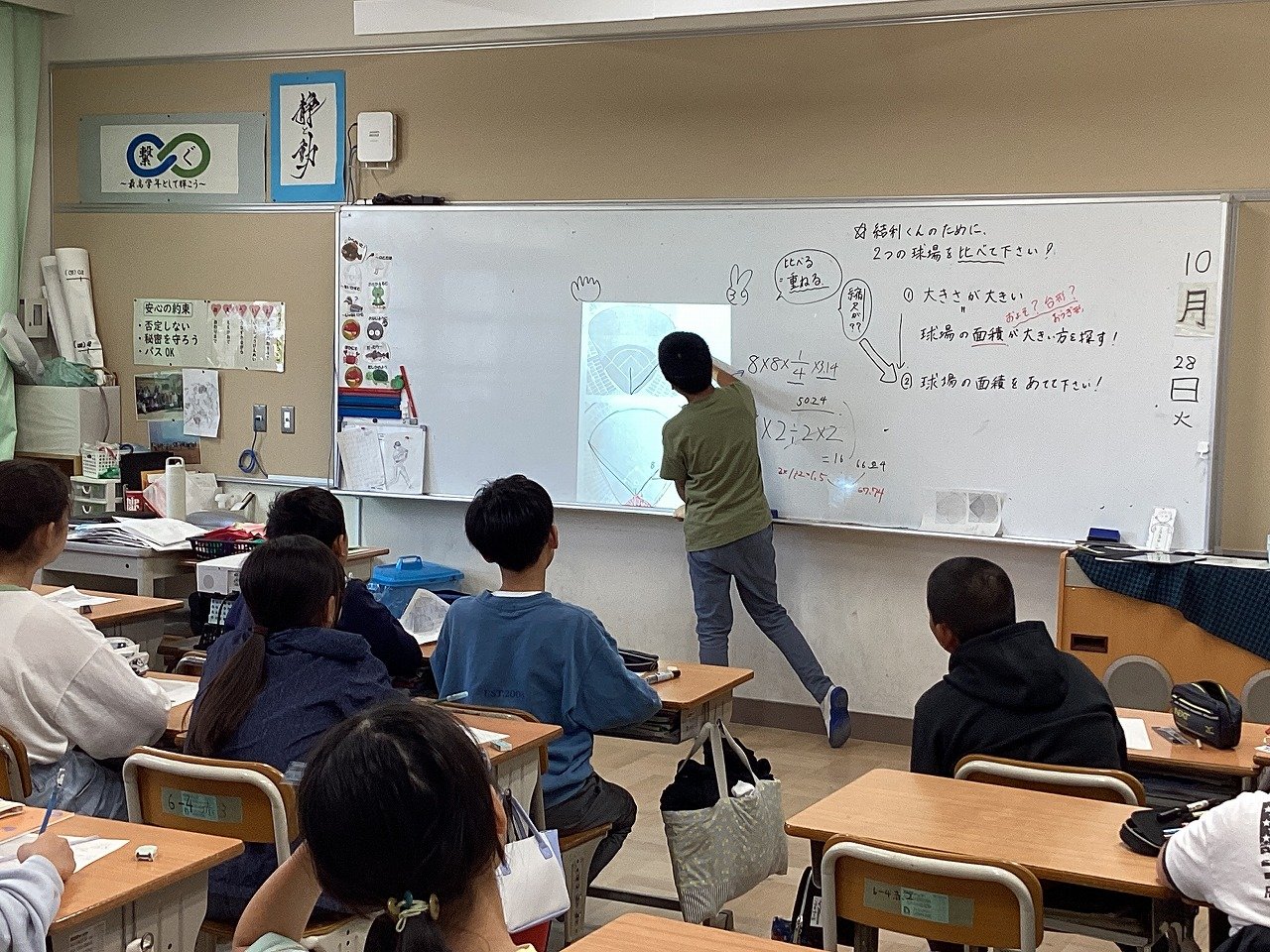 グランドを扇形や三角形に見立てて考えたりするなど各自で試行錯誤しながら考えていました。