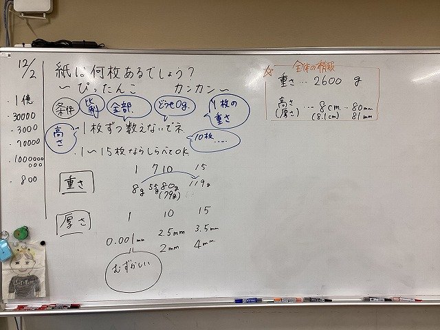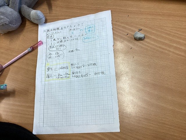 全部の紙の重さを調べると2600g、全部の紙の高さは8cmをもとに、自分たちで調べた条件を使い、およそ何枚あるのか、考えていました。