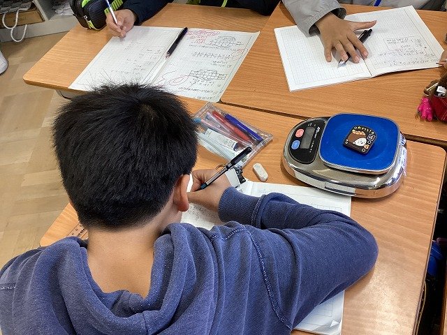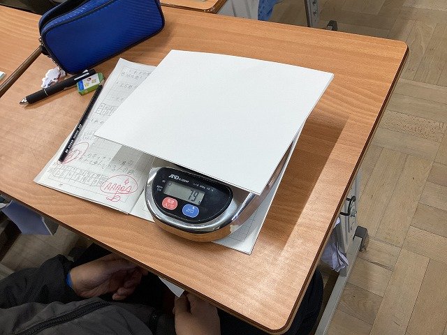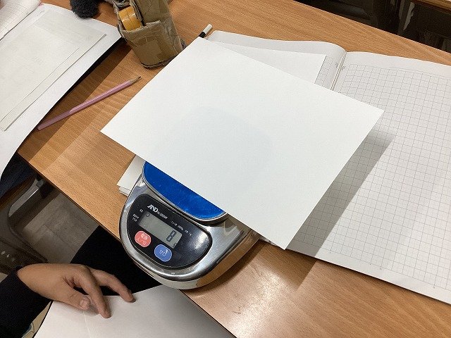 1人、1枚~15枚の紙を実際に使い、はかりで紙の重さを量ったり、紙の高さ(厚さ)を定規で計ったりしていました。