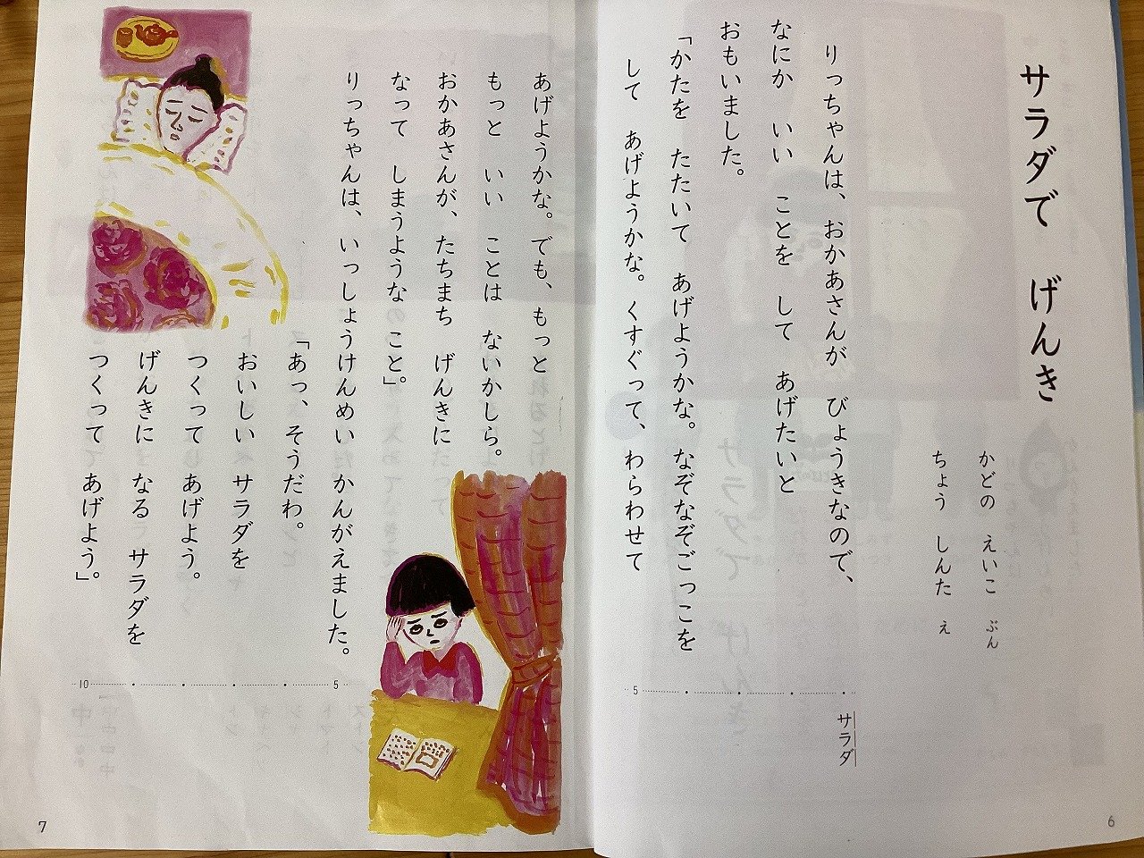 「えいようさんしょくがそろったサラダを食べたので、びょうきだったおかあさんはたちまちげんきになったことをおさえて、最後に元気にしたい人に栄養バランスの整ったオリジナルサラダを考えて終わりました。
