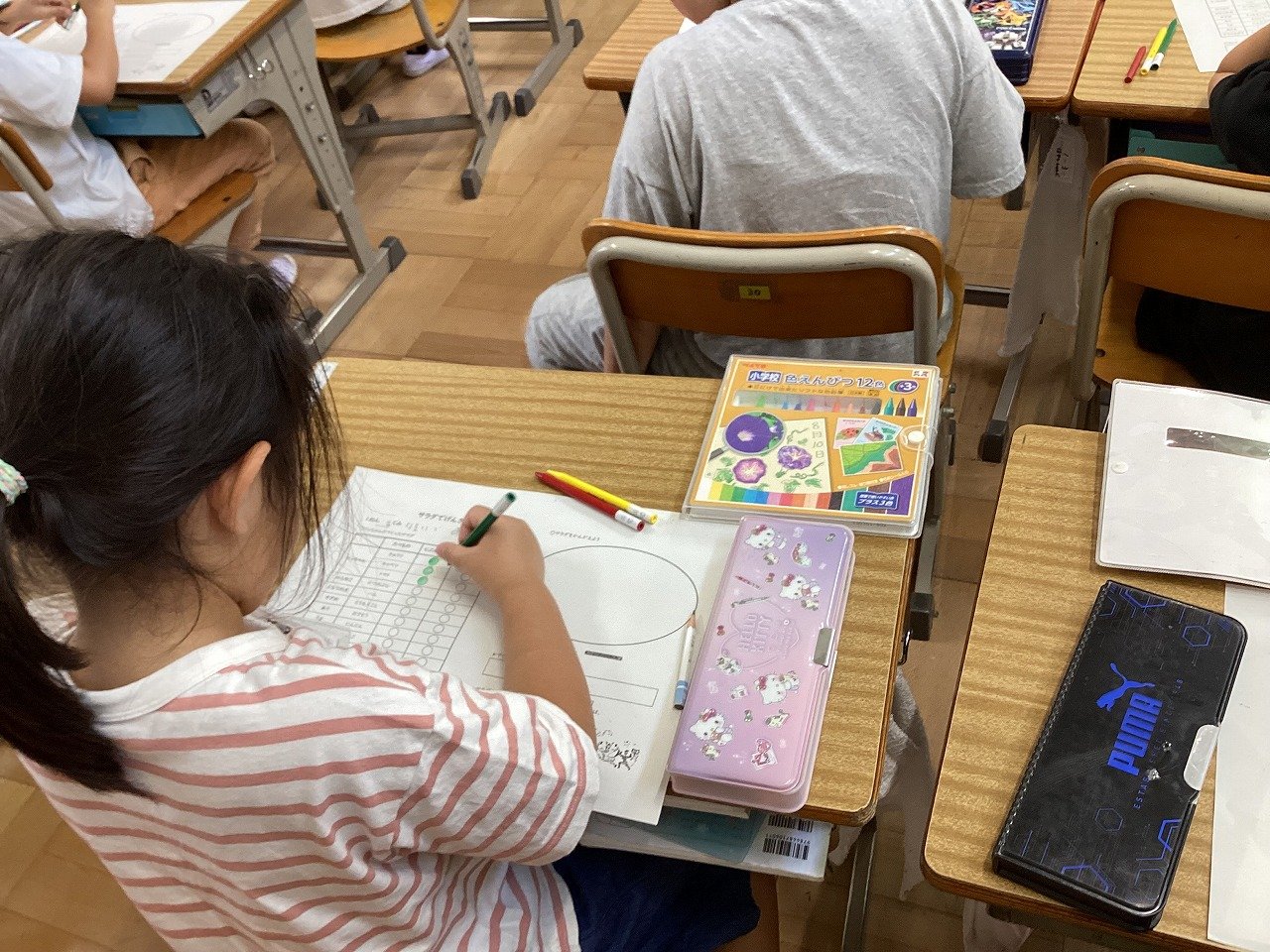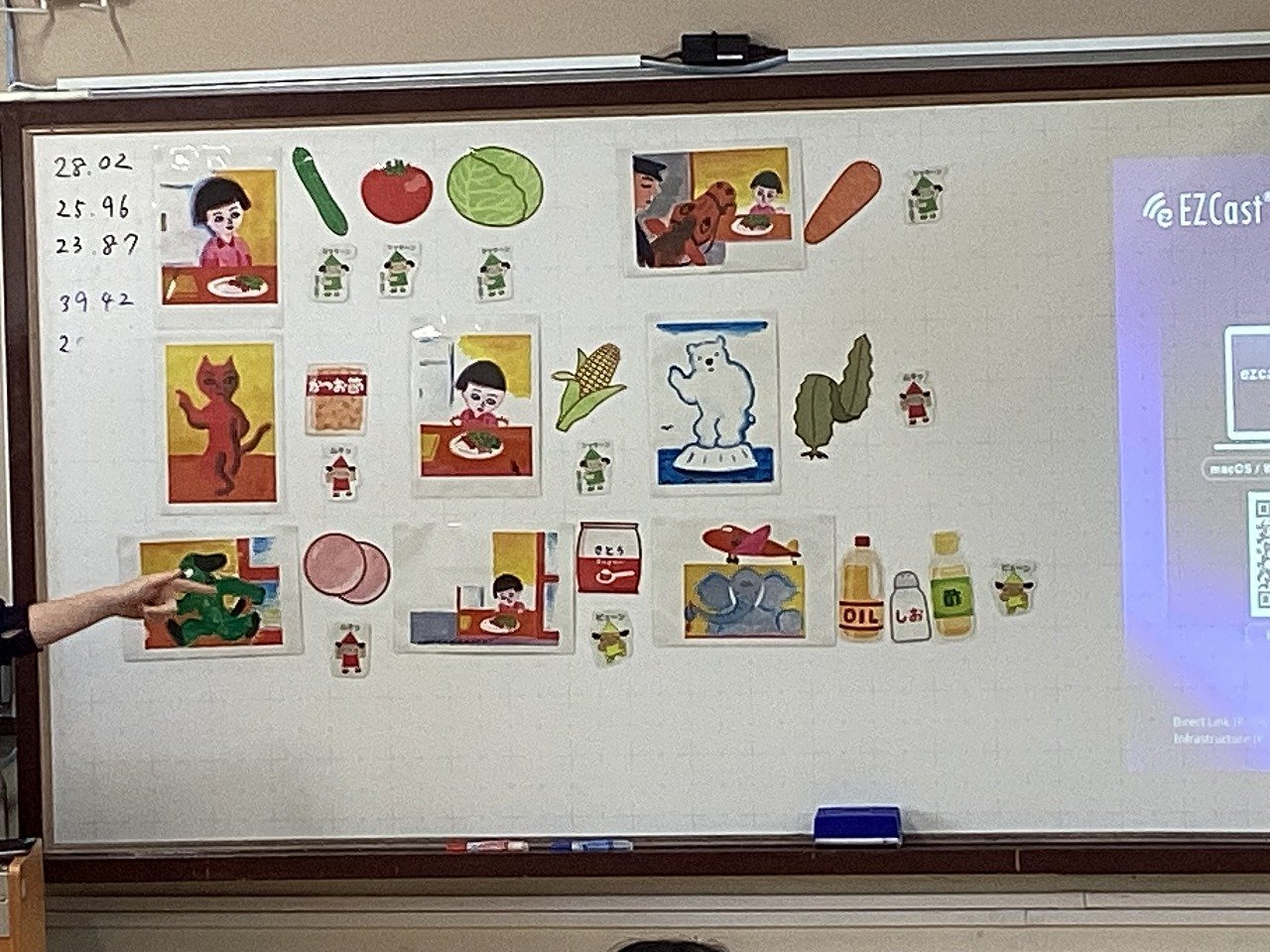 物語に出てくるサラダの中身を一つずつ、栄養三色に分けていきました。きゅうり・キャベツ・にんじん・とうもろこし・トマトは緑のなかまであるところは、多くの子どもたちが納得していました。しかし、かつおぶしやこんぶ、砂糖・塩・酢・油の調味料が、何色になるか悩んでいる子どもたちが多かったです。