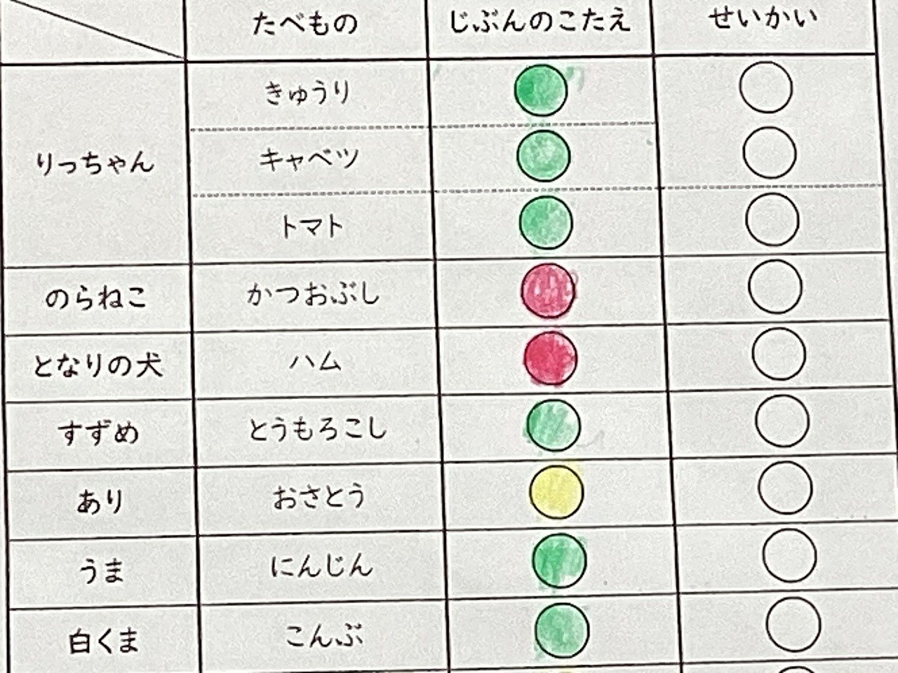 「かつおぶしのもとになっているのは何かな?」→「かつお」→「では、かつおは何の仲間かな」→「さかな」→「さかなは何色のなかまだったかな?」→「ああ、そうか、さかなは赤のなかまだ」