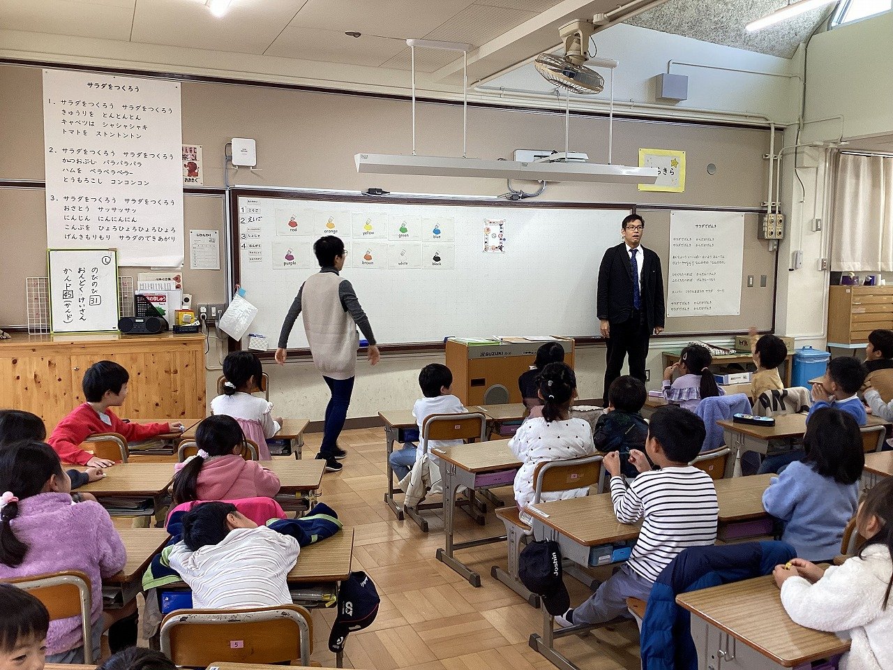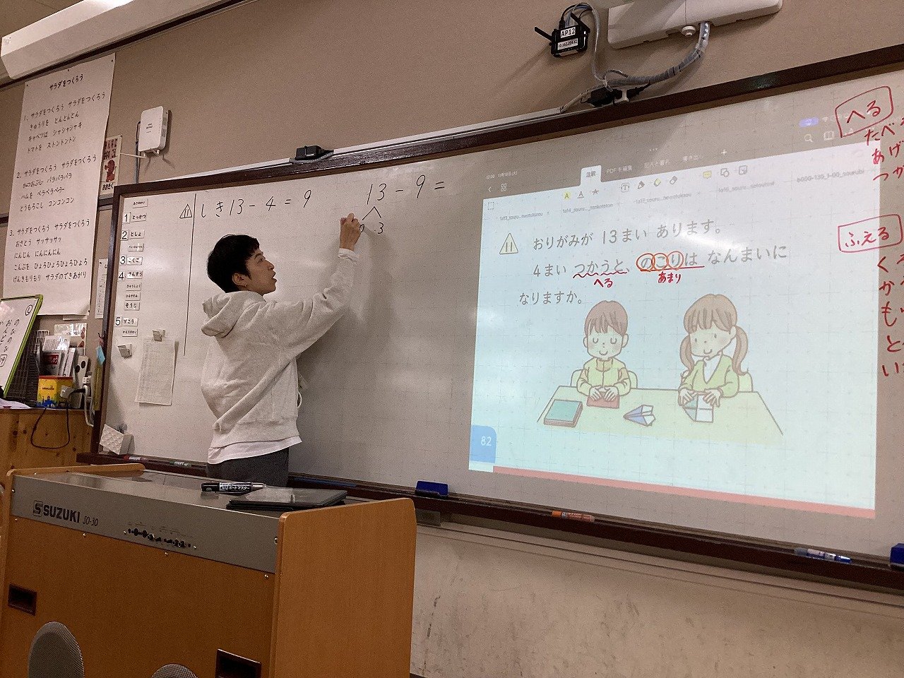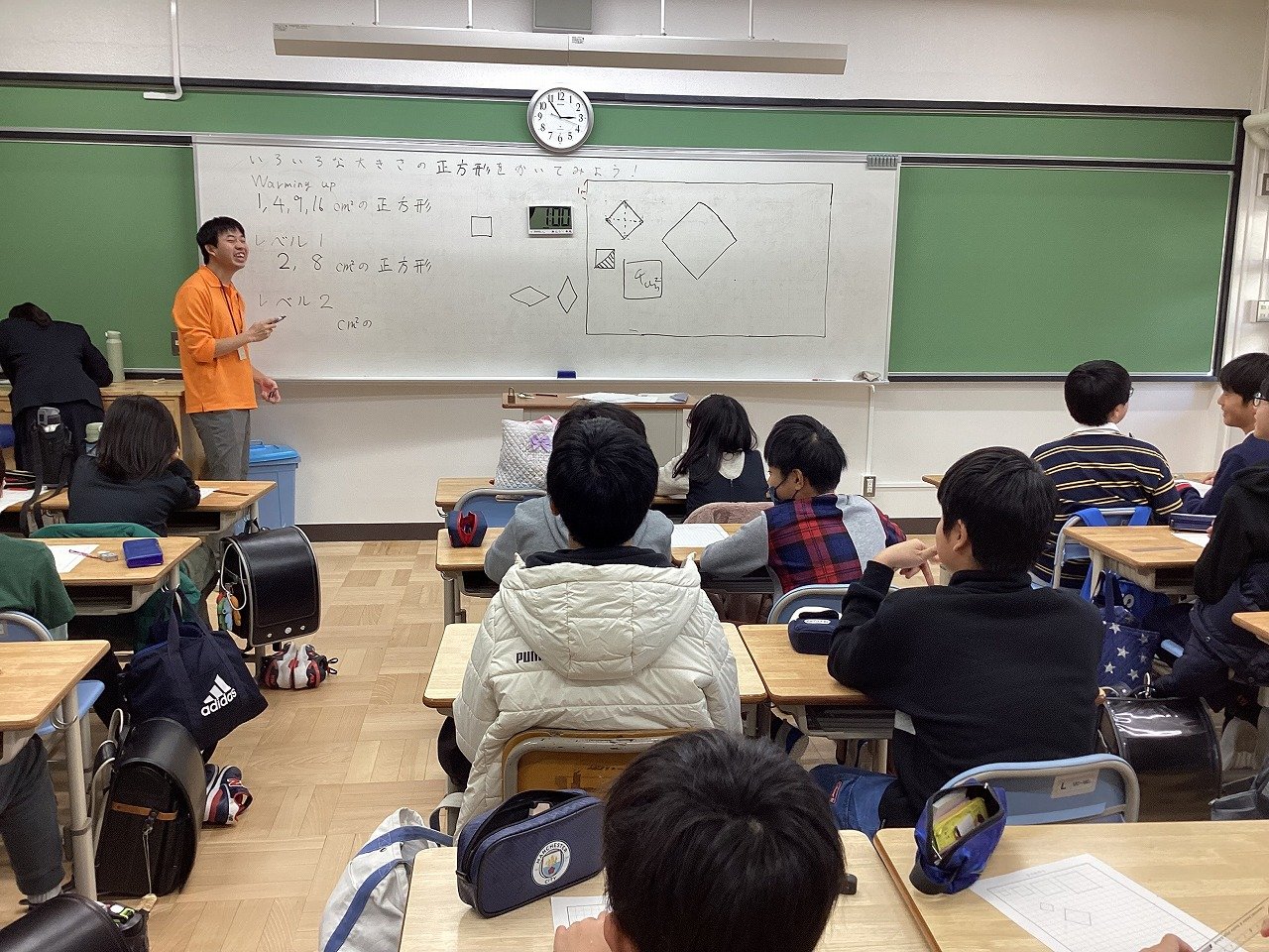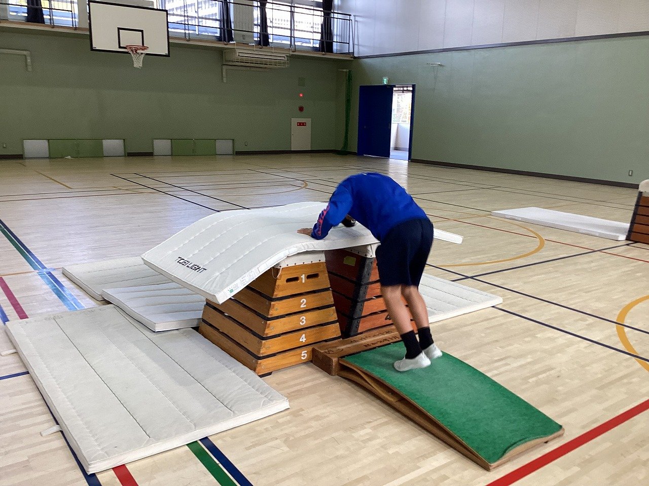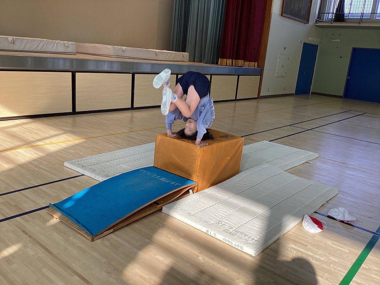 そこで、先生は、跳び箱を2セット並べ、その上と横にマットを置いたり、跳び箱ではなく、柔らかいオレンジボックスを使ったりするなど、子どもたちが不安なく、技に挑戦できるように場の用意をしていました。