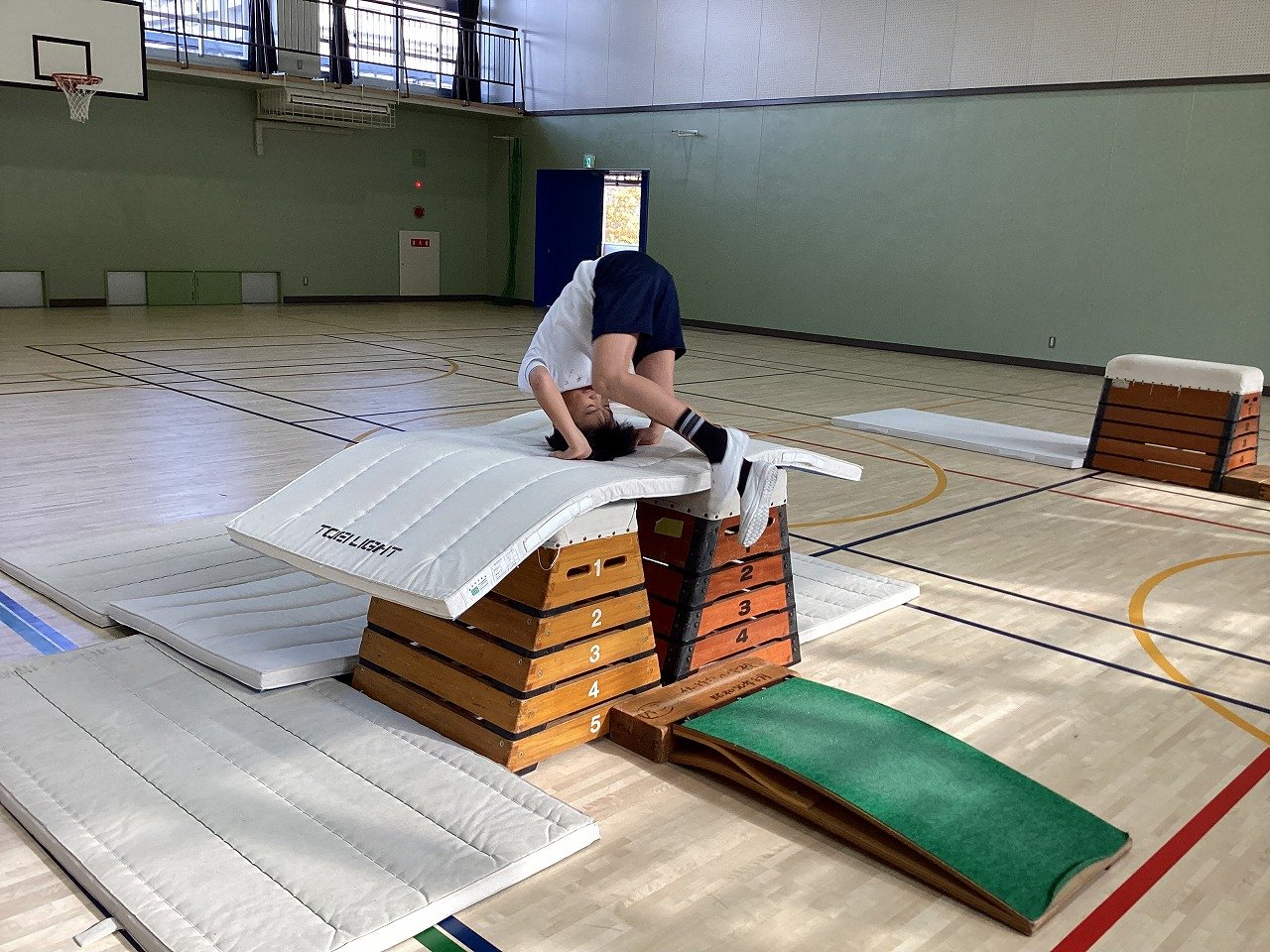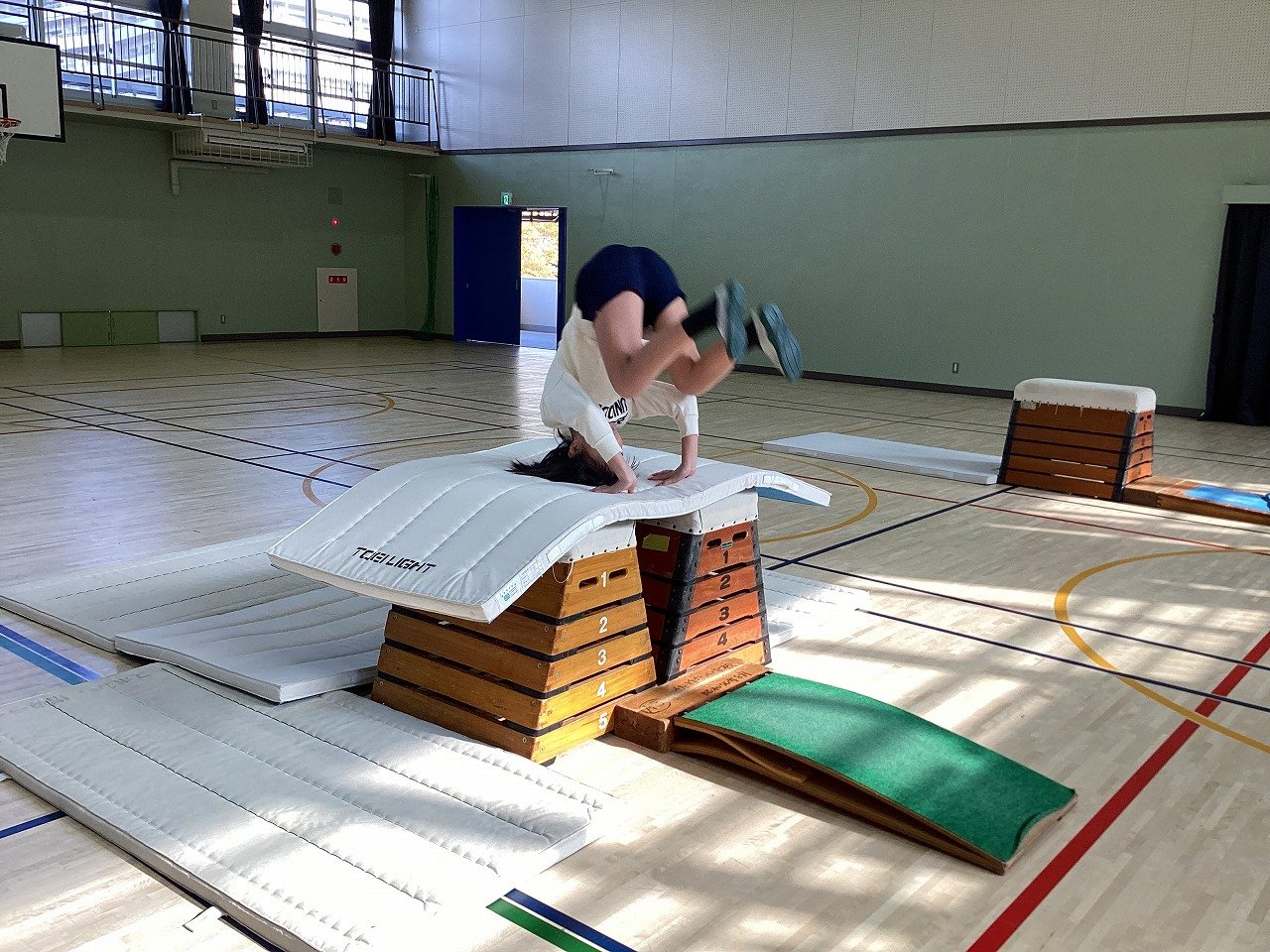 細長い跳び箱の1段目の上で前転することは、とても不安で、恐怖心もあります。