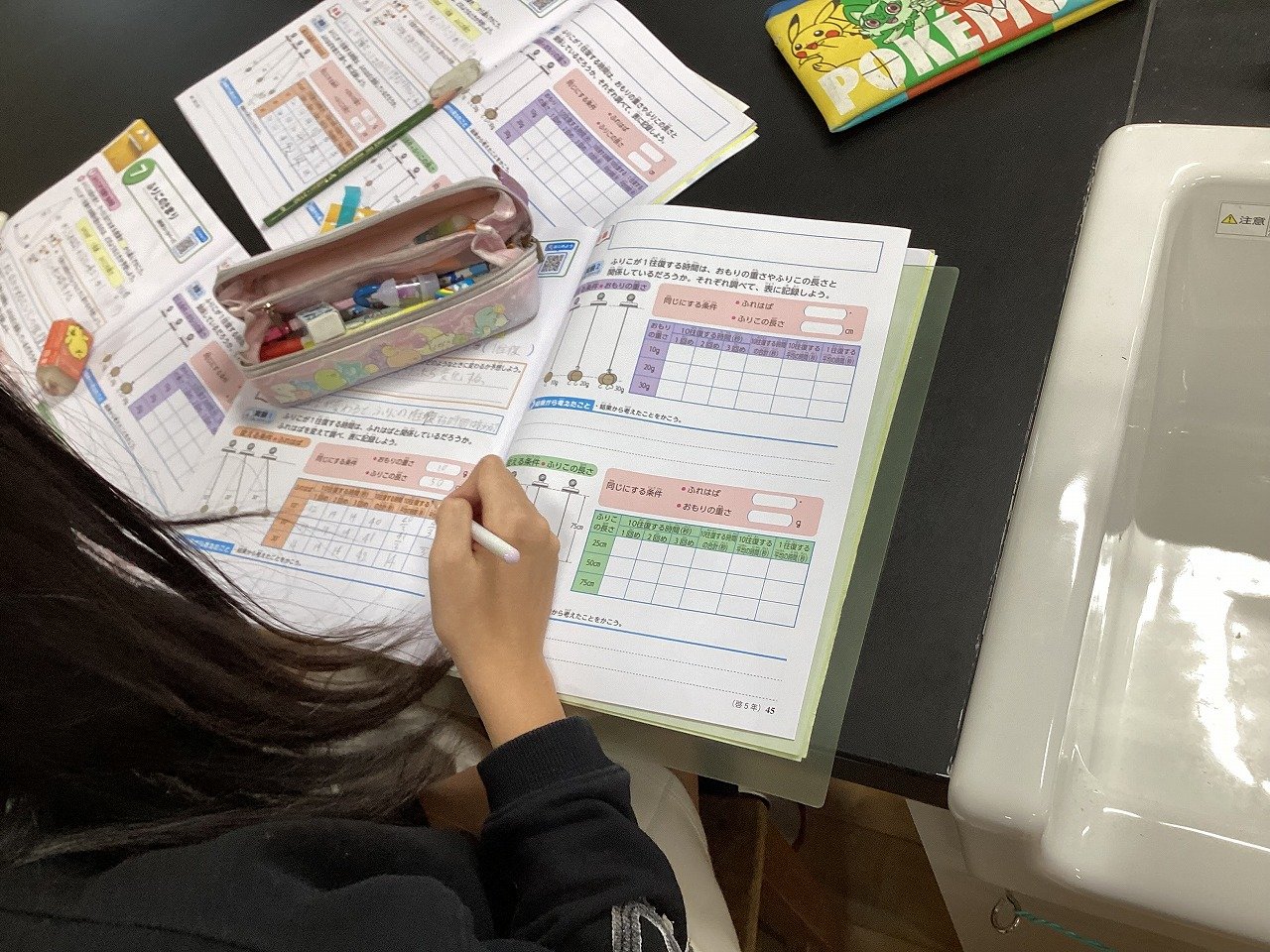 グループに配られた色水を1L用のマスに移し替えて、どれだけ入っているかを調べていました。 各グループで、1Lマスに移し替えた色水をタブレットで写真を撮り、そこに文字を書き込み、ミライシードのオクリンクに提出していきます。