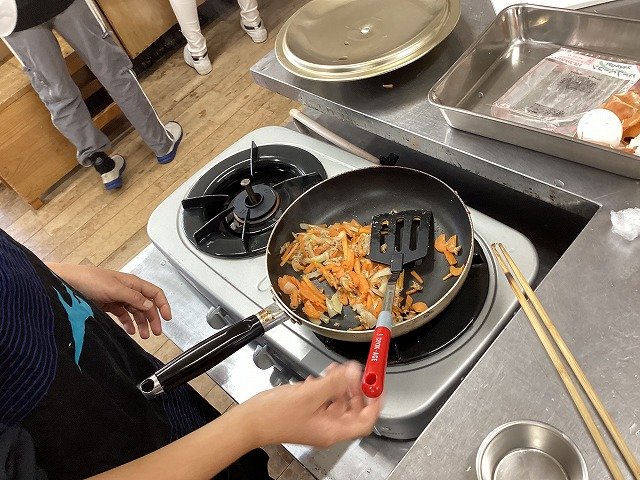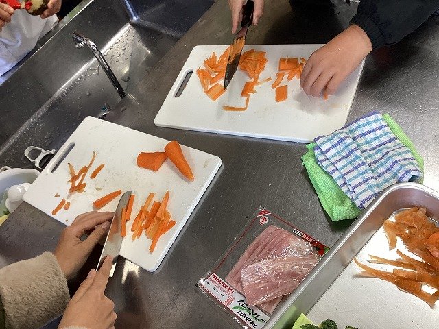 「千切りって、どうするの?」「長細く切るねん」「うす切りは、どれくらいの厚さ?」慣れない包丁を慎重に使いながら、材料を切っていました。