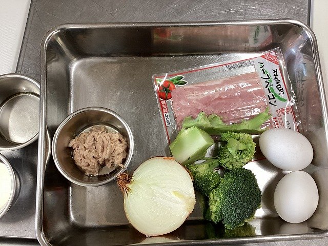 にんじんのレモン風味・だし巻き卵・ウインナーのケチャップいため・ベーコンポテトの4種類のおかずをグループで協力しながら作りました。