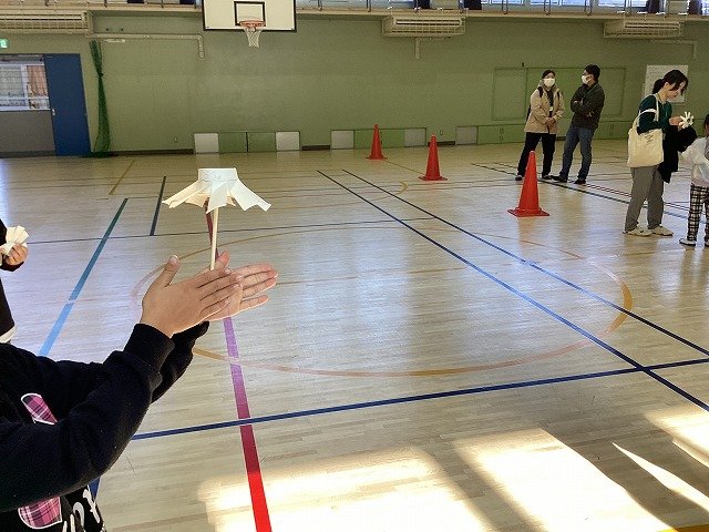 まずは、紙コップをはさみで切り、はねになる部分を折り込んでいきます。これが、少し難しく、手が止まっていた子どもたちもいました。