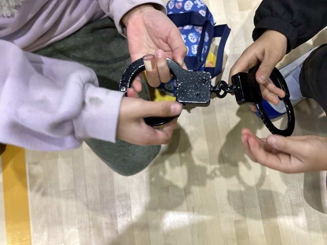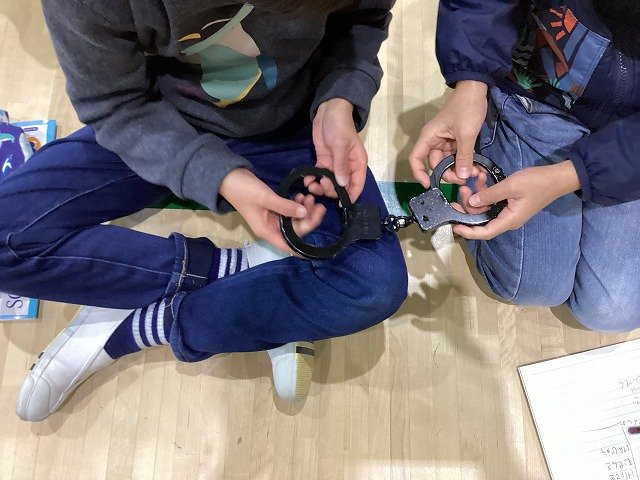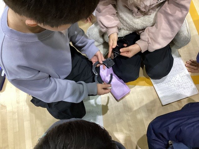 また、警察の方から1日の仕事や訓練の内容などのことを教えていただき、警棒や手錠、警察手帳を実際に手に取らせていただきました。