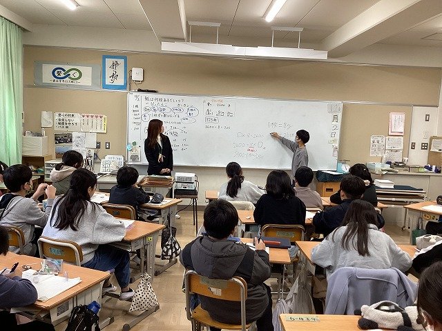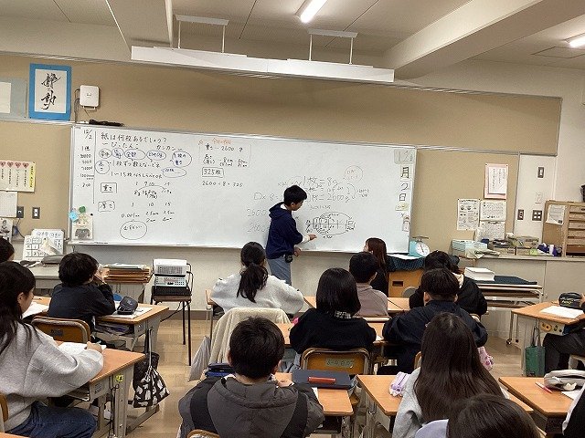 2600÷8と立式できた人は多かったのですが、なぜその式になるのか、理解できていない人もいました。すると3人の人が前に出て、分かりやすく説明してくれました。そして、比例を使えば、およその紙の数が求められることをみんなで確認しました。
