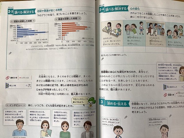 「では、その月経や精通はいつごろから始まるのでしょうか」「教科書に載っているように女子の初経を経験した時期は12才が一番多く、男子の精通を経験した時期は14才が一番多いですね」「だから、すでに始まっていたり、これから始まる体の変化は、大人の体になるための準備であり、自然なことなので、安心してくださいね」
