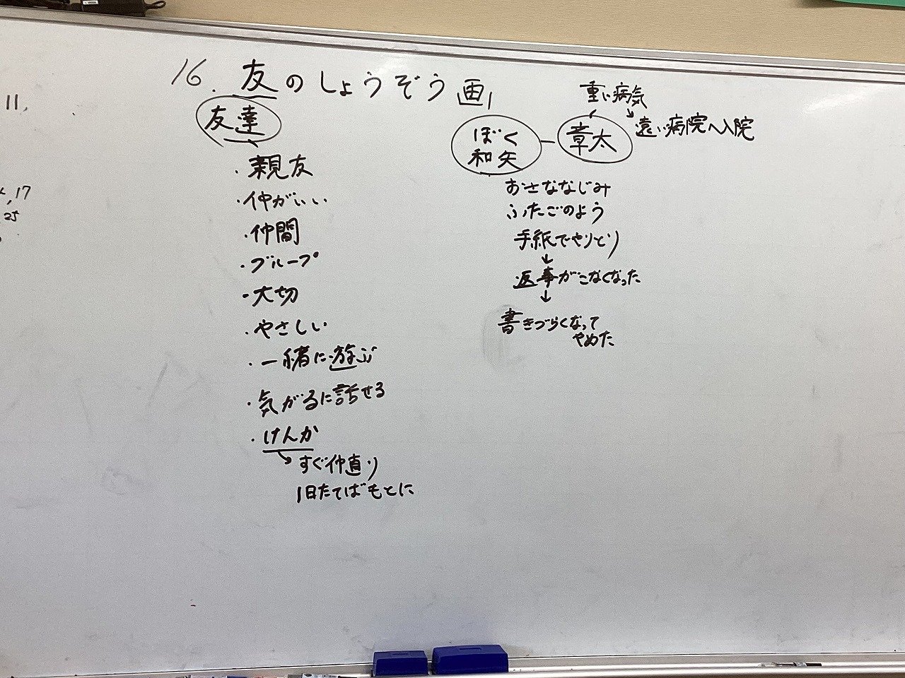 【子どもの振り返りより】 友だちを思うことは、どんな状況でも支え合うことが、ちゃんとした友だちかなぁと思った。友だちはずっとそばにいてくれる優しい子っていうイメージがあったから、二人の手紙のやりとりしていた内容が、面白かったことだったり、近所のことばっかりだったから章太を思う気持ちはあんまりこもっていなかったと思う。そこで、ぼくの肖像画を章太が描いてくれたから、その章太が昔のように遊びたいという思いをのせて描いた肖像画が章太が頑張って描いたという思いがあったから感動した。友だちは、相手を支え合うことがちゃんとした友だちと言えるかなと思った。