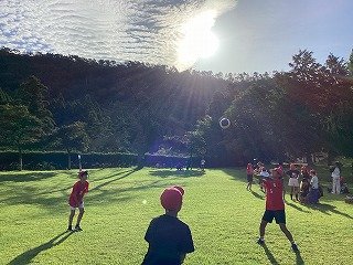 2日目の朝は、すがすがしい気持ちの良い天候でした。朝の集いでは フリスビー、大縄、モルク、ボール遊び、おにごっこ、虫取りなど身体を動かして目を覚まさせました。