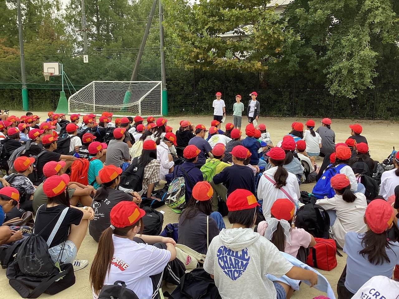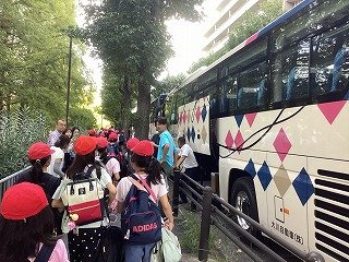 出発式で「今回の林間宿泊学習のテーマはオープンハートです。心を開いて、誰とでも協力し合い、楽しく過ごしましょう」と係の子どもたちが話してくれました。