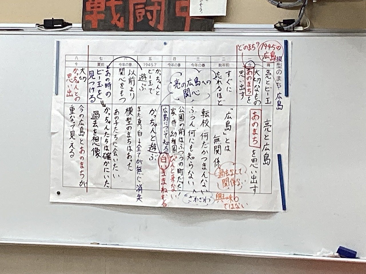 その後、主人公の広島に対する変容を自分自身に重ね、「自分が亮のように変容するために大切なことは何か」を考えていました。「戦争に関わる学習を事前にする」「資料から当時の人々のことを想像する」「現地の人の話を聞く」「自分の頭で考える」など自分事として考えていました。