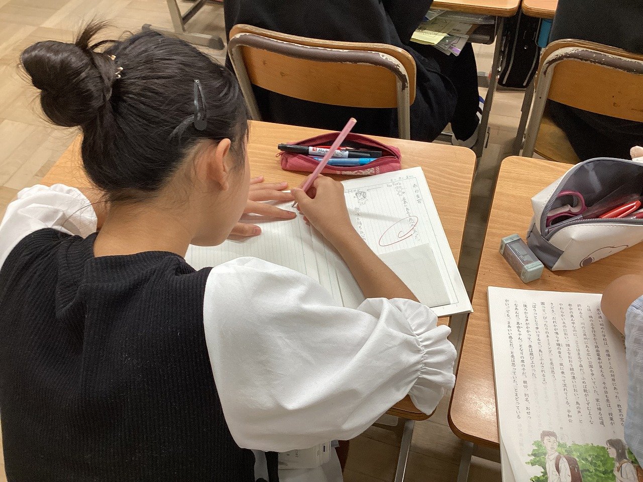 そんな時「色がついた」と一人の児童がつぶやくと、「どんなところから、色がついたのかな?」と先生が尋ね、「セミの鳴き声や鐘の音」「境内は暑く」「かたをくむ」など、目や耳、肌で感じることで色がついたと一気に児童は物語に没入していきました。
