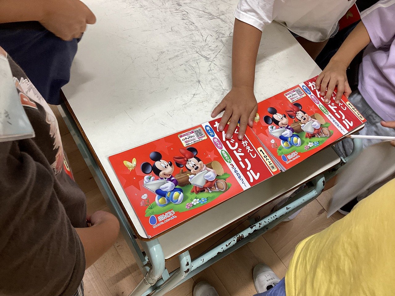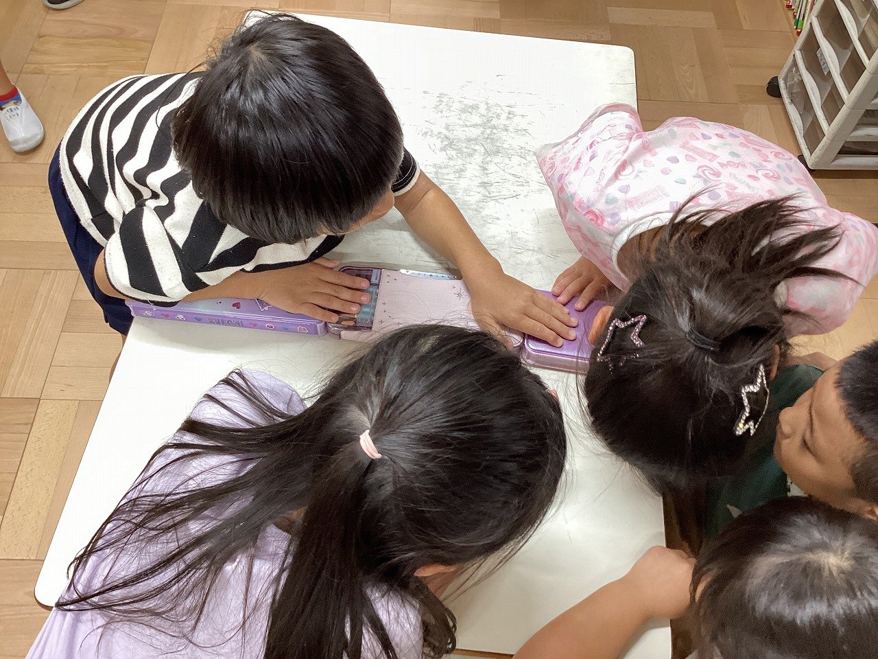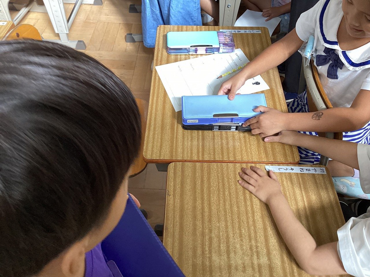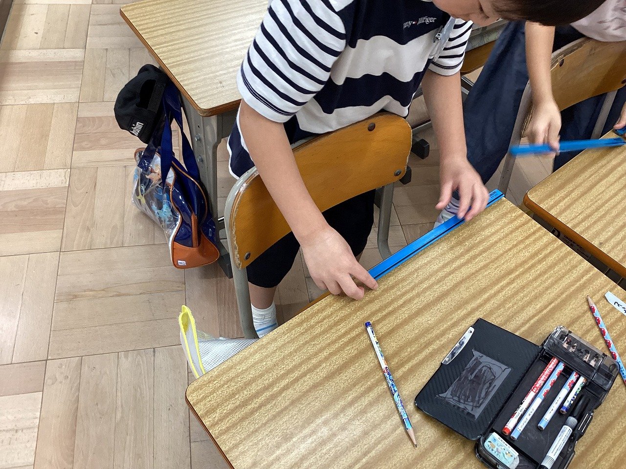 みゃくみゃく君からの挑戦状が届くと、子どもたちは大興奮していました。これまで直接並べたり、折り曲げたり、重ねたりして比べていましたが、今日はどれもできそうにない様子。子どもたちは、身の周りにある、ふでばこ、マイネーム、漢字ドリル、棒磁石などを使い、班の人と協力しながら、長さくらべをしていました。