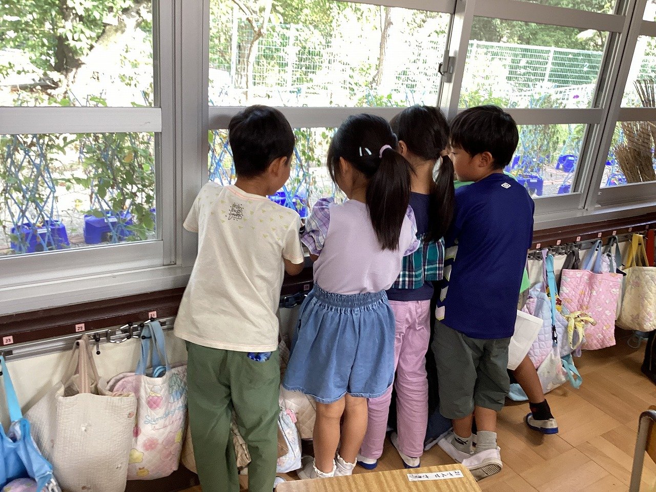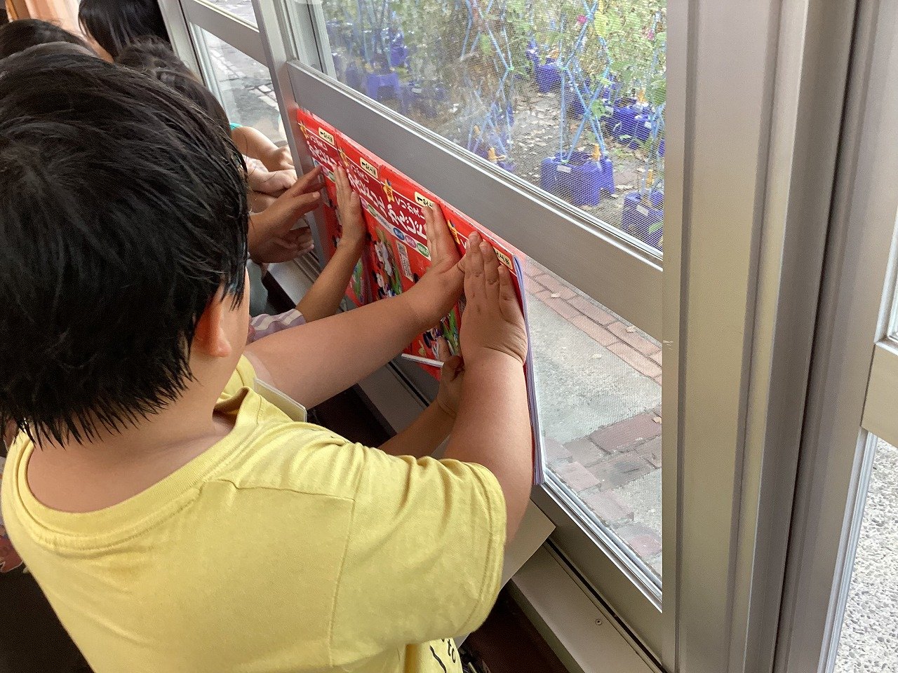 「まどは漢字ドリルが3つ分と少し、つくえは2つ分と少し、給食台も2つ分と少し・・・」比べるために使うものは違っていましたが、窓ガラスの横の長さが一番長いことは共有できました。
