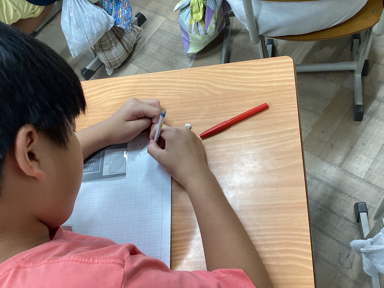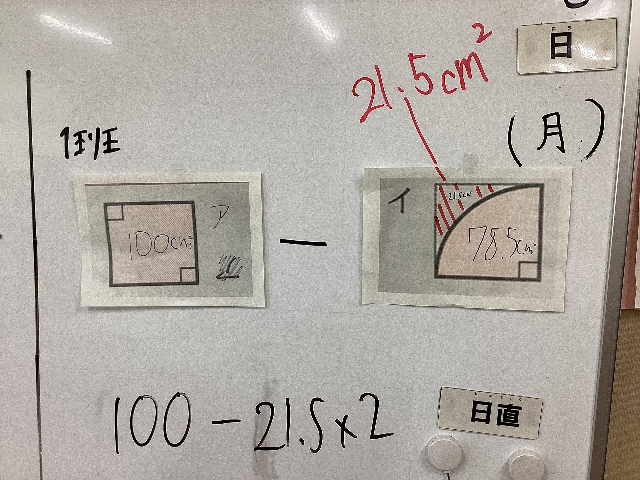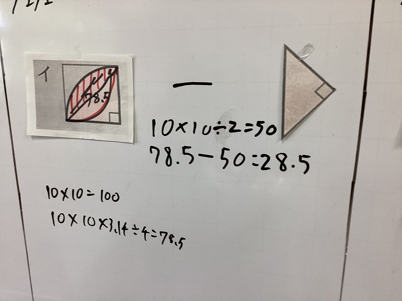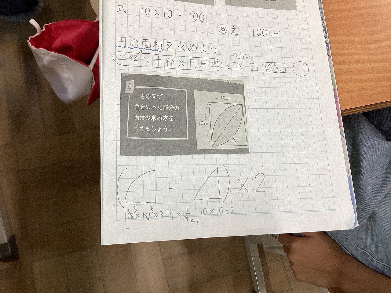 手が止まっている人がいたので、「三角形や扇形、正方形の面積も使えるかも」と先生がヒントを出してくれました。