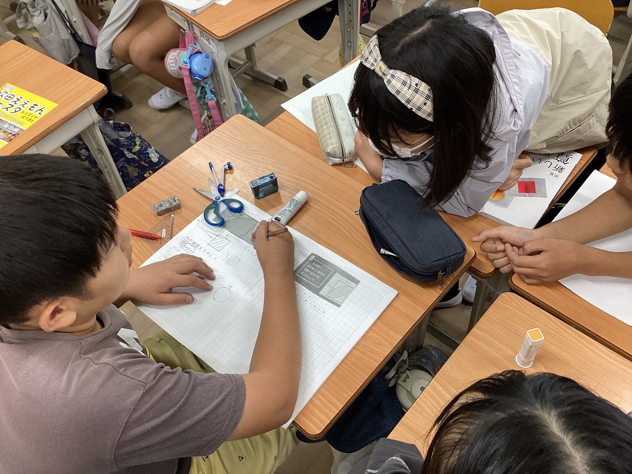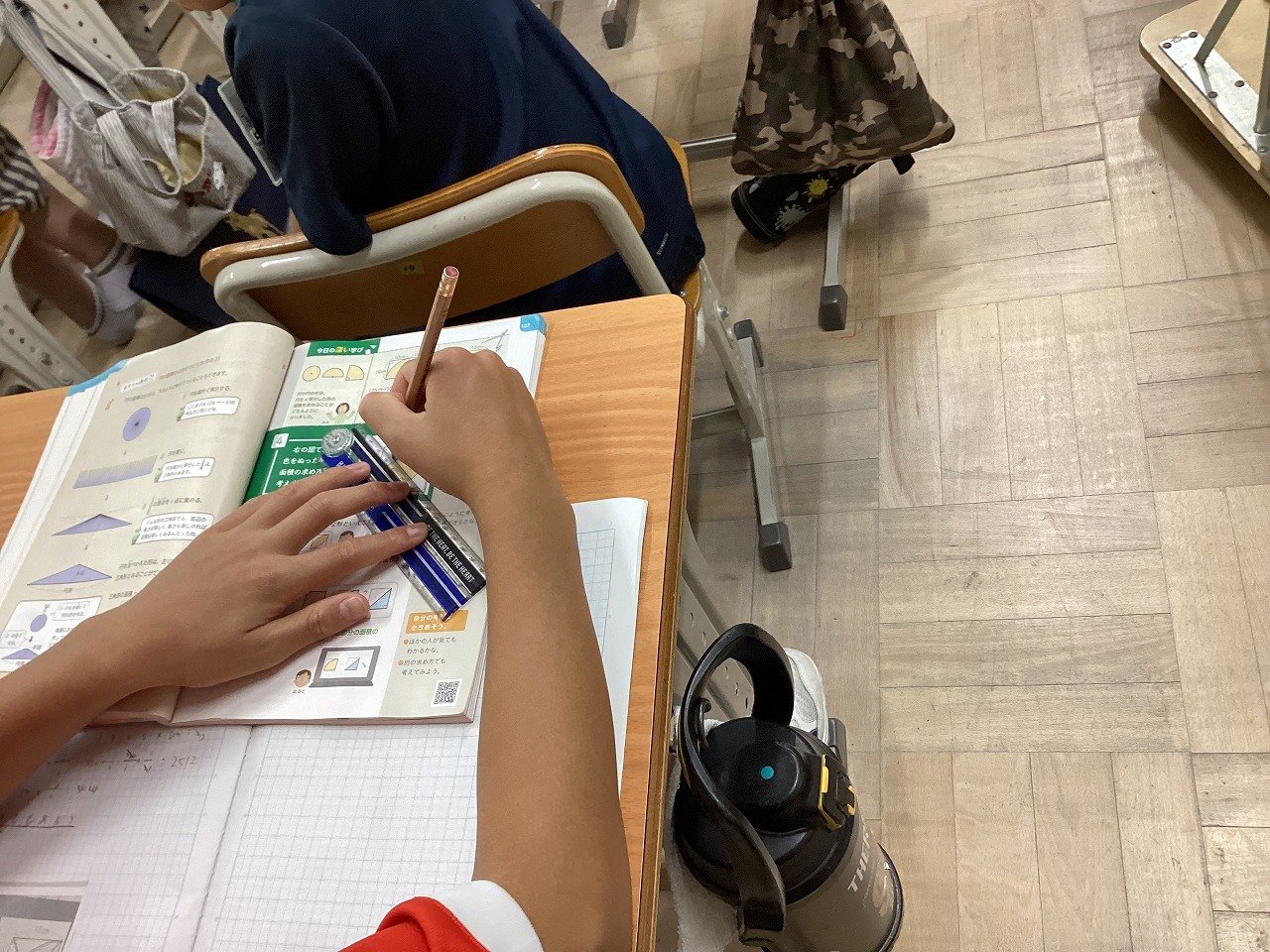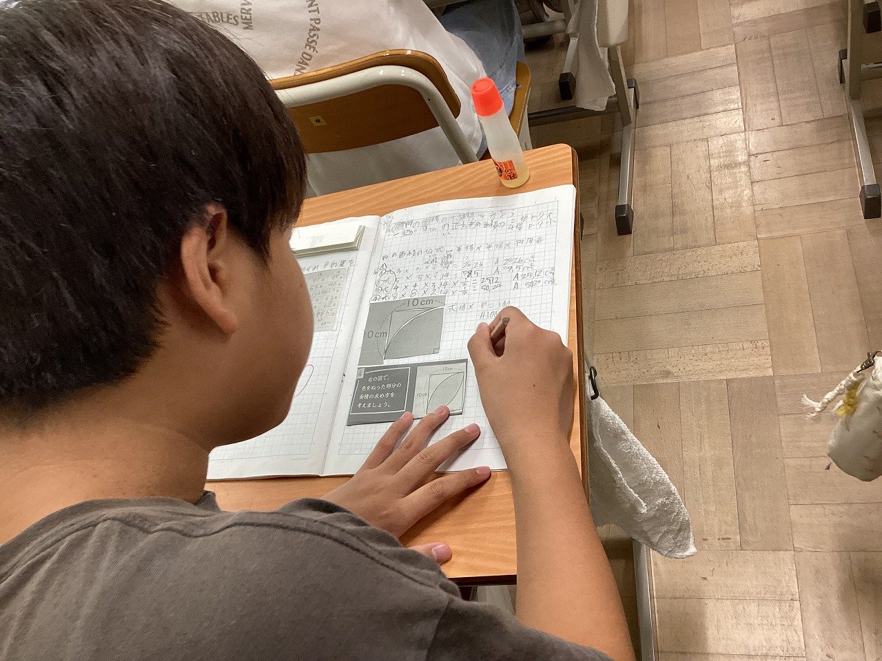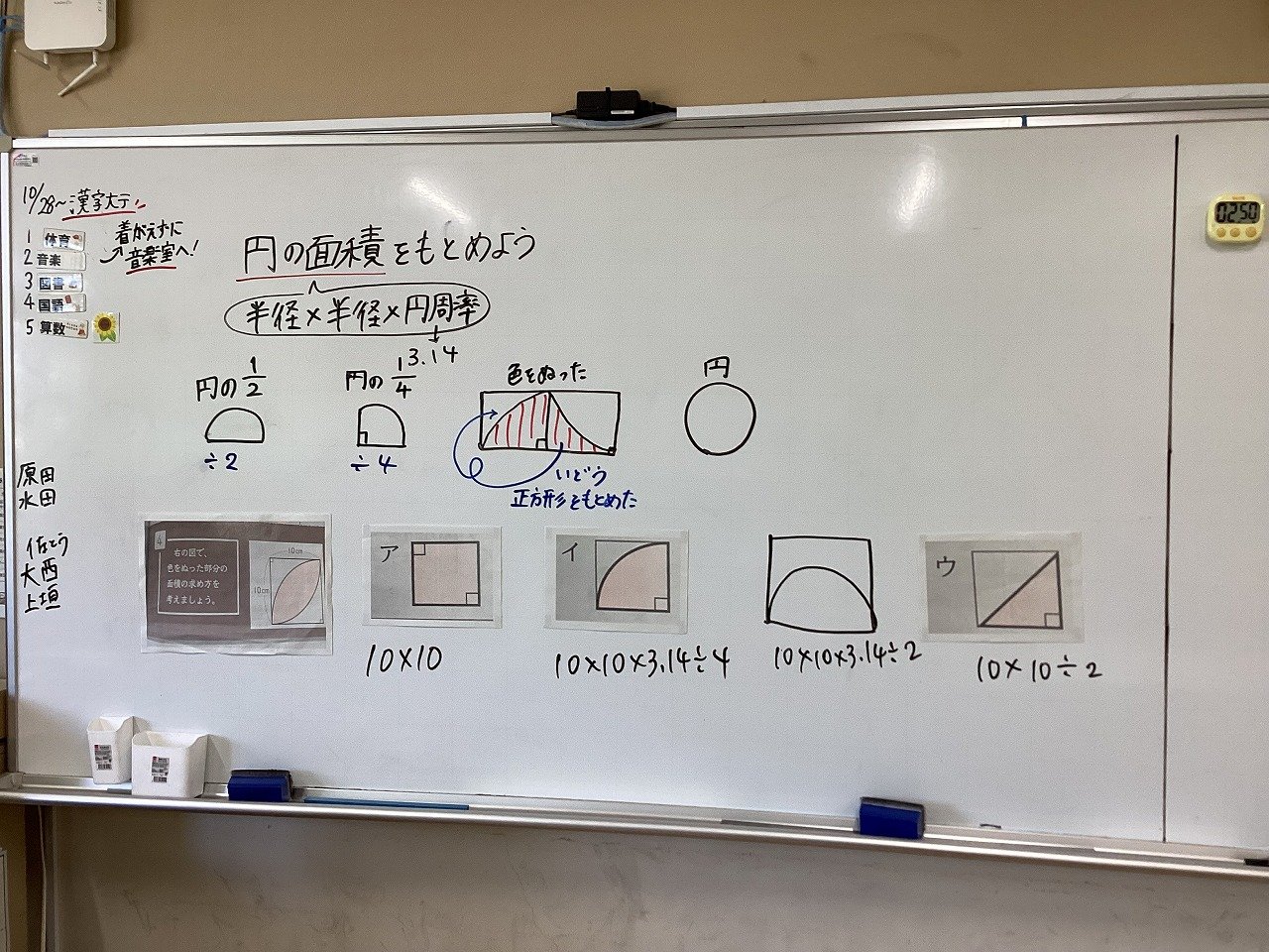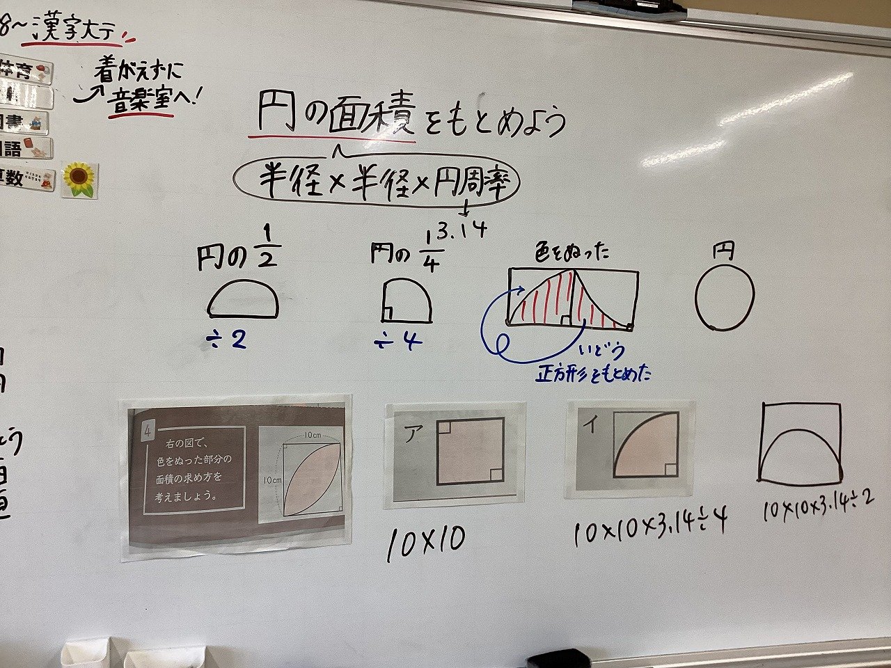 手が止まっている人がいたので、「三角形や扇形、正方形の面積も使えるかも」と先生がヒントを出してくれました。