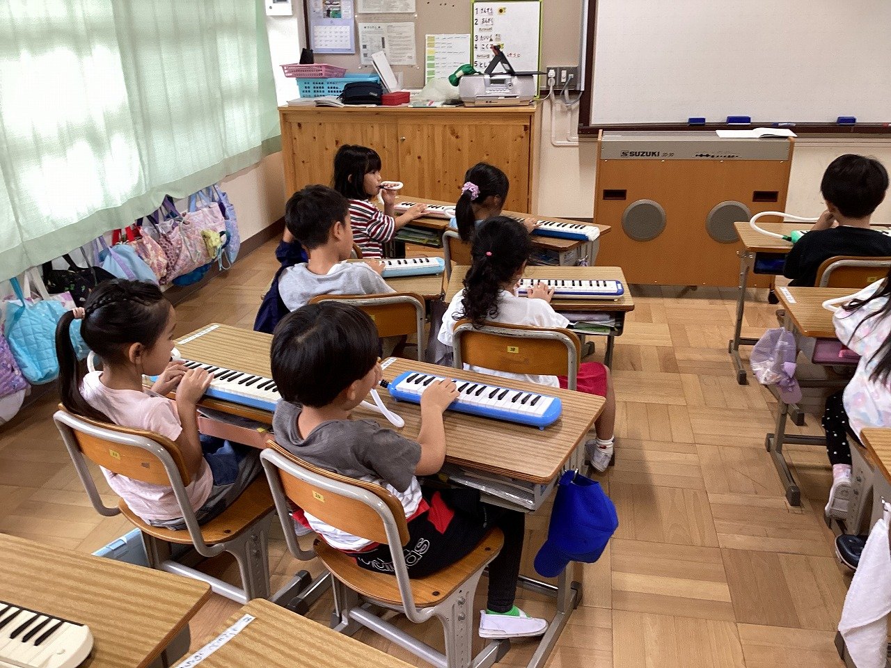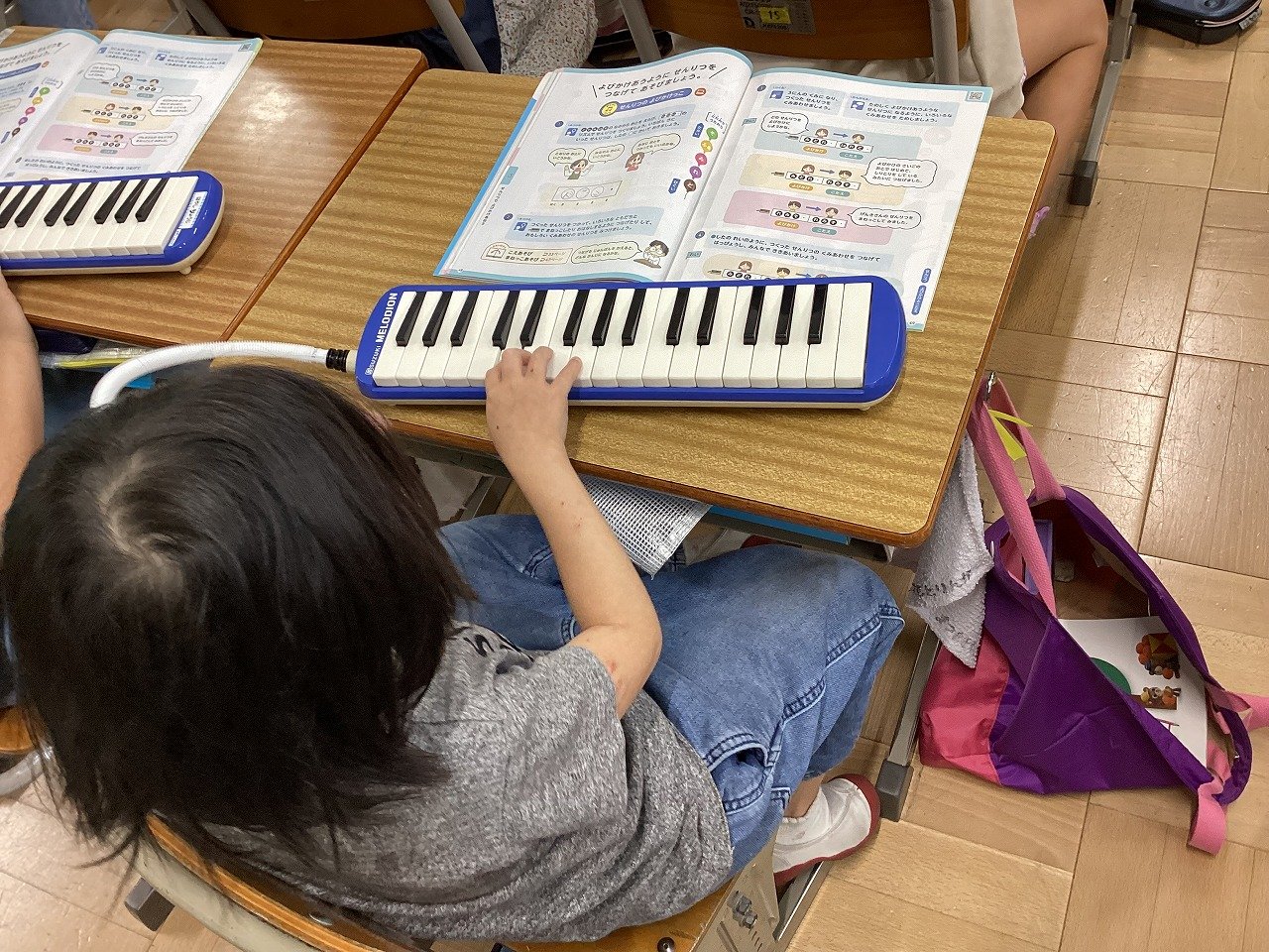 「鍵盤ハーモニカの1音リレーをします」先生が言うと、「やったー」「きろくこうしんや」「よっしゃ~」子どもたちは気合をいれていました。席替えしたこともあり、1回目はうまくリレーができませんでしたが、2回目は20秒76と新記録を更新し、子どもたちは大喜びでした。