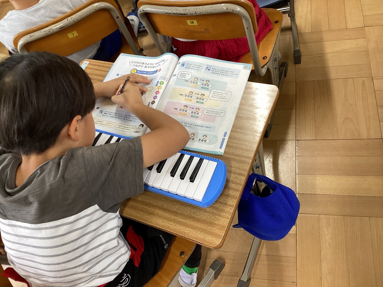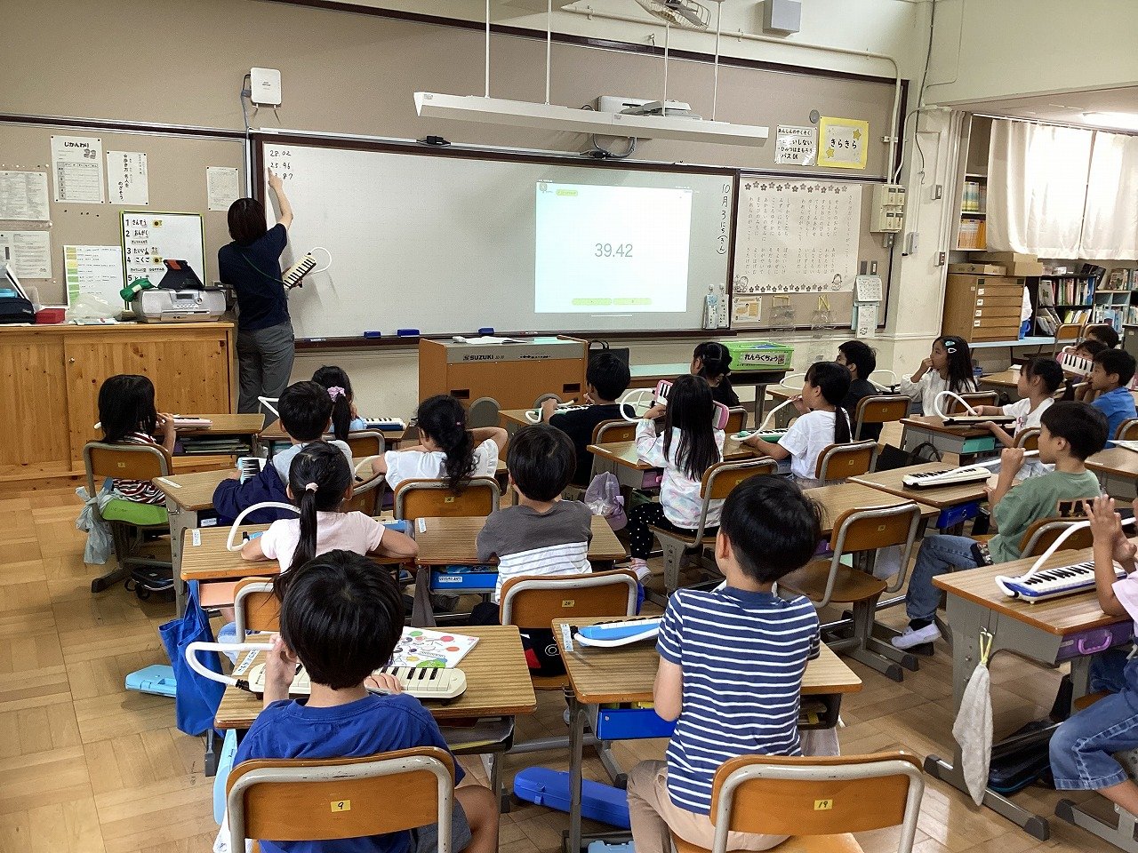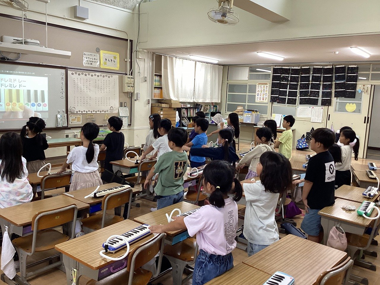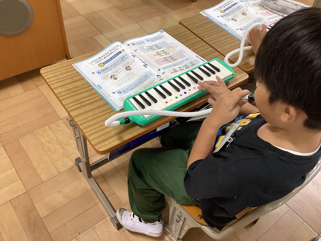 「今日はドからソまでの5音のうち、3音を使った旋律をつなげていきましょう!」と先生がめあてを伝え、子どもたちは、自分で決めた旋律を鍵盤ハーモニカで一人ずつ演奏し、リレー形式でつないでいきました。