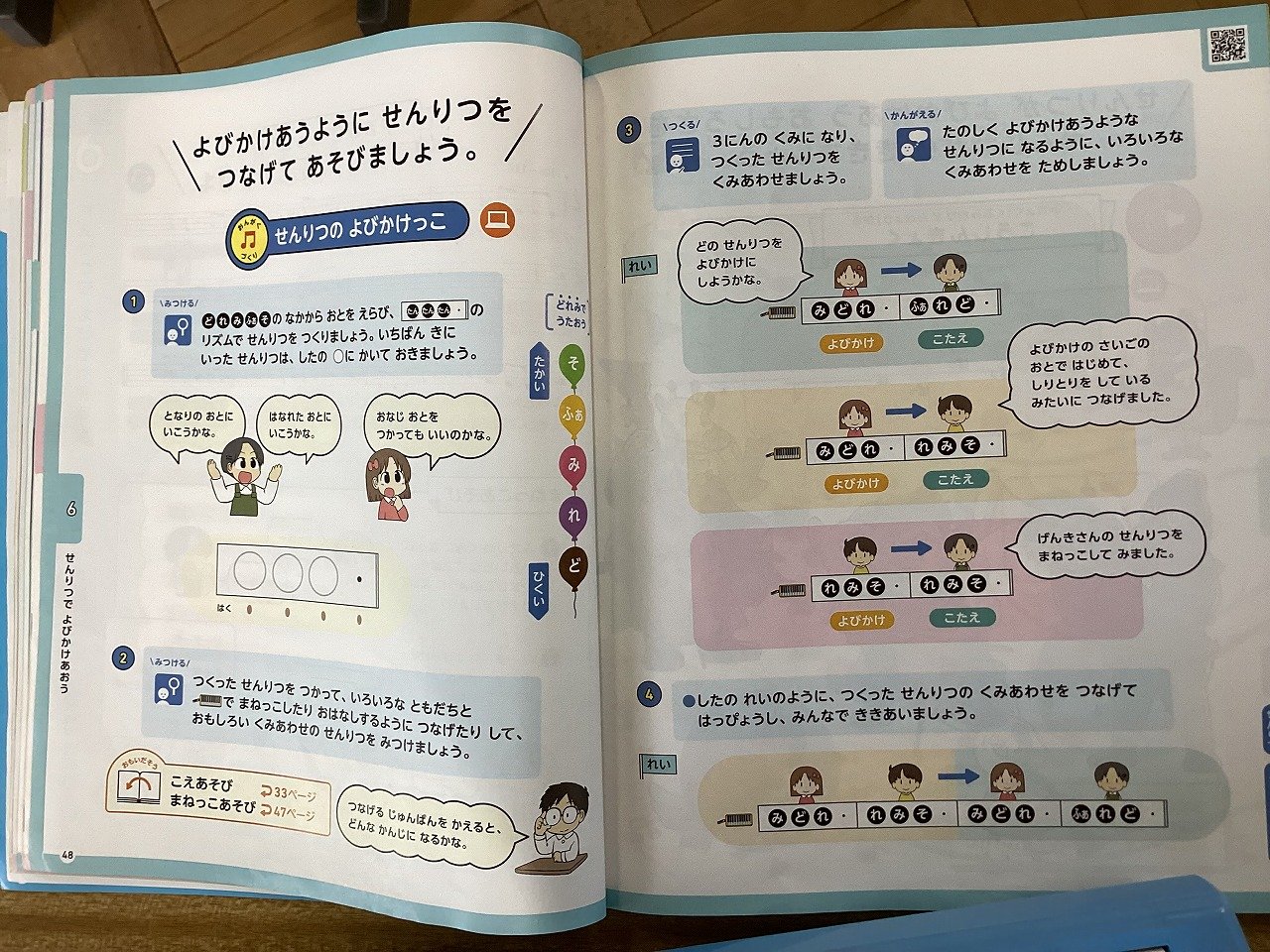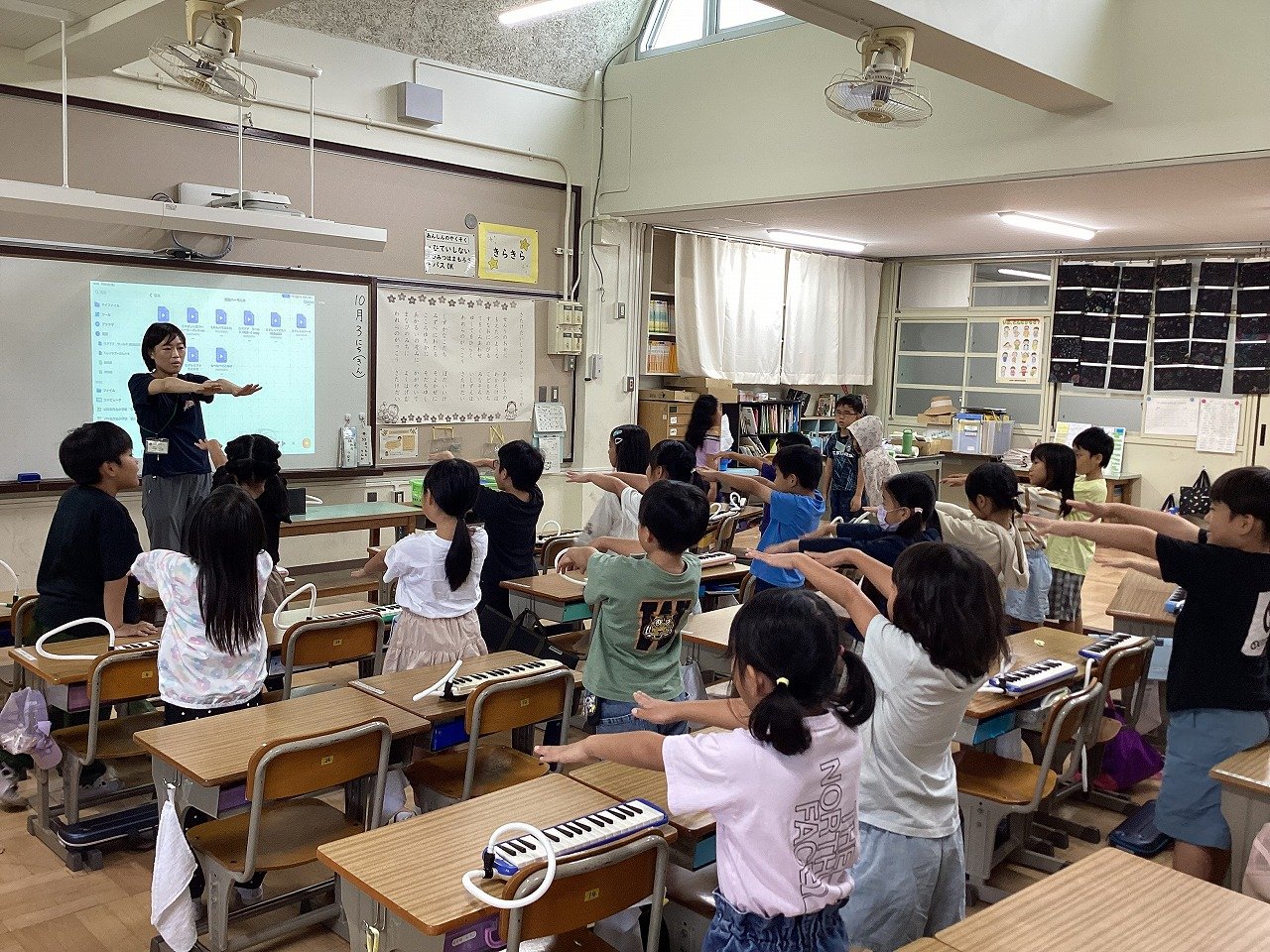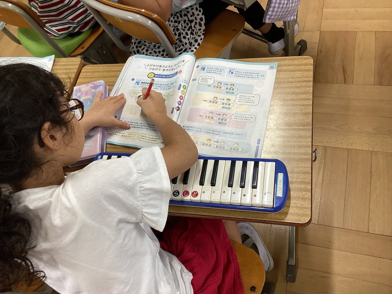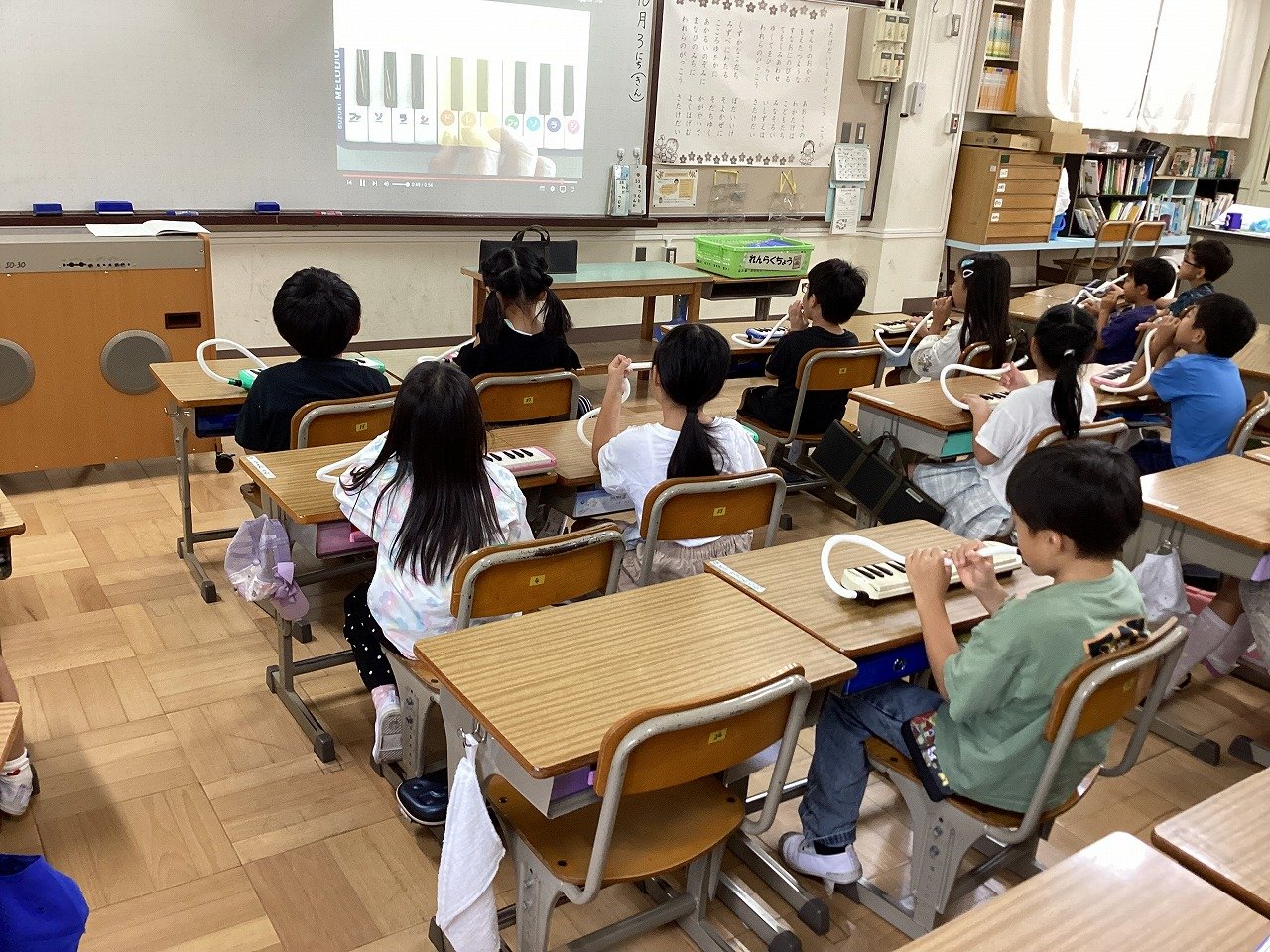 「今日はドからソまでの5音のうち、3音を使った旋律をつなげていきましょう!」と先生がめあてを伝え、子どもたちは、自分で決めた旋律を鍵盤ハーモニカで一人ずつ演奏し、リレー形式でつないでいきました。